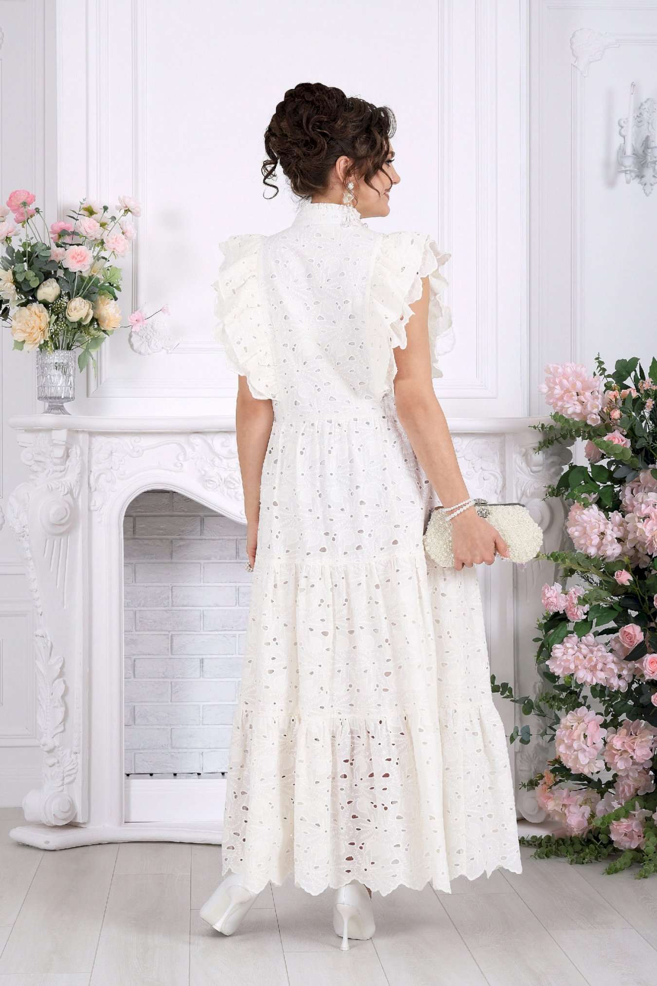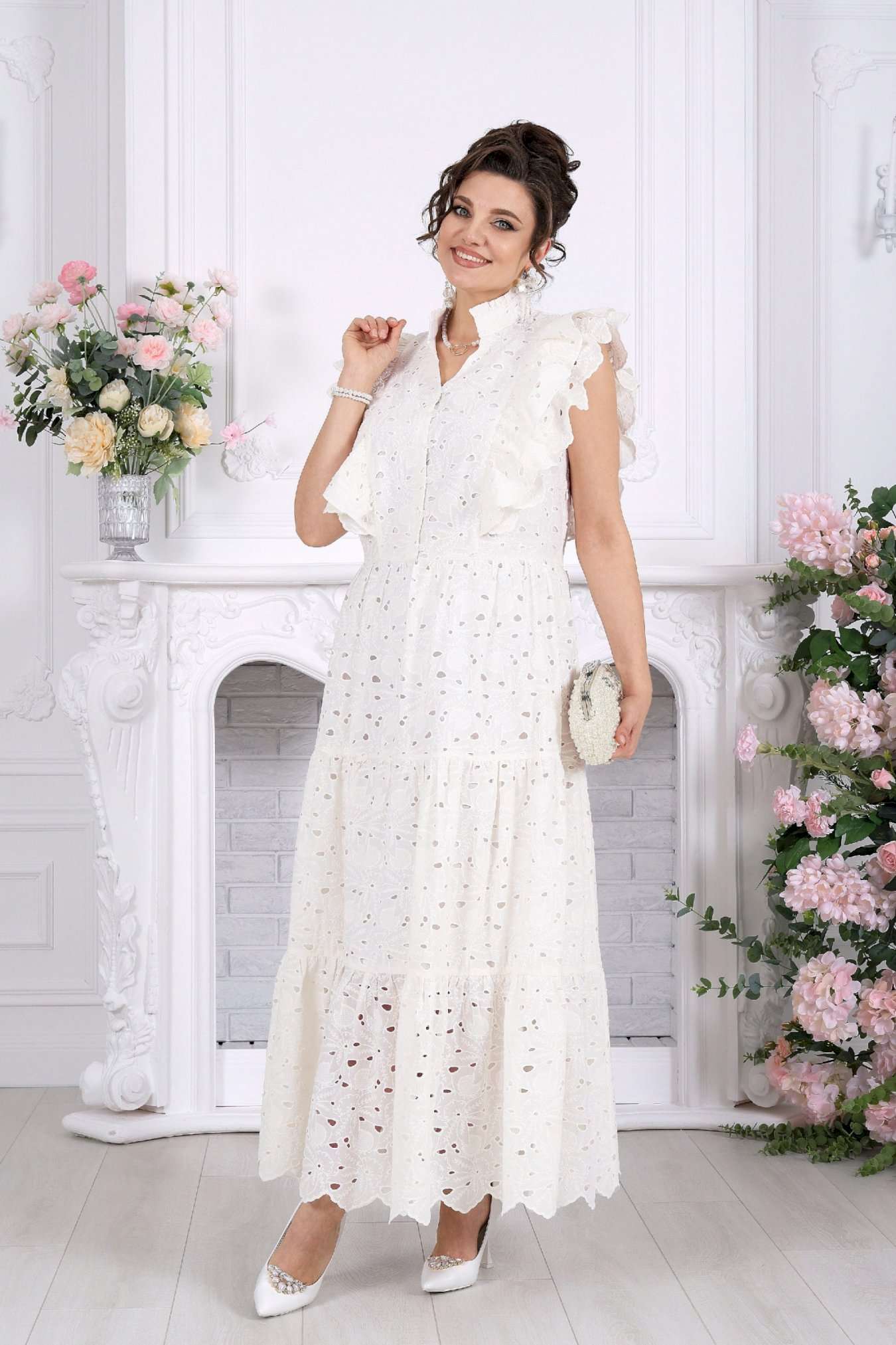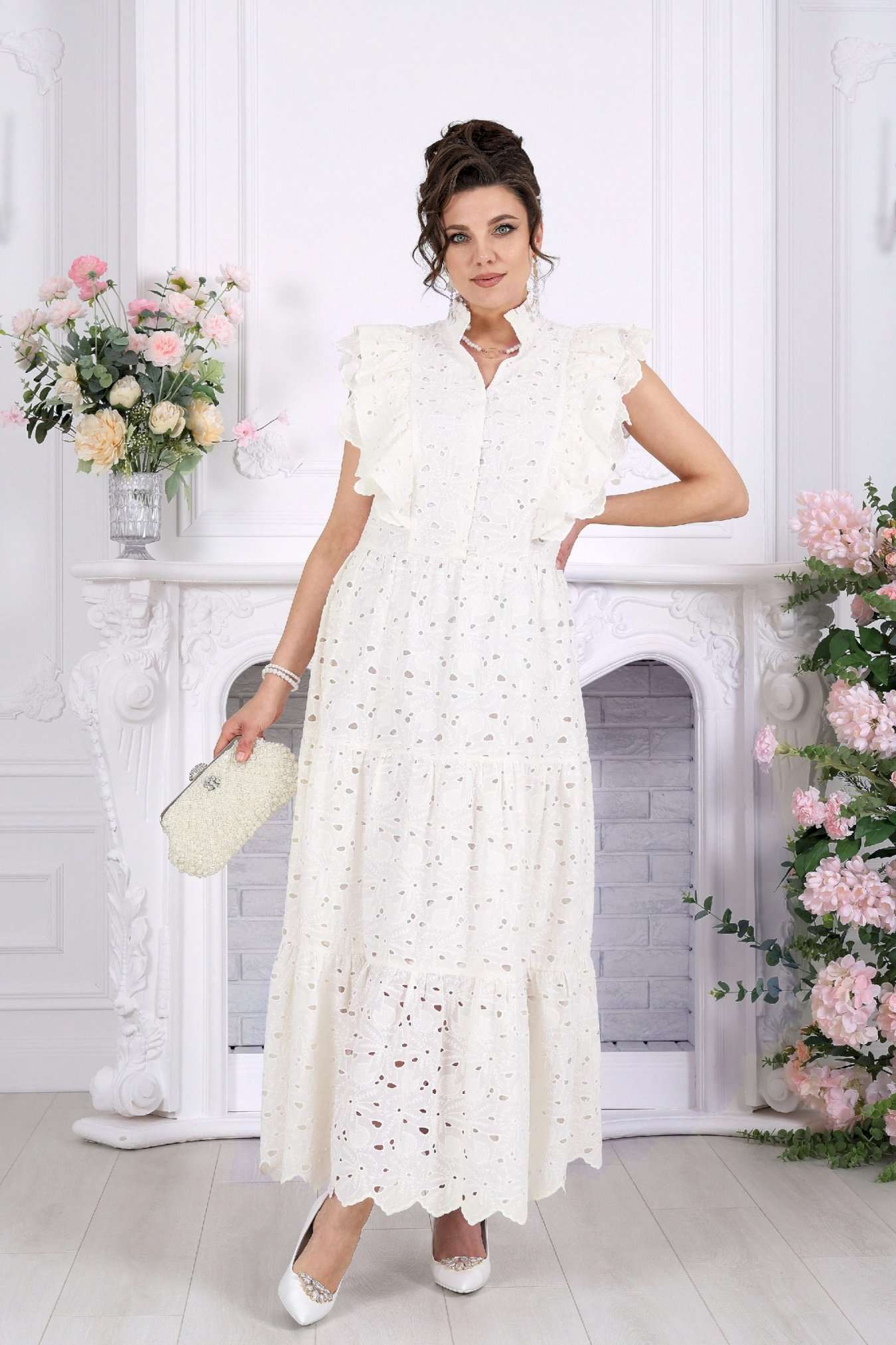 Платье, в котором вы — главное украшение вечера. Это не просто платье — это готовый праздничный образ. Эффектное хлопковое «ришелье» с ажурным рисунком создаёт ощущение лёгкости и торжественности, словно вы уже на особом событии, где каждый взгляд прикован к вам. Изысканные воланы, утончённые линии и фактура ткани делают модель по-настоящему нарядной. Оно не требует сложных сочетаний — достаточно добавить украшения, и вы готовы к любому празднику. Хлопковое «ришелье» — это всегда про статус и эстетику. Ажурный рисунок добавляет глубины образу, а натуральная подкладка обеспечивает комфорт даже на длительных мероприятиях. Платье женское из хлопка «ришелье», отрезное по линии талии, с лифом прилегающего силуэта и юбкой. Модель на х/б подкладке, без рукавов и плечевых накладок. Спинка и полочка с рельефными швами, направленными от пройм до талии, вставленными в них двумя воланами, присборенными по всей длине. Нижний волан широкий с фестоном по краю, верхний волан с обработанным краем. Горловина платья с V-образным вырезом по переду, оформлена воротником стойкой с присборенной рюшей по верхнему срезу воротника. По полочке оформлена центральная застёжка на 6 навесных петель и 6 пуговиц. В левом боковом шве застёжка на потайную тесьму-«молнию» (35 см). Юбка платья свободного кроя состоит из трёх присборенных воланов, по краю нижнего волана фестон. Длина платья по среднему шву спинки - см; длина платья по среднему шву спинки (от талии) – 139 см (50-58 р-р).