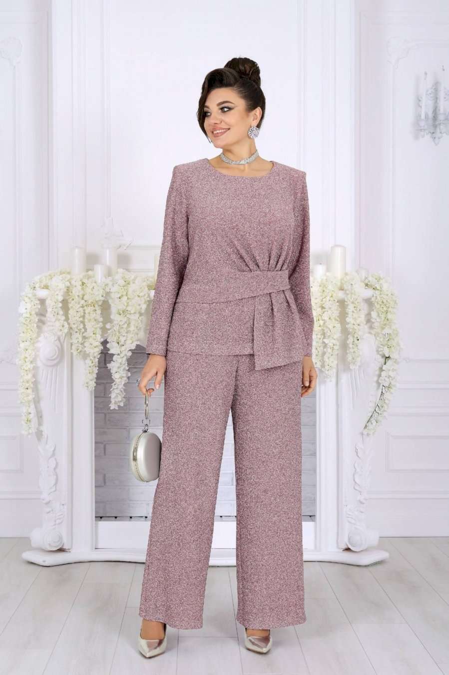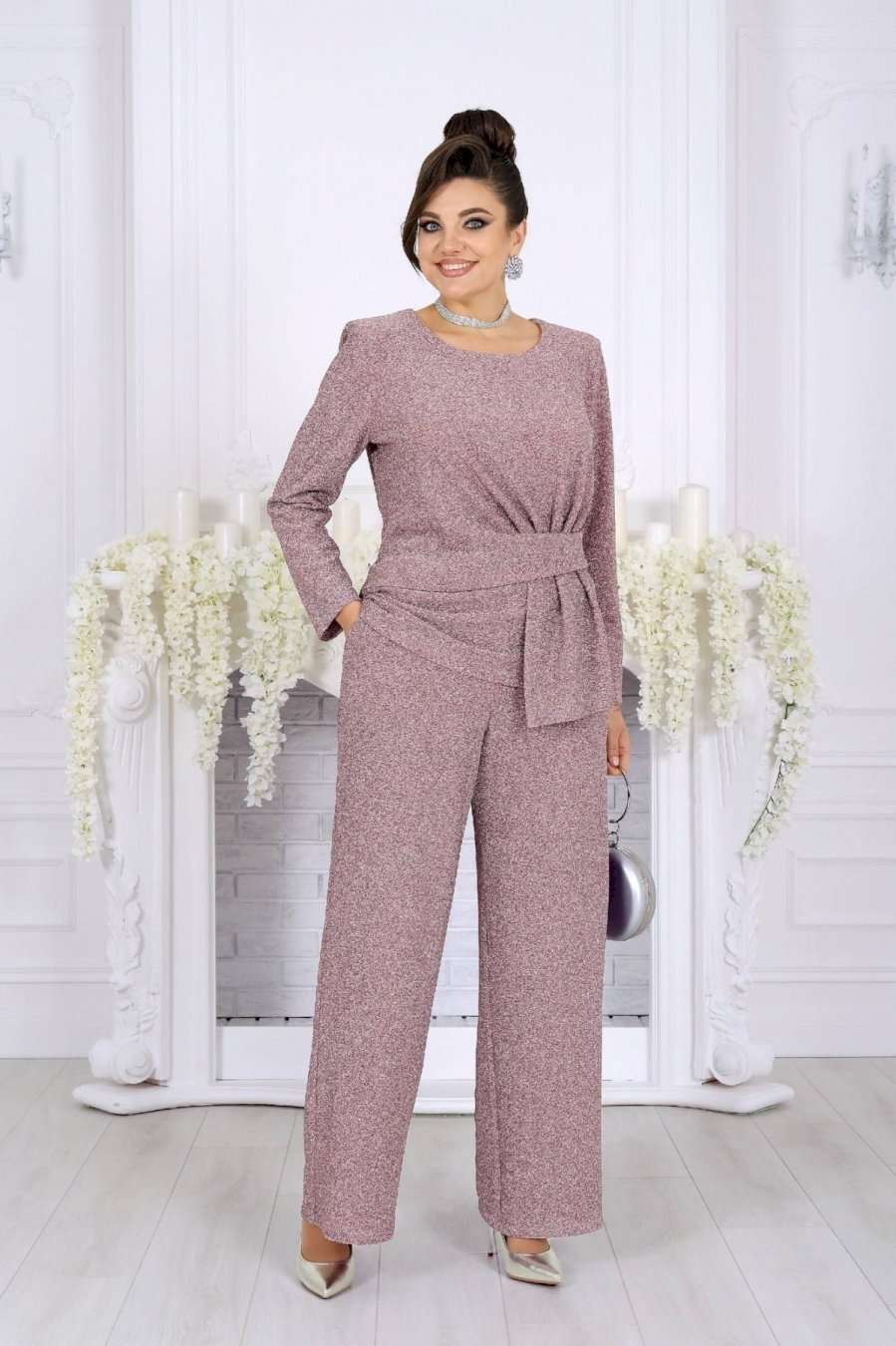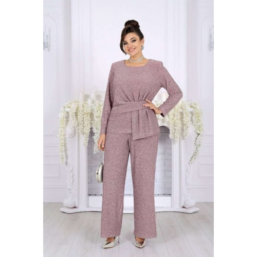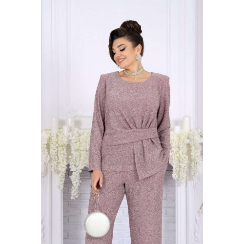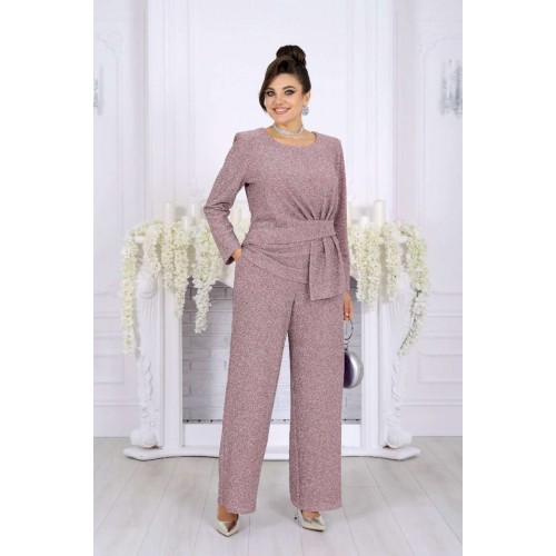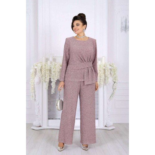 Это не просто наряд — это ваша уверенность, статус и блеск, который будет сопровождать каждый ваш шаг. В этом костюме каждая деталь продумана так, чтобы создавать ощущение безупречного стиля и лёгкой роскоши. Мягкое мерцание люрекса делает образ выразительным и дорогим, а утончённый крой подчёркивает женственность и гармонию силуэта. Блузка с асимметричной деталью по линии талии — это модный акцент, который визуально формирует стройный силуэт и придаёт образу дизайнерскую изысканность. Нежная линия декольте в обрамлении округлой горловины элегантно подчёркивает женственность. Брюки прямого силуэта с комфортной посадкой — символ утончённой простоты и свободы. Эластичный пояс обеспечивает удобство, а мерцающая фактура ткани делает их достойным элементом вечернего гардероба. Такой костюм создан для особых случаев: новогодних вечеров, корпоратива, праздничного ужина или выхода в свет, но при этом он настолько универсален, что легко впишется и в деловой стиль. Комплект брючный 2-х предметный, состоящий из блузки и брюк. Блузка полуприлегающего силуэта, выполнена из трикотажного полотна с фактурной лицевой стороной «люрекс». Модель без подкладки, с плечевыми накладками. Спинка с талиевыми вытачками и средним швом. По линии талии в левой части переда – горизонтальный подрез с односторонними складками и отлетной деталью в шве. По линии талии в правой части переда обработан цельнокроеный пояс, край которого крепится в левом боковом шве. Горловина округлая, углубленная спереди. Рукав длинный, втачной. Длина блузки – 62 см. Длина рукава – 57 см. Брюки длинные, с посадкой на талии, выполнены из трикотажного полотна с фактурной лицевой стороной «люрекс». Модель без стрелок, без застежки. Спереди обработаны наклонные боковые карманы. Для лучшего прилегания по линии талии в притачном поясе предусмотрена эластичная лента, вставленная по всей длине. Длина брюк по боковому (с поясом) – 106 см (50-52 р-р), 107 см (54-58 р-р).