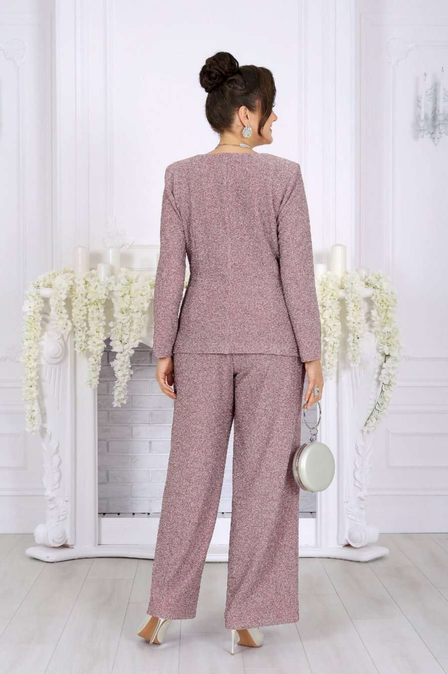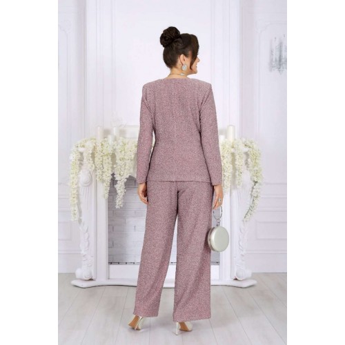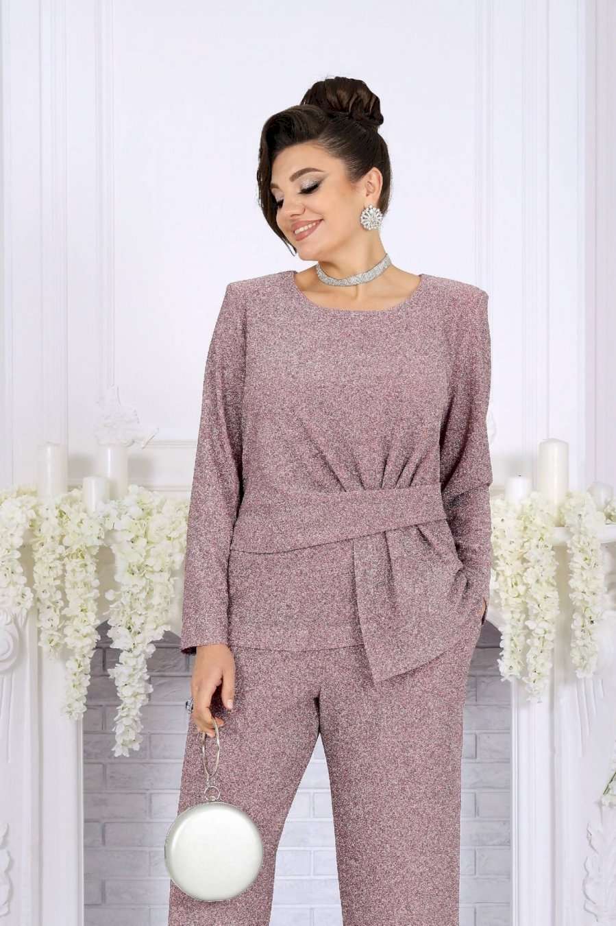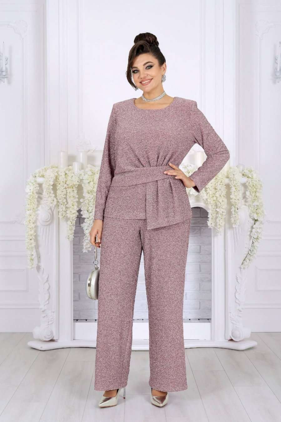 Это не просто наряд — это ваша уверенность, статус и блеск, который будет сопровождать каждый ваш шаг. В этом костюме каждая деталь продумана так, чтобы создавать ощущение безупречного стиля и лёгкой роскоши. Мягкое мерцание люрекса делает образ выразительным и дорогим, а утончённый крой подчёркивает женственность и гармонию силуэта. Блузка с асимметричной деталью по линии талии — это модный акцент, который визуально формирует стройный силуэт и придаёт образу дизайнерскую изысканность. Нежная линия декольте в обрамлении округлой горловины элегантно подчёркивает женственность. Брюки прямого силуэта с комфортной посадкой — символ утончённой простоты и свободы. Эластичный пояс обеспечивает удобство, а мерцающая фактура ткани делает их достойным элементом вечернего гардероба. Такой костюм создан для особых случаев: новогодних вечеров, корпоратива, праздничного ужина или выхода в свет, но при этом он настолько универсален, что легко впишется и в деловой стиль. Комплект брючный 2-х предметный, состоящий из блузки и брюк. Блузка полуприлегающего силуэта, выполнена из трикотажного полотна с фактурной лицевой стороной «люрекс». Модель без подкладки, с плечевыми накладками. Спинка с талиевыми вытачками и средним швом. По линии талии в левой части переда – горизонтальный подрез с односторонними складками и отлетной деталью в шве. По линии талии в правой части переда обработан цельнокроеный пояс, край которого крепится в левом боковом шве. Горловина округлая, углубленная спереди. Рукав длинный, втачной. Длина блузки – 62 см. Длина рукава – 57 см. Брюки длинные, с посадкой на талии, выполнены из трикотажного полотна с фактурной лицевой стороной «люрекс». Модель без стрелок, без застежки. Спереди обработаны наклонные боковые карманы. Для лучшего прилегания по линии талии в притачном поясе предусмотрена эластичная лента, вставленная по всей длине. Длина брюк по боковому (с поясом) – 106 см (50-52 р-р), 107 см (54-58 р-р).