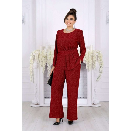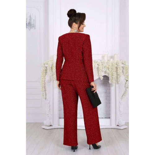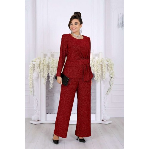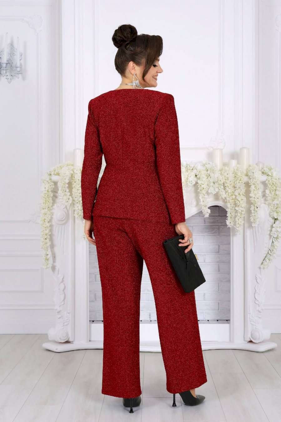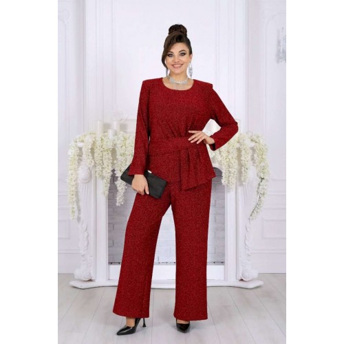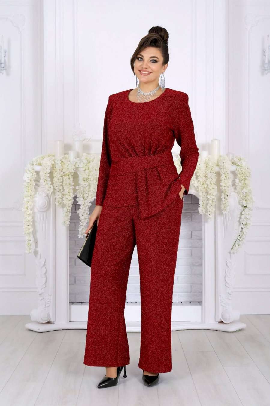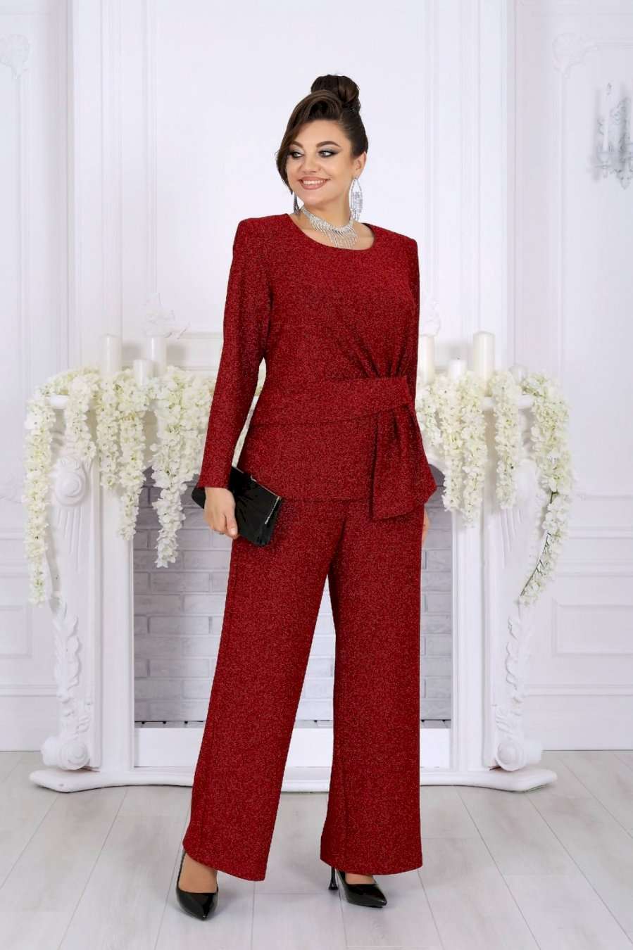 Это не просто наряд — это ваша уверенность, статус и блеск, который будет сопровождать каждый ваш шаг. В этом костюме каждая деталь продумана так, чтобы создавать ощущение безупречного стиля и лёгкой роскоши. Мягкое мерцание люрекса делает образ выразительным и дорогим, а утончённый крой подчёркивает женственность и гармонию силуэта. Блузка с асимметричной деталью по линии талии — это модный акцент, который визуально формирует стройный силуэт и придаёт образу дизайнерскую изысканность. Нежная линия декольте в обрамлении округлой горловины элегантно подчёркивает женственность. Брюки прямого силуэта с комфортной посадкой — символ утончённой простоты и свободы. Эластичный пояс обеспечивает удобство, а мерцающая фактура ткани делает их достойным элементом вечернего гардероба. Такой костюм создан для особых случаев: новогодних вечеров, корпоратива, праздничного ужина или выхода в свет, но при этом он настолько универсален, что легко впишется и в деловой стиль. Комплект брючный 2-х предметный, состоящий из блузки и брюк. Блузка полуприлегающего силуэта, выполнена из трикотажного полотна с фактурной лицевой стороной «люрекс». Модель без подкладки, с плечевыми накладками. Спинка с талиевыми вытачками и средним швом. По линии талии в левой части переда – горизонтальный подрез с односторонними складками и отлетной деталью в шве. По линии талии в правой части переда обработан цельнокроеный пояс, край которого крепится в левом боковом шве. Горловина округлая, углубленная спереди. Рукав длинный, втачной. Длина блузки – 62 см. Длина рукава – 57 см. Брюки длинные, с посадкой на талии, выполнены из трикотажного полотна с фактурной лицевой стороной «люрекс». Модель без стрелок, без застежки. Спереди обработаны наклонные боковые карманы. Для лучшего прилегания по линии талии в притачном поясе предусмотрена эластичная лента, вставленная по всей длине. Длина брюк по боковому (с поясом) – 106 см (50-52 р-р), 107 см (54-58 р-р).
