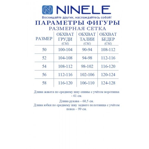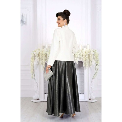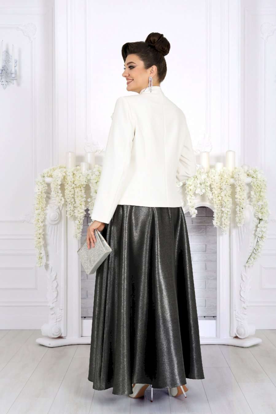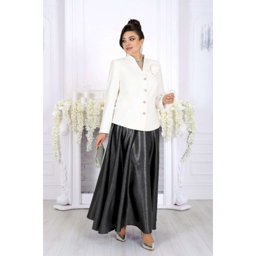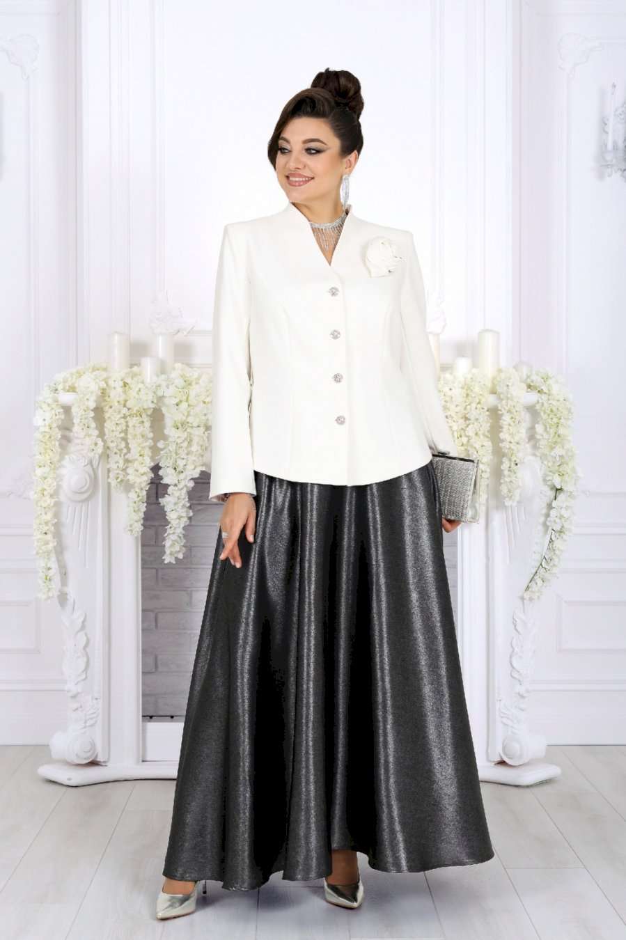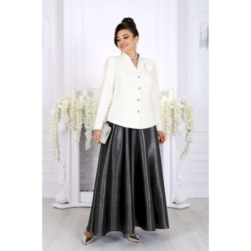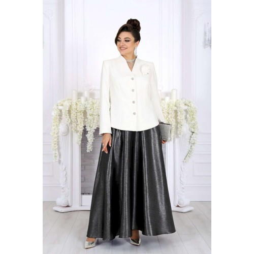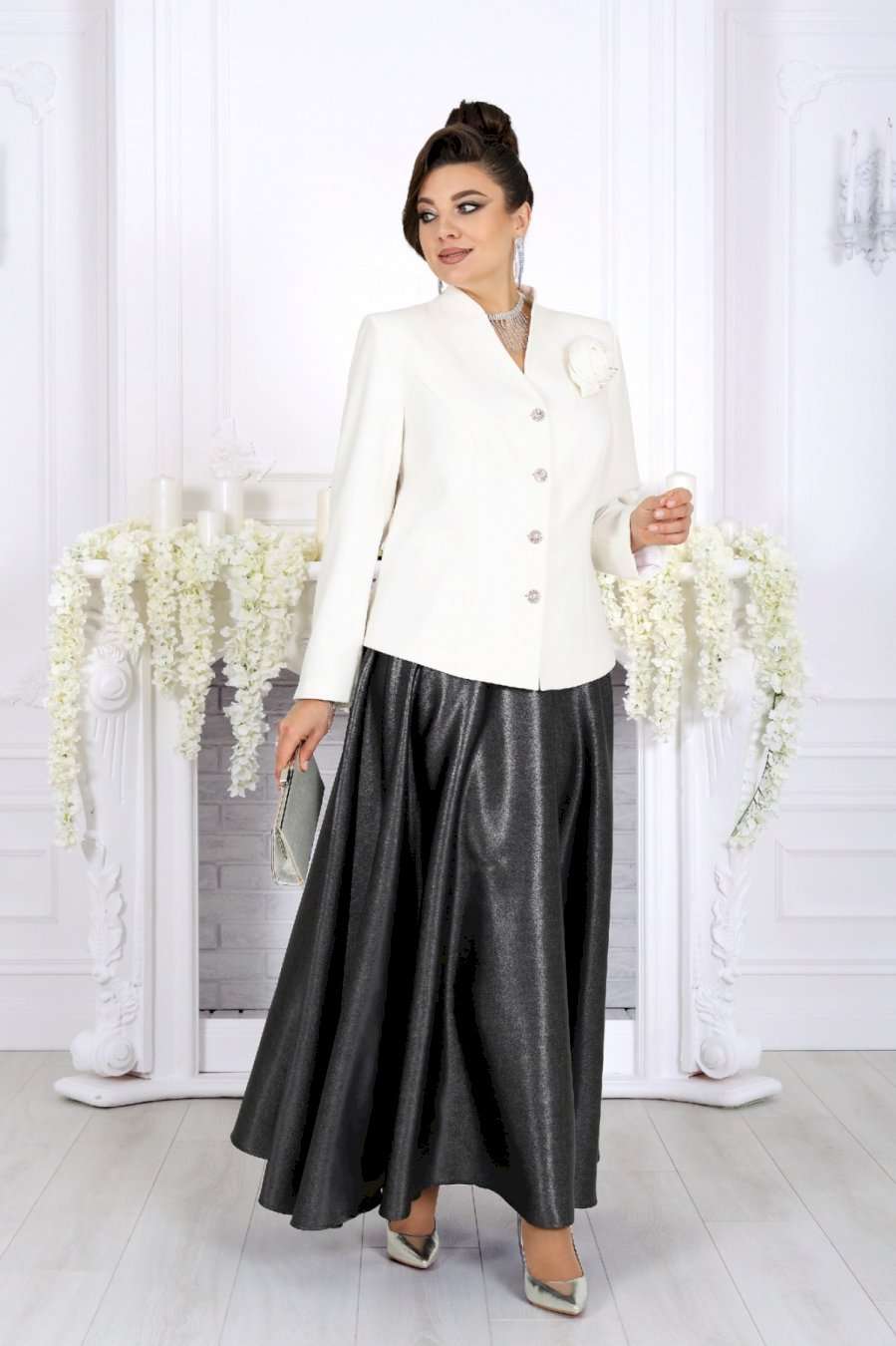Комплект женский 2-х предметный Праздничный костюм‑двойка, который звучит дорого и выглядит идеально на больших размерах. Когда нужно выступить в образе, где каждая деталь говорит о вкусе и статусе, этот комплект — точное попадание. Сочетание белого жакета и блестящей, струящейся юбки создаёт впечатление утончённой роскоши, а продуманный крой обеспечивает комфорт и свободу движений на всё мероприятие. Жакет — строгая элегантность и мягкая посадка. Полуприлегающий силуэт, подчёркнутые рельефы, аккуратная стойка и длинный рукав — всё это формирует собранный, лаконичный образ. Декоративные пуговицы и съёмный цветок добавляют женственный акцент, делая жакет подходящим и для официальных событий, и для вечерних праздников. Модель выполнена из плотного костюмного крепа с напылением, на подкладке и с плечевыми накладками — поэтому сидит ровно, держит форму и выглядит дорого. Юбка — движение, блеск и идеальный баланс. Юбка‑полусолнце из сатина с напылением мягко струится, красиво переливается и задаёт праздничный тон всему образу. Почему этот комплект стоит выбрать именно сейчас? Он сразу готов к торжеству: не нужно придумывать, с чем сочетать, или подбирать отдельные элементы. Подходит женщинам с пышными формами — стройнит, корректирует силуэт и не стесняют движений. Смотрится солидно, но не скучно: лаконичный жакет + праздничная юбка = образ для свадьбы, юбилея, корпоративного вечера или любого важного события. Комплект женский 2-х предметный, состоящий из жакета и юбки. Жакет однобортный, полуприлегающего силуэта, выполнен из костюмно-плательного крепа с напылением. Модель на поливискозной подкладке, с плечевыми накладками. Перед с рельефными швами, направленными от пройм, и центральной внешней застежкой на 4 декоративные пуговицы. Спинка со средним швом и рельефами, направленными от пройм до низа. Горловина оформлена стойкой, цельнокроеной с деталями переда и спинки. Рукав длинный, втачной. Жакет дополнен съемным «цветком» из основной ткани. Длина жакета (с воротником) – 61 см; длина рукава – 60,5 см. Юбка-полусолнце, с посадкой на талии, выполнена из костюмно-плательного сатина с напылением. Модель на трикотажной подкладке. В среднем шве заднего полотнища обработана застежка на потайную тесьму-«молнию» (20 см). Притачной пояс застегивается по спинке на 1 петлю и 1 пуговицу; для лучшего прилегания по линии талии в поясе предусмотрена эластичная лента, вставленная над боковыми швами. Длина по среднему шву (с поясом) - 99 см.