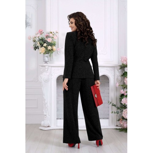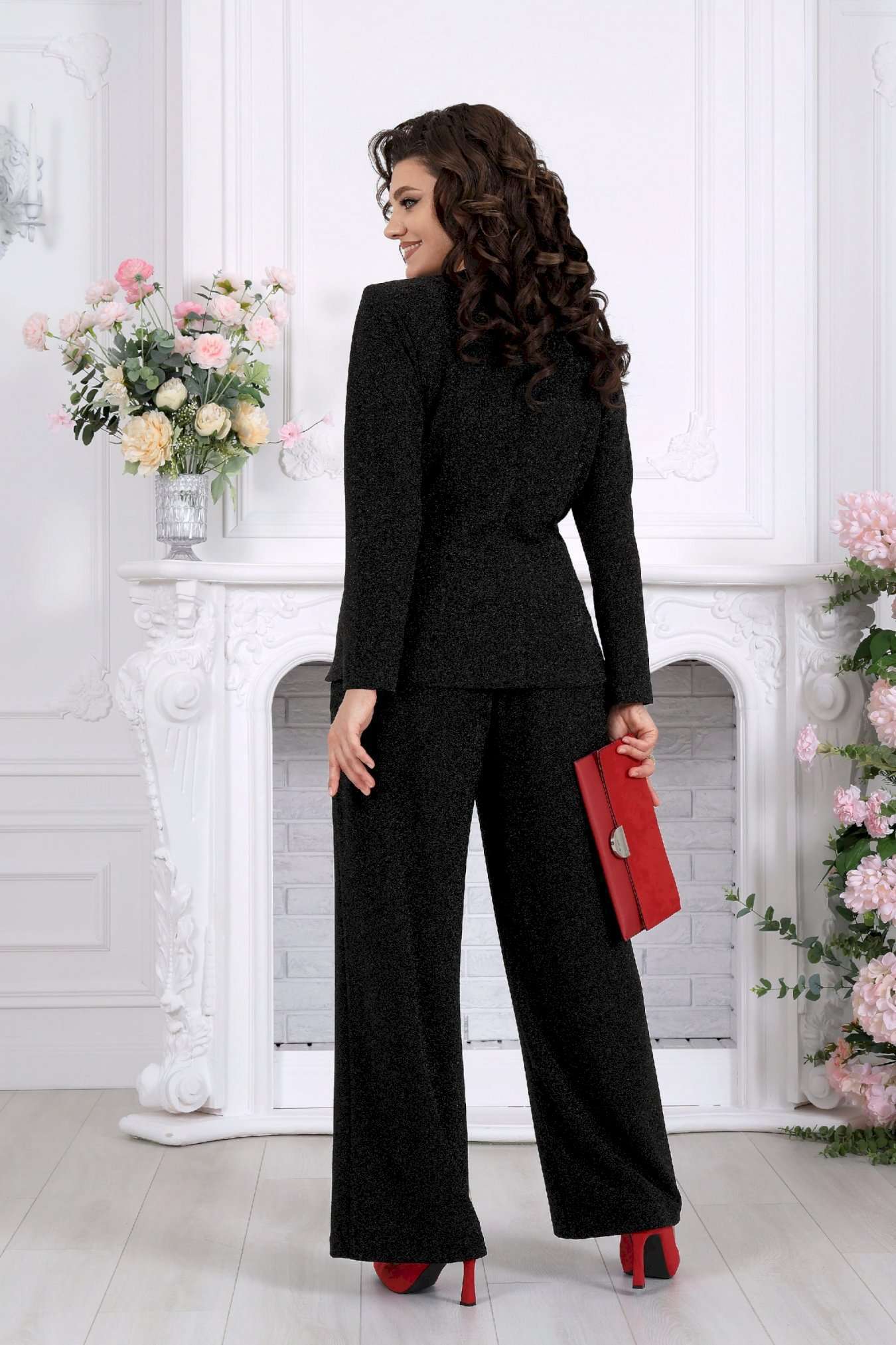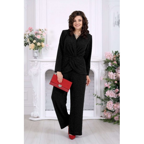 Нарядный брючный костюм — когда комфорт встречается с эффектом Этот костюм словно создан для моментов, когда хочется выглядеть особенно — уверенно, элегантно и чуть сияюще. Лаконичный силуэт, мягкий блеск люрекса и продуманная посадка делают образ выразительным без перегрузки. Блузка с имитацией запаха и изящной драпировкой «перекрут» деликатно подчеркивает талию, создавая красивую, женственную линию. V-образный вырез вытягивает силуэт, а мягкий трикотаж бережно повторяет движения, не сковывая и не утяжеляя образ. Брюки продолжают эту идею — свободные, струящиеся, с удобной посадкой на талии и эластичным поясом, они дарят ощущение легкости и уверенности на протяжении всего дня. Комплект брючный 2-х предметный, состоящий из блузки и брюк. Блузка полуприлегающего силуэта, выполнена из трикотажного полотна с фактурной лицевой стороной «люрекс». Модель на трикотажной подкладке, с длинным втачным рукавом и плечевыми накладками. Спинка с талиевыми вытачками и средним швом. Перед блузы с имитацией «запаха», отрезной по линии талии, по центру декорирован драпировкой «перекрут». Внизу полочки округлой формы. Горловина округлая по спине, V – образная спереди. Длина блузки – 64 см (50-58 р-р); длина рукава – 59 см (50-58 р-р) Брюки длинные, с посадкой на талии, выполнены из трикотажного полотна с фактурной лицевой стороной «люрекс». Модель без стрелок, без застежки. Спереди обработаны наклонные боковые карманы. Для лучшего прилегания по линии талии в притачном поясе предусмотрена широкая эластичная лента, вставленная по всей длине. Длина брюк по боковому (с поясом) –107 см (50-52 р-р), 108 см (54-58 р-р).