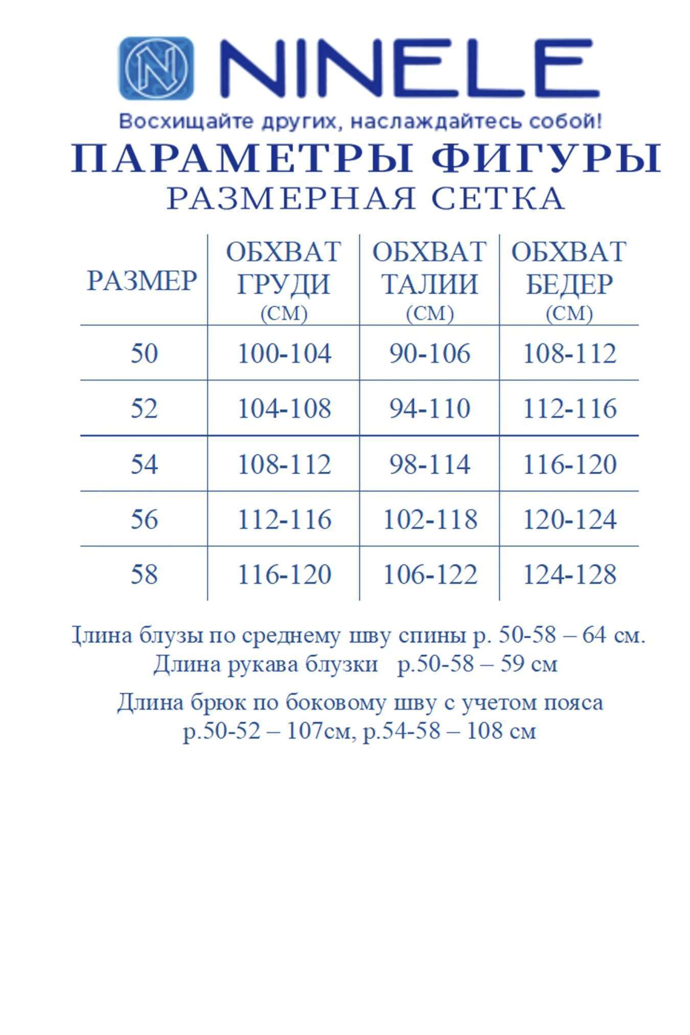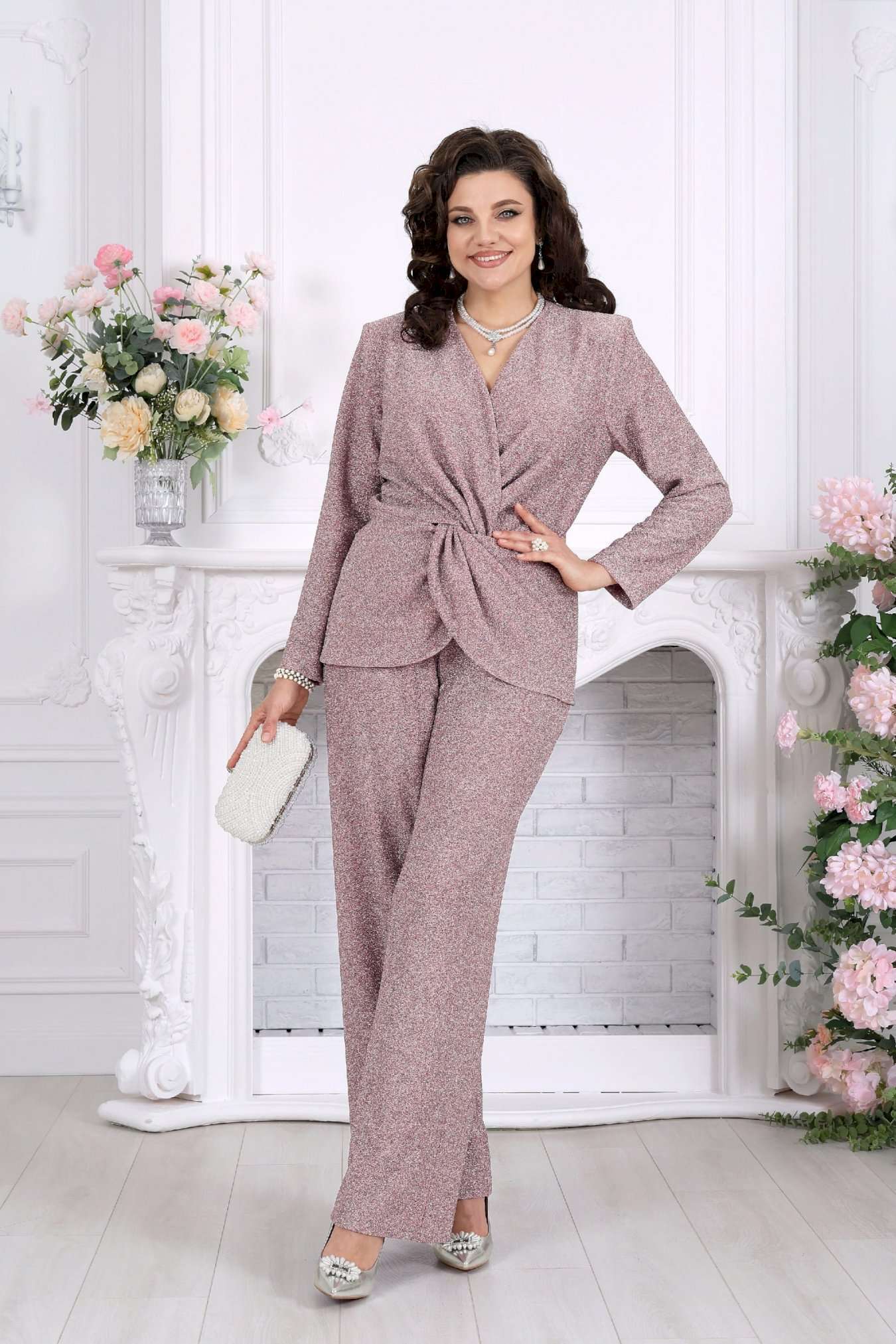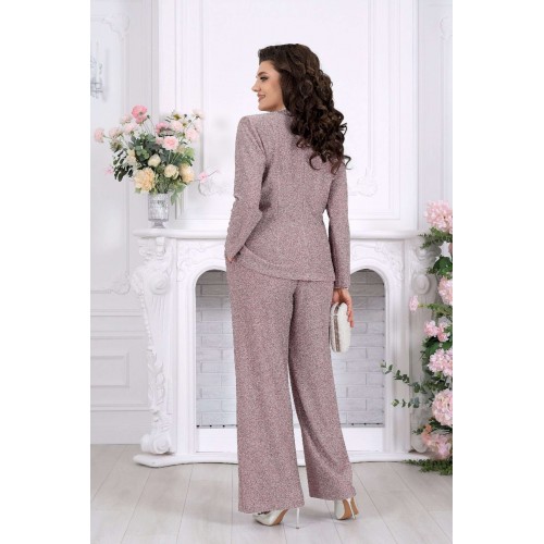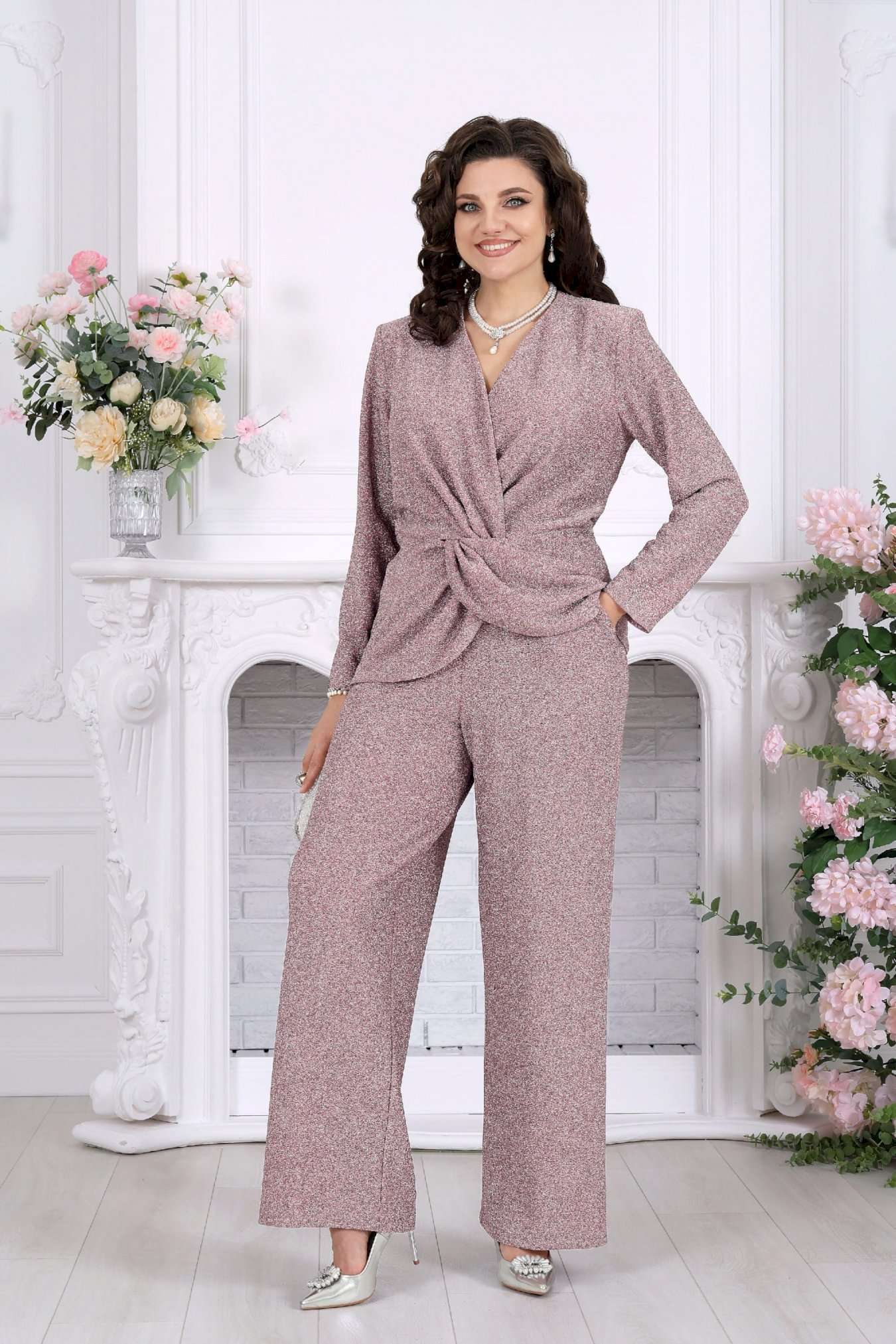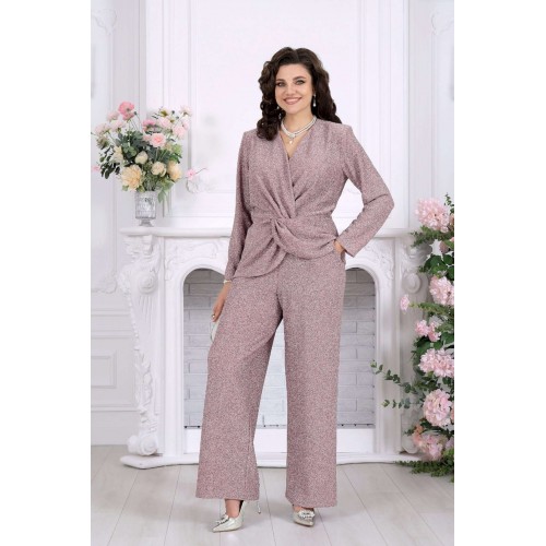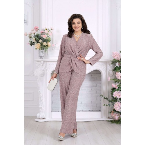 Нарядный брючный костюм — когда комфорт встречается с эффектом Этот костюм словно создан для моментов, когда хочется выглядеть особенно — уверенно, элегантно и чуть сияюще. Лаконичный силуэт, мягкий блеск люрекса и продуманная посадка делают образ выразительным без перегрузки. Блузка с имитацией запаха и изящной драпировкой «перекрут» деликатно подчеркивает талию, создавая красивую, женственную линию. V-образный вырез вытягивает силуэт, а мягкий трикотаж бережно повторяет движения, не сковывая и не утяжеляя образ. Брюки продолжают эту идею — свободные, струящиеся, с удобной посадкой на талии и эластичным поясом, они дарят ощущение легкости и уверенности на протяжении всего дня. Комплект брючный 2-х предметный, состоящий из блузки и брюк. Блузка полуприлегающего силуэта, выполнена из трикотажного полотна с фактурной лицевой стороной «люрекс». Модель на трикотажной подкладке, с длинным втачным рукавом и плечевыми накладками. Спинка с талиевыми вытачками и средним швом. Перед блузы с имитацией «запаха», отрезной по линии талии, по центру декорирован драпировкой «перекрут». Внизу полочки округлой формы. Горловина округлая по спине, V – образная спереди. Длина блузки – 64 см (50-58 р-р); длина рукава – 59 см (50-58 р-р) Брюки длинные, с посадкой на талии, выполнены из трикотажного полотна с фактурной лицевой стороной «люрекс». Модель без стрелок, без застежки. Спереди обработаны наклонные боковые карманы. Для лучшего прилегания по линии талии в притачном поясе предусмотрена широкая эластичная лента, вставленная по всей длине. Длина брюк по боковому (с поясом) –107 см (50-52 р-р), 108 см (54-58 р-р).