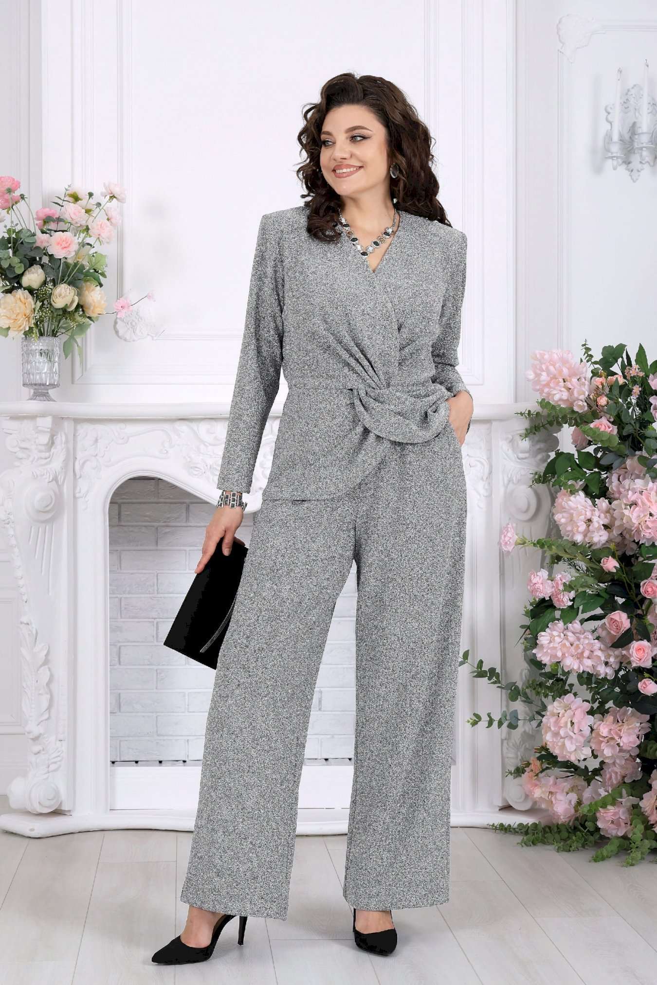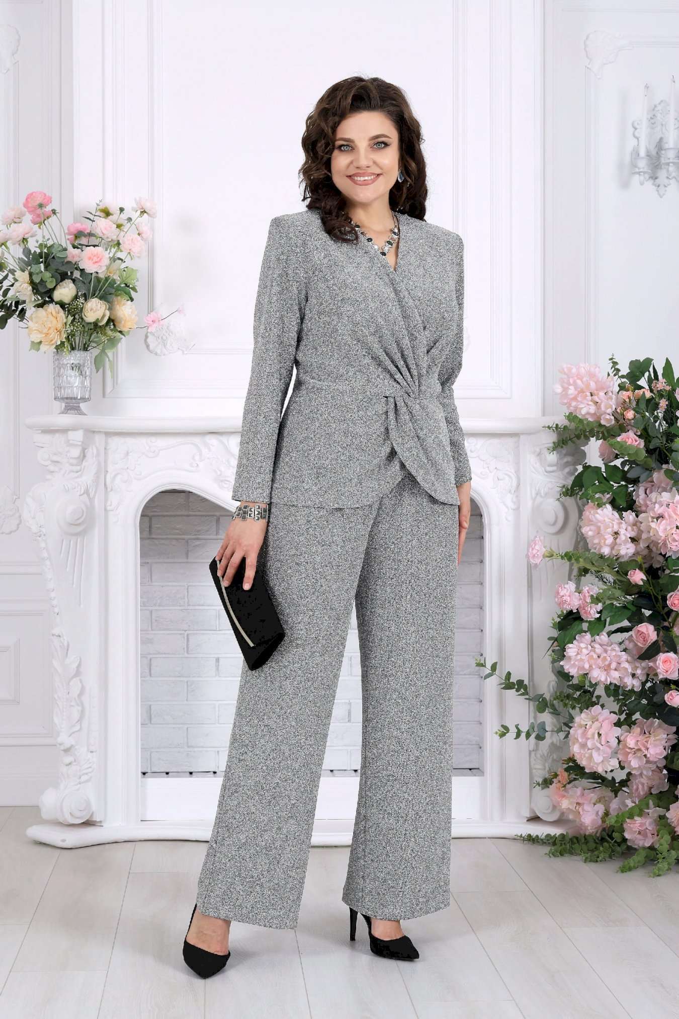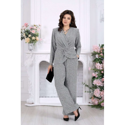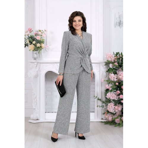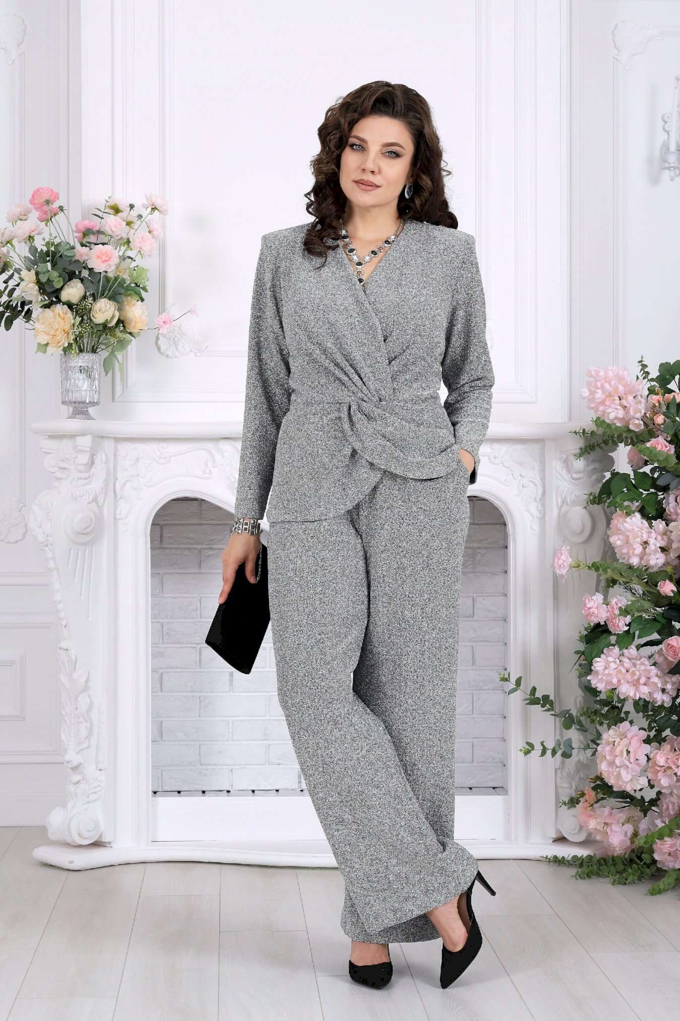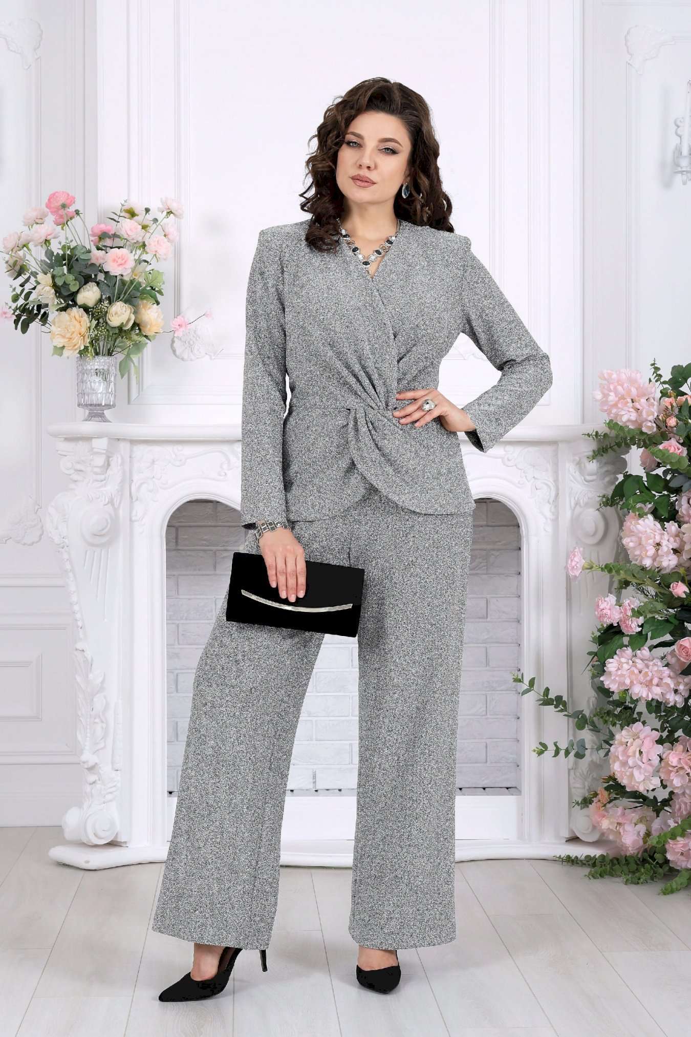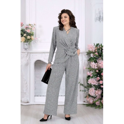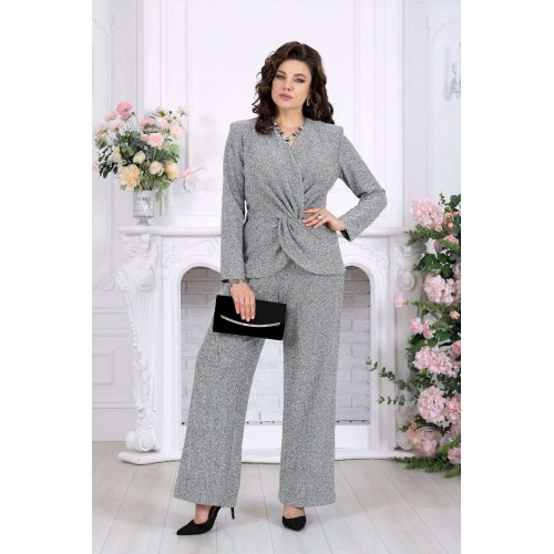 Нарядный брючный костюм — когда комфорт встречается с эффектом Этот костюм словно создан для моментов, когда хочется выглядеть особенно — уверенно, элегантно и чуть сияюще. Лаконичный силуэт, мягкий блеск люрекса и продуманная посадка делают образ выразительным без перегрузки. Блузка с имитацией запаха и изящной драпировкой «перекрут» деликатно подчеркивает талию, создавая красивую, женственную линию. V-образный вырез вытягивает силуэт, а мягкий трикотаж бережно повторяет движения, не сковывая и не утяжеляя образ. Брюки продолжают эту идею — свободные, струящиеся, с удобной посадкой на талии и эластичным поясом, они дарят ощущение легкости и уверенности на протяжении всего дня. Комплект брючный 2-х предметный, состоящий из блузки и брюк. Блузка полуприлегающего силуэта, выполнена из трикотажного полотна с фактурной лицевой стороной «люрекс». Модель на трикотажной подкладке, с длинным втачным рукавом и плечевыми накладками. Спинка с талиевыми вытачками и средним швом. Перед блузы с имитацией «запаха», отрезной по линии талии, по центру декорирован драпировкой «перекрут». Внизу полочки округлой формы. Горловина округлая по спине, V – образная спереди. Длина блузки – 64 см (50-58 р-р); длина рукава – 59 см (50-58 р-р) Брюки длинные, с посадкой на талии, выполнены из трикотажного полотна с фактурной лицевой стороной «люрекс». Модель без стрелок, без застежки. Спереди обработаны наклонные боковые карманы. Для лучшего прилегания по линии талии в притачном поясе предусмотрена широкая эластичная лента, вставленная по всей длине. Длина брюк по боковому (с поясом) –107 см (50-52 р-р), 108 см (54-58 р-р).