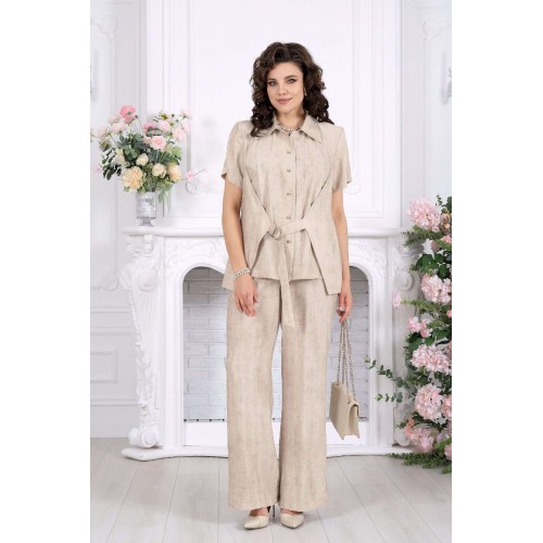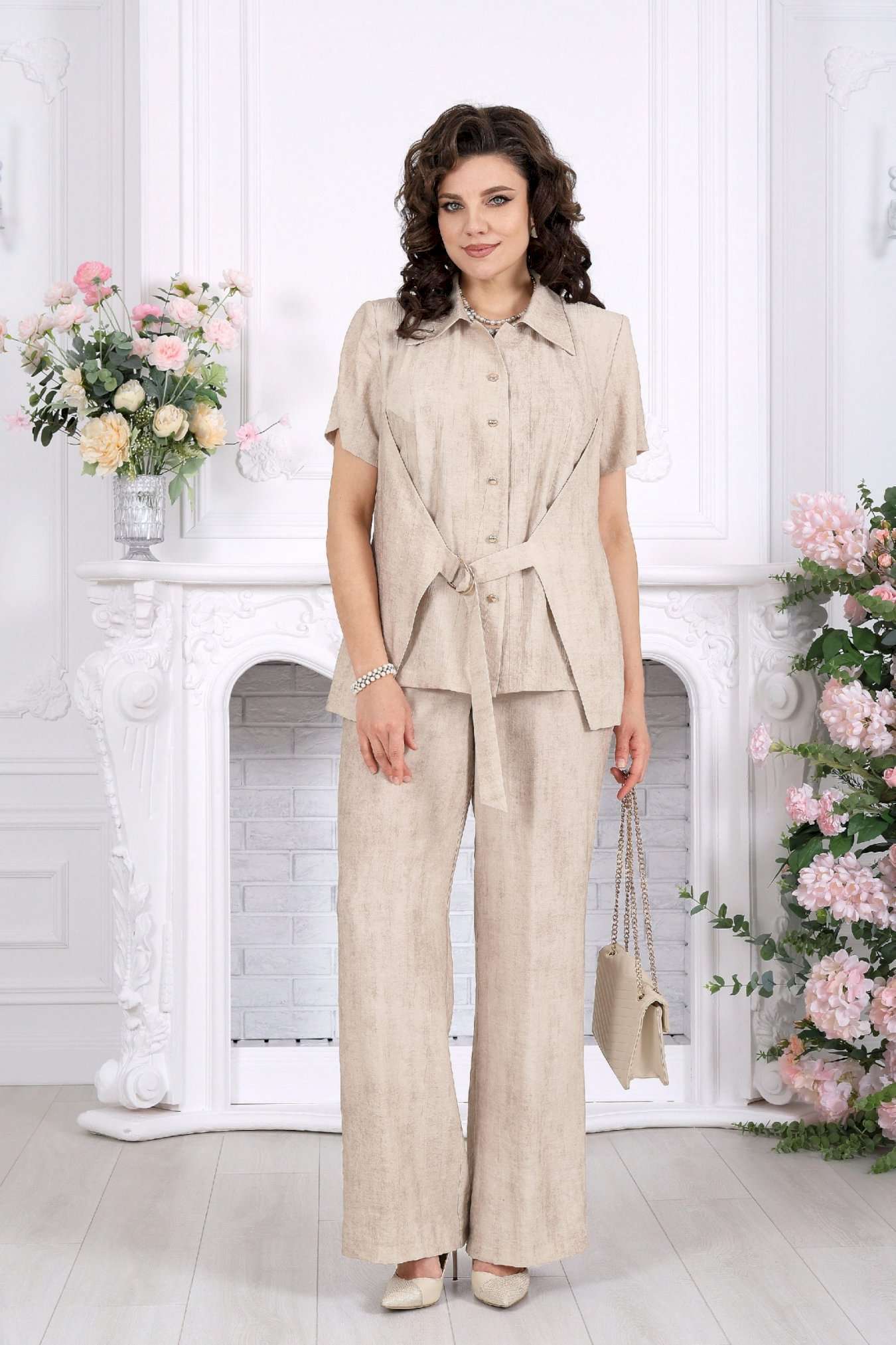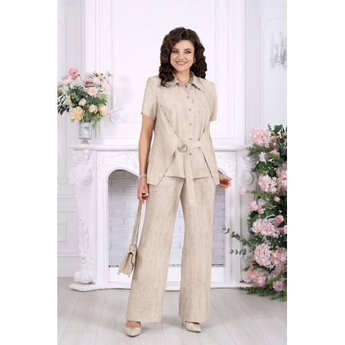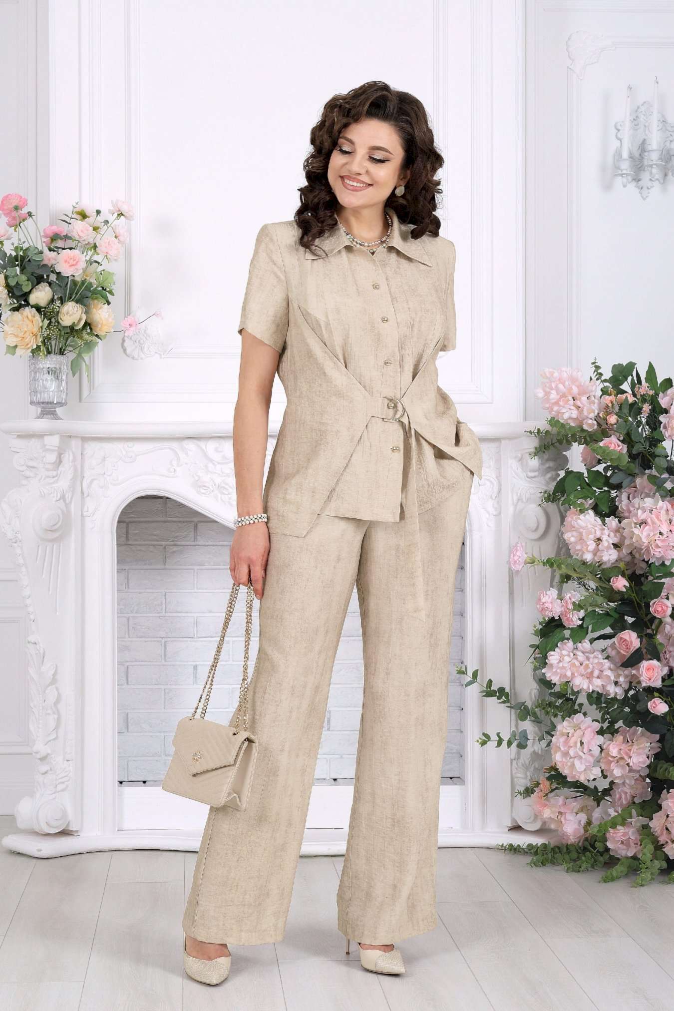Брючный костюм — эстетика естественной элегантности Этот костюм — про сдержанную роскошь, которая не кричит, а говорит тихо и уверенно. Он словно создан для женщины, которая ценит комфорт, но не готова отказываться от стиля. Мягкое вискозное «крэш»-полотно с живой фактурой придает образу глубину и характер. Легкая небрежность текстуры делает костюм особенно актуальным — он выглядит дорого, но при этом абсолютно непринужденно. Блузка с архитектурным кроем и отлетными деталями формирует интересный силуэт: линии сходятся к центру, мягко подчеркивая талию и вытягивая фигуру. Пояс с полукольцами добавляет акцент, не утяжеляя образ. Вискозное «крэш»-полотно — это баланс между натуральностью и практичностью. Оно легкое, дышащее, приятно к телу и не требует идеальной глажки, сохраняя эффект стильной фактурности. Комплект брючный 2-х предметный, состоящий из блузки и брюк. Блузка прямого силуэта, выполнена из вискозного «крэш»-полотна. Модель с втачным рукавом и плечевыми накладками. Спинка блузки со средним швом и рельефами, направленными от пройм до низа. Перед с центральной застежкой на 5 петель и 5 пуговиц. По переду блузки выполнены отлетные детали, которые входят в боковой шов и частично в пройму и вытачку. Отлетные детали переда идут к центру в виде треугольника, на левой детали обработан цельнокроенный пояс, в правой полукольца. Горловина оформлена отложным воротником. Рукав втачной короткий. Длина блузки – 66 см (50-58 р-р); длина рукава – 22 см (50-58 р-р). Брюки классические, длинные, с посадкой на талии, выполнены из вискозного «крэш»-полотна. Модель без стрелок. Задние и передние половинки брюк с талиевыми вытачками, направленными от пояса вниз. Спереди обработаны наклонные боковые карманы и центральная застёжка на тесьму-«молнию». Притачной пояс застегивается на 1 петлю и 1 пуговицу; для лучшего прилегания по линии талии в притачном поясе предусмотрена эластичная лента, вставленная по спинке. Длина брюк по боковому (с поясом) – 107 см (50-52 р-р), 108 см (54-58 р-р).