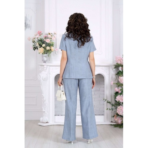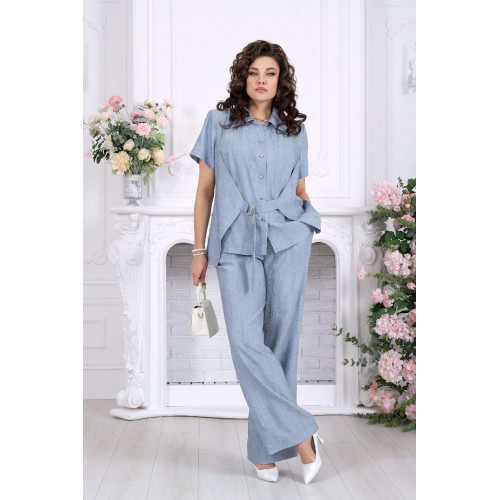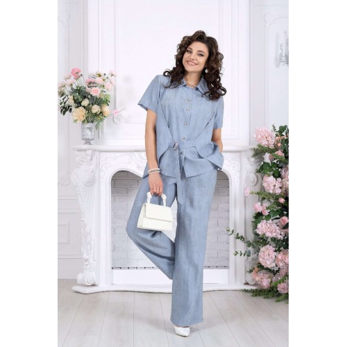 Брючный костюм — эстетика естественной элегантности Этот костюм — про сдержанную роскошь, которая не кричит, а говорит тихо и уверенно. Он словно создан для женщины, которая ценит комфорт, но не готова отказываться от стиля. Мягкое вискозное «крэш»-полотно с живой фактурой придает образу глубину и характер. Легкая небрежность текстуры делает костюм особенно актуальным — он выглядит дорого, но при этом абсолютно непринужденно. Блузка с архитектурным кроем и отлетными деталями формирует интересный силуэт: линии сходятся к центру, мягко подчеркивая талию и вытягивая фигуру. Пояс с полукольцами добавляет акцент, не утяжеляя образ. Вискозное «крэш»-полотно — это баланс между натуральностью и практичностью. Оно легкое, дышащее, приятно к телу и не требует идеальной глажки, сохраняя эффект стильной фактурности. Комплект брючный 2-х предметный, состоящий из блузки и брюк. Блузка прямого силуэта, выполнена из вискозного «крэш»-полотна. Модель с втачным рукавом и плечевыми накладками. Спинка блузки со средним швом и рельефами, направленными от пройм до низа. Перед с центральной застежкой на 5 петель и 5 пуговиц. По переду блузки выполнены отлетные детали, которые входят в боковой шов и частично в пройму и вытачку. Отлетные детали переда идут к центру в виде треугольника, на левой детали обработан цельнокроенный пояс, в правой полукольца. Горловина оформлена отложным воротником. Рукав втачной короткий. Длина блузки – 66 см (50-58 р-р); длина рукава – 22 см (50-58 р-р). Брюки классические, длинные, с посадкой на талии, выполнены из вискозного «крэш»-полотна. Модель без стрелок. Задние и передние половинки брюк с талиевыми вытачками, направленными от пояса вниз. Спереди обработаны наклонные боковые карманы и центральная застёжка на тесьму-«молнию». Притачной пояс застегивается на 1 петлю и 1 пуговицу; для лучшего прилегания по линии талии в притачном поясе предусмотрена эластичная лента, вставленная по спинке. Длина брюк по боковому (с поясом) – 107 см (50-52 р-р), 108 см (54-58 р-р).
