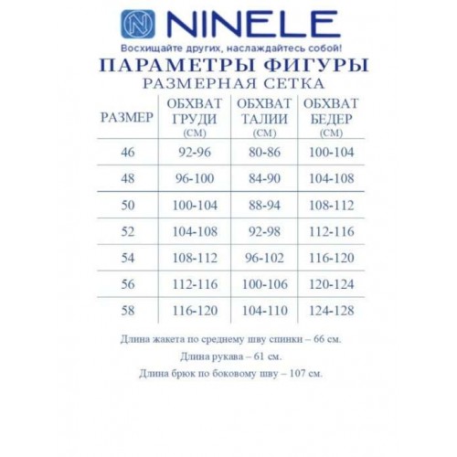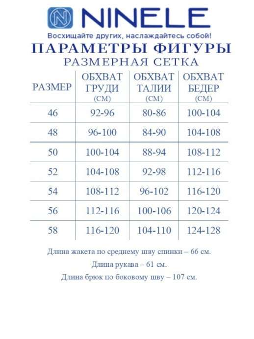 Жакет классический на подкладке, полуприлегающего силуэта, выполнен из костюмной поливискозы. Спереди обработаны рельефные швы, направленные от пройм до низа; в нижней части переда расположены прорезные карманы с клапаном. Перед с двубортной внешней застежкой на 2 декоративные пуговицы и внутренней на 2 потайные. На спинке обработана высокая шлица с застежкой на 3 декоративные пуговицы. Воротник пиджачного типа. Рукав длинный, втачной; в нижней части локтевого шва – имитация шлицы с застежкой на 3 пуговицы. Длина жакета - 66 см; длина рукава - 61 см. Брюки классические, с кантами и посадкой на талии, выполнены из костюмной поливискозы. Модель с центральной застёжкой на тесьму-«молнию», на притачном поясе, застегивающемся на петлю и пуговицу. Передние и задние половинки брюк с талиевыми вытачками, направленными от пояса вниз. Спереди обработаны боковые наклонные карманы. Для лучшего прилегания брюк в области талии в поясе по задним половинкам вставлена эластичная лента. Длина брюк по боковому (с поясом)-106 см (50-54 р-р), 107 см (56-58 р-р).