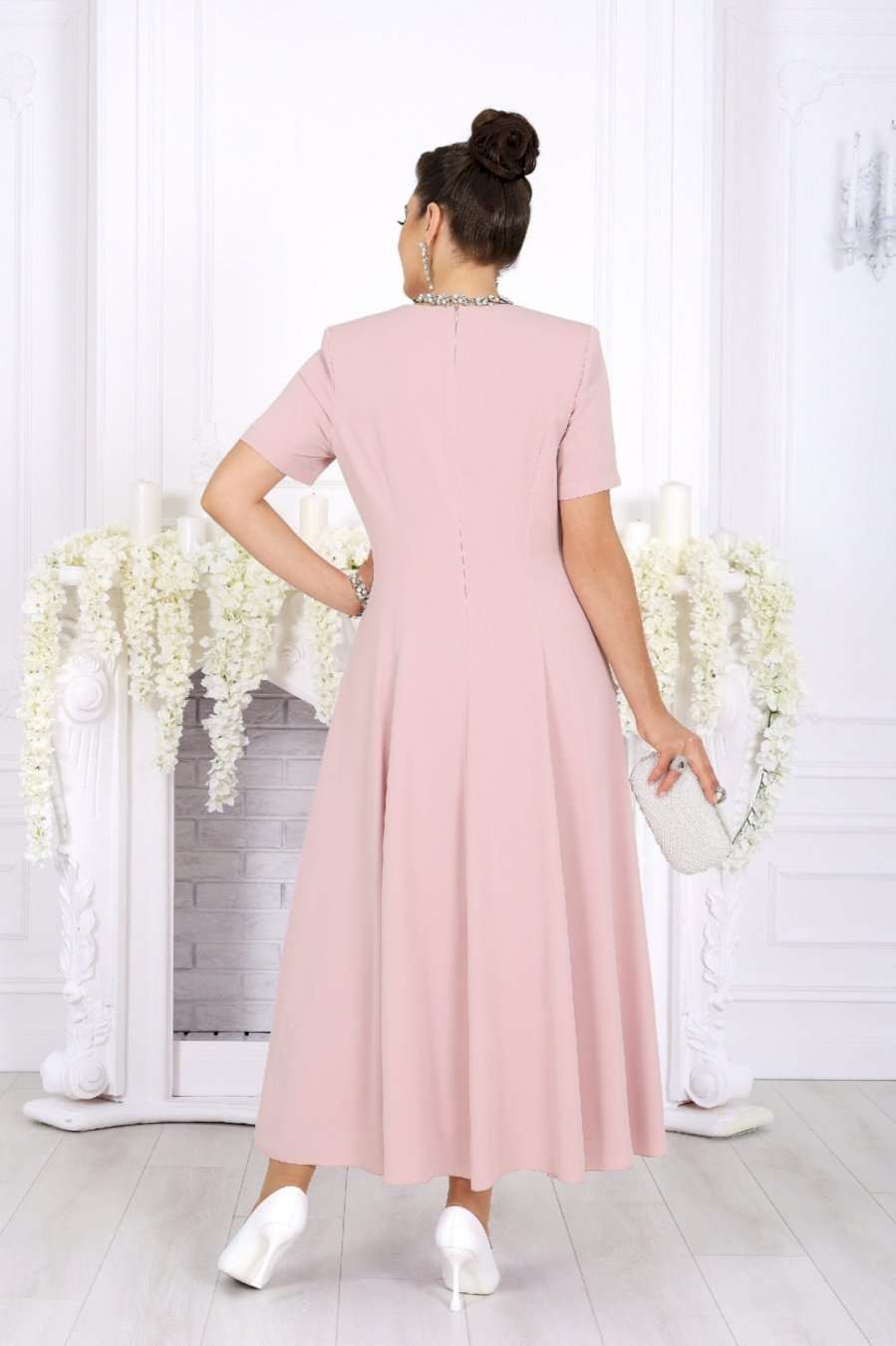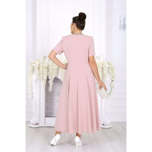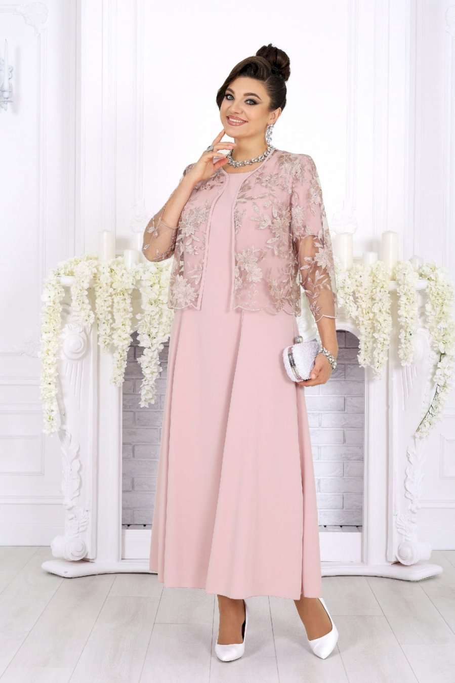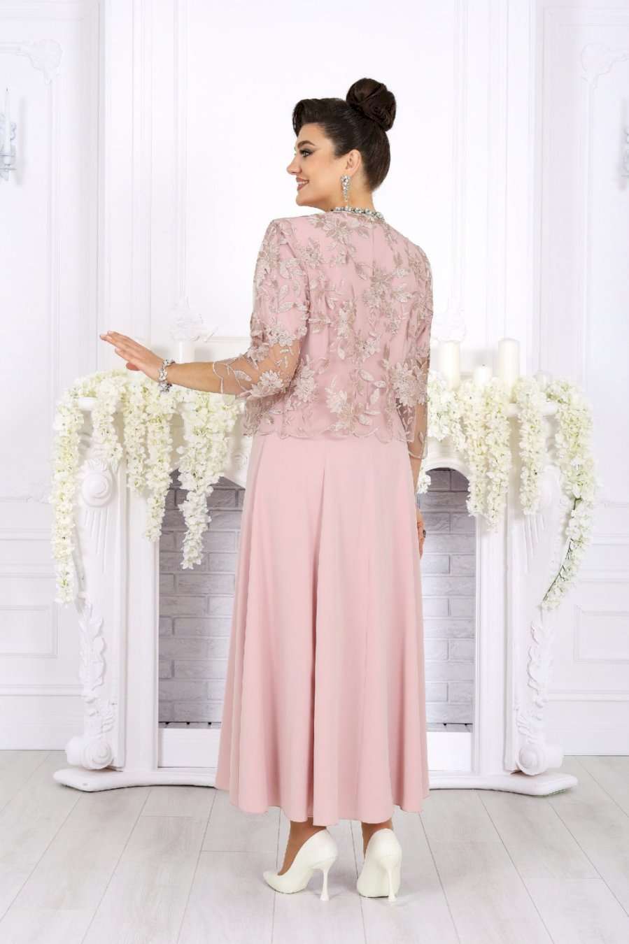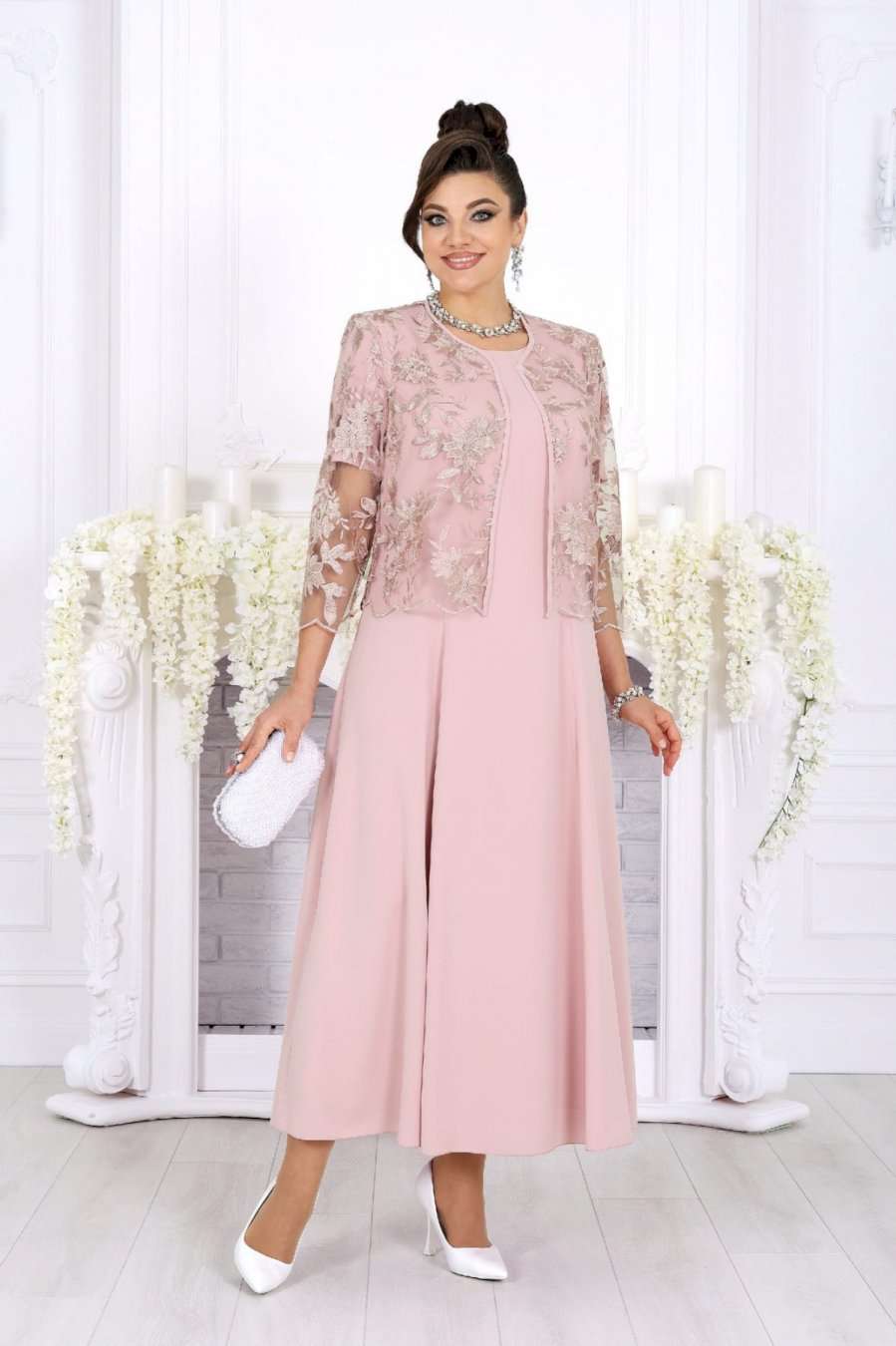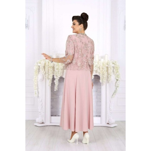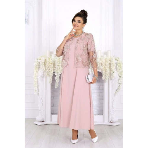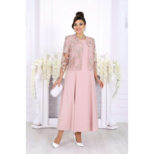 Комплект женский 2-х предметный, состоящий из жакета и платья. Жакет полуприлегающего силуэта, укороченный, выполнен из гипюра. Модель без подкладки. Перед с нагрудными вытачками, направленными от пройм. Срезы борта и горловины окантованы косой бейкой из плательного стрейч-шифона. Рукав втачной, длиной ¾. Низ переда, спинки и рукавов оформлен фестонами. Длина жакета – 52 см; длина рукава – 48 см. Платье полуприлегающего силуэта, расклешенное к низу. Модель двухслойная, оба слоя выполнены из плательного стрейч-шифона и скреплены по горловине и проймам. Перед с рельефными швами, проходящими через центр груди, идущими от пройм до низа. Спинка с рельефными швами, идущими от пройм до низа; в среднем шве обработана застежка на потайную тесьму-«молнию» (50 см). Горловина округлой формы, углубленная спереди. Рукав втачной, короткий. Платье с плечевыми накладками. Длина платья – 131 см, длина рукава – 25 см.