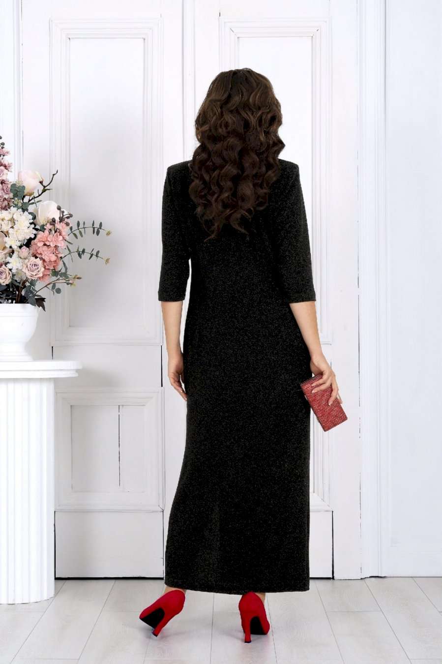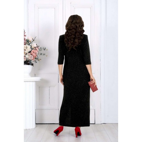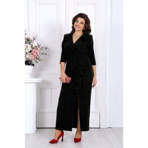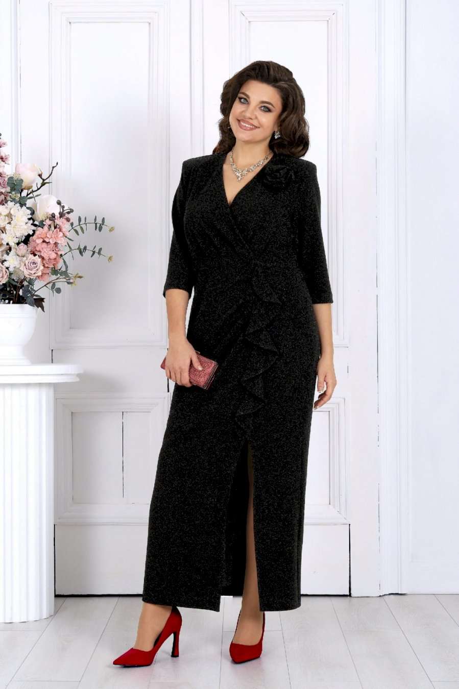 Ослепительное платье из мерцающего люрекса создано для тех, кто хочет выглядеть роскошно и уверенно на любом торжестве. Эта модель моментально притягивает взгляд — благородный блеск ткани, элегантный V-образный вырез, женственный запах и изящные складки создают по-настоящему праздничный образ, который подчёркивает фигуру и делает её зрительно стройнее. Платье продумано до мелочей, чтобы каждая женщина — в том числе в больших размерах — чувствовала себя уверенной, женственной и роскошной. Мерцающий люрекс под светом ламп и софитов смотрится особенно эффектно — идеально для свадьбы, юбилея, корпоратива, новогодней вечеринки или любого важного события, где нужно блистать. Съёмный декоративный цветок позволяет легко менять настроение образа: хочешь — создаёшь более торжественный акцент, хочешь — оставляешь чистую элегантную линию. Платье женское полуприлегающего силуэта, выполнено из трикотажного полотна с фактурной лицевой стороной «люрекс». Модель на трикотажной подкладке, с плечевыми накладками и застежкой в левом боковом шве на потайную тесьму-«молнию» (35 см). Перед отрезной по линии талии. Верхняя часть переда состоит из двух деталей, скрепленных на запах; вдоль горизонтального подреза заложены односторонние складки. На нижней части переда обработан рельефный шов с двойным воланом в верхней части и разрезом по низу; от шва к центру направлены односторонние складки. На спинке обработаны талиевые вытачки. Рукав трехчетвертной. Платье дополнено съемным «цветком» из основного полотна. Длина платья – 134 см; длина рукава – 42 см.