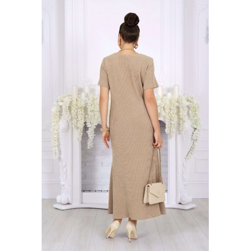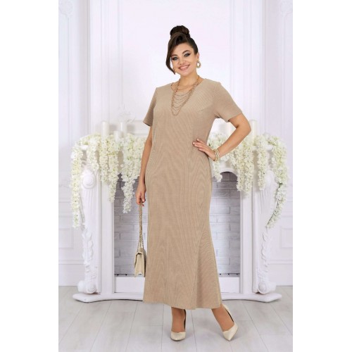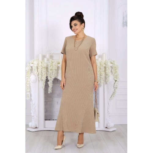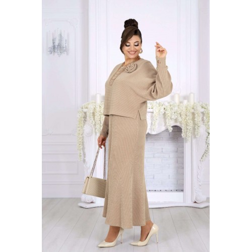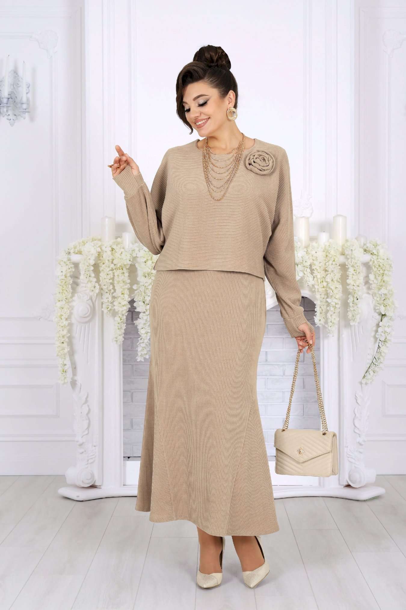 Практичный, стильный и по-настоящему универсальный костюм, который станет базой вашего гардероба и будет радовать не один сезон. Этот костюм создан для женщин, которые ценят комфорт, аккуратную посадку и продуманный дизайн. Фактурный трикотаж с рубчиком мягко ложится по фигуре, визуально вытягивает силуэт и не сковывает движений. Модель отлично подходит для женщин с формами и уверенно смотрится в больших размерах. Платье полуприлегающего силуэта красиво подчеркивает линии фигуры, а притачные клинья по бокам создают плавное расширение к низу, обеспечивая свободу шага и женственный силуэт. Удобная длина делает образ уместным как для деловой обстановки, так и для прогулок или встреч. Свободный джемпер добавляет образу уюта и многослойности: его можно носить поверх платья или отдельно. Разрезы по бокам, мягкая горловина и манжеты с вырезом для большого пальца создают современный, продуманный образ. Съемный декоративный цветок позволяет менять настроение комплекта — от лаконичного до более нарядного. Костюм легко адаптируется под разные случаи: — с аксессуарами и каблуками — для праздничного или делового выхода — с обувью на низком ходу — для комфортных повседневных образов Комплект женский 2-х предметный, состоящий из джемпера и платья. Джемпер свободного силуэта, выполнен из фактурного трикотажного полотна с рубчиком. Модель с разрезами в боковых швах, без подкладки, без застежки и плечевых накладок Горловина круглой формы, углубленная спереди. Рукав длинный, цельнокроеный с деталями переда и спинки; по низу рукава манжета с вырезом для большого пальца. Джемпер дополнен съемным «цветком» из основного полотна. Длина джемпера – 46 см; длина рукава (от горловины) – 77 см. Платье полуприлегающего силуэта, выполнено из фактурного трикотажного полотна с рубчиком. На продолжении боковых швов, в нижней части платья – притачные клинья, придающие силуэту расширение к низу. Модель без подкладки, без застежки и плечевых накладок. Перед с нагрудными вытачками, направленными от пройм, спинка – с талиевыми. Горловина круглой формы, углубленная спереди. Рукав втачной, короткий. Длина платья – 130 см; длина рукава – 22 см.