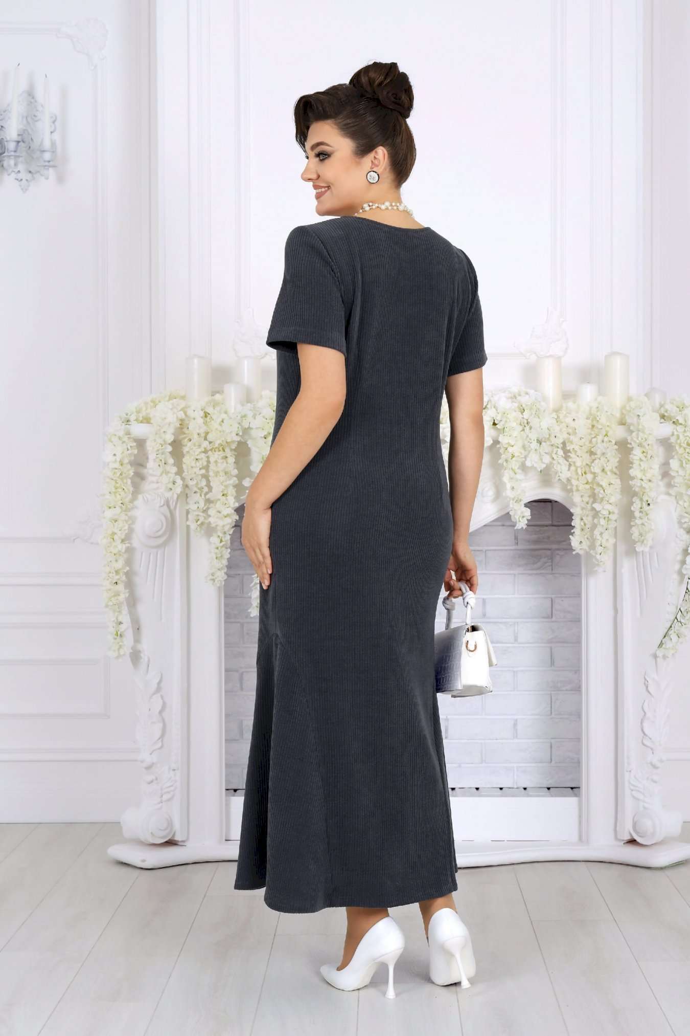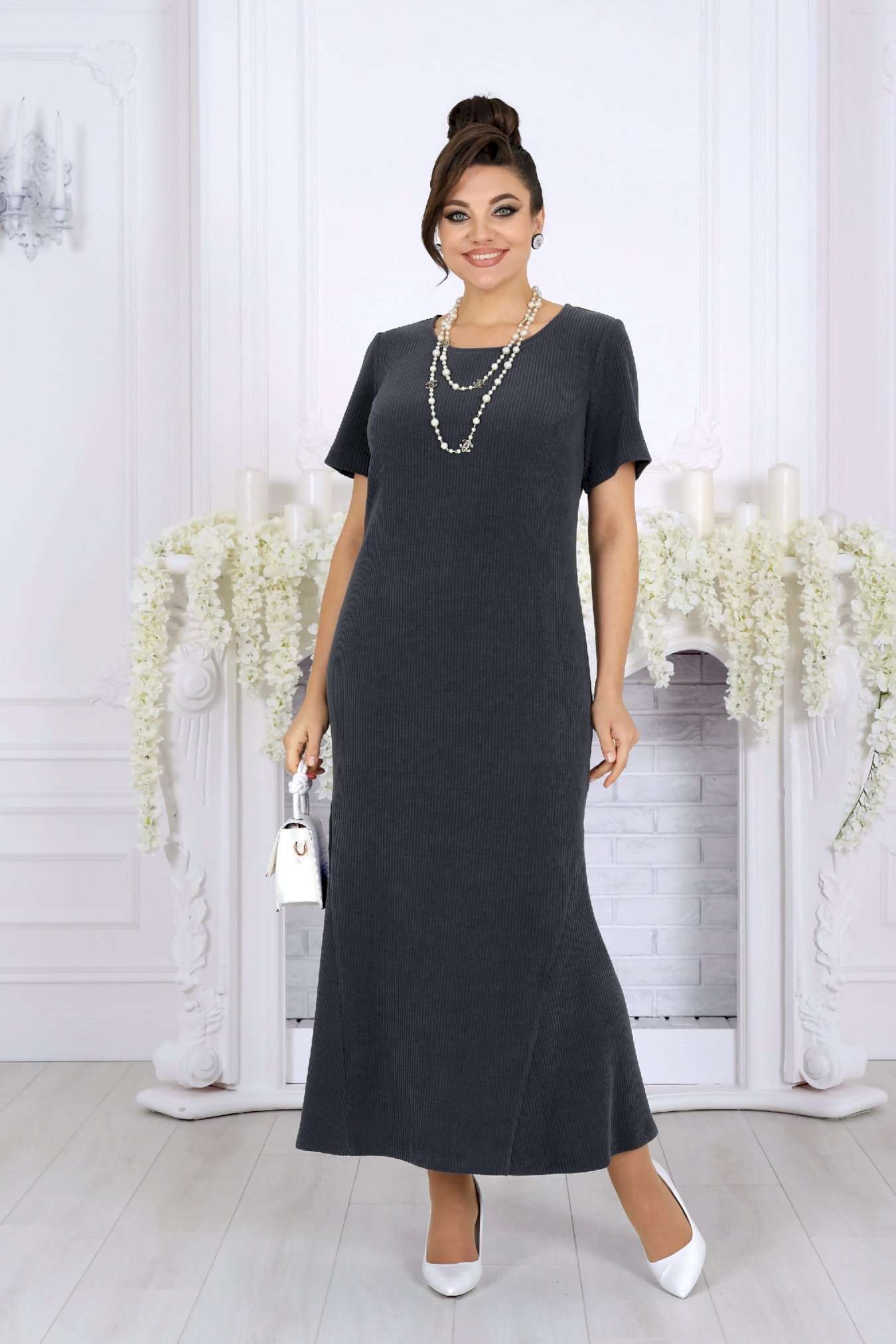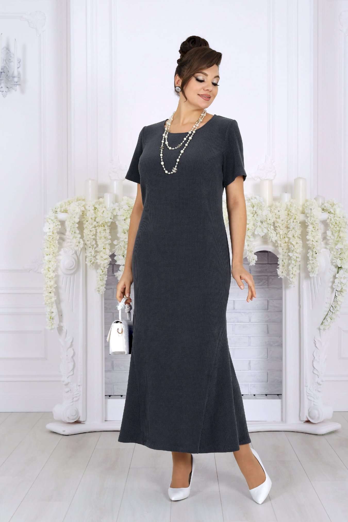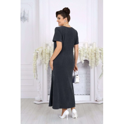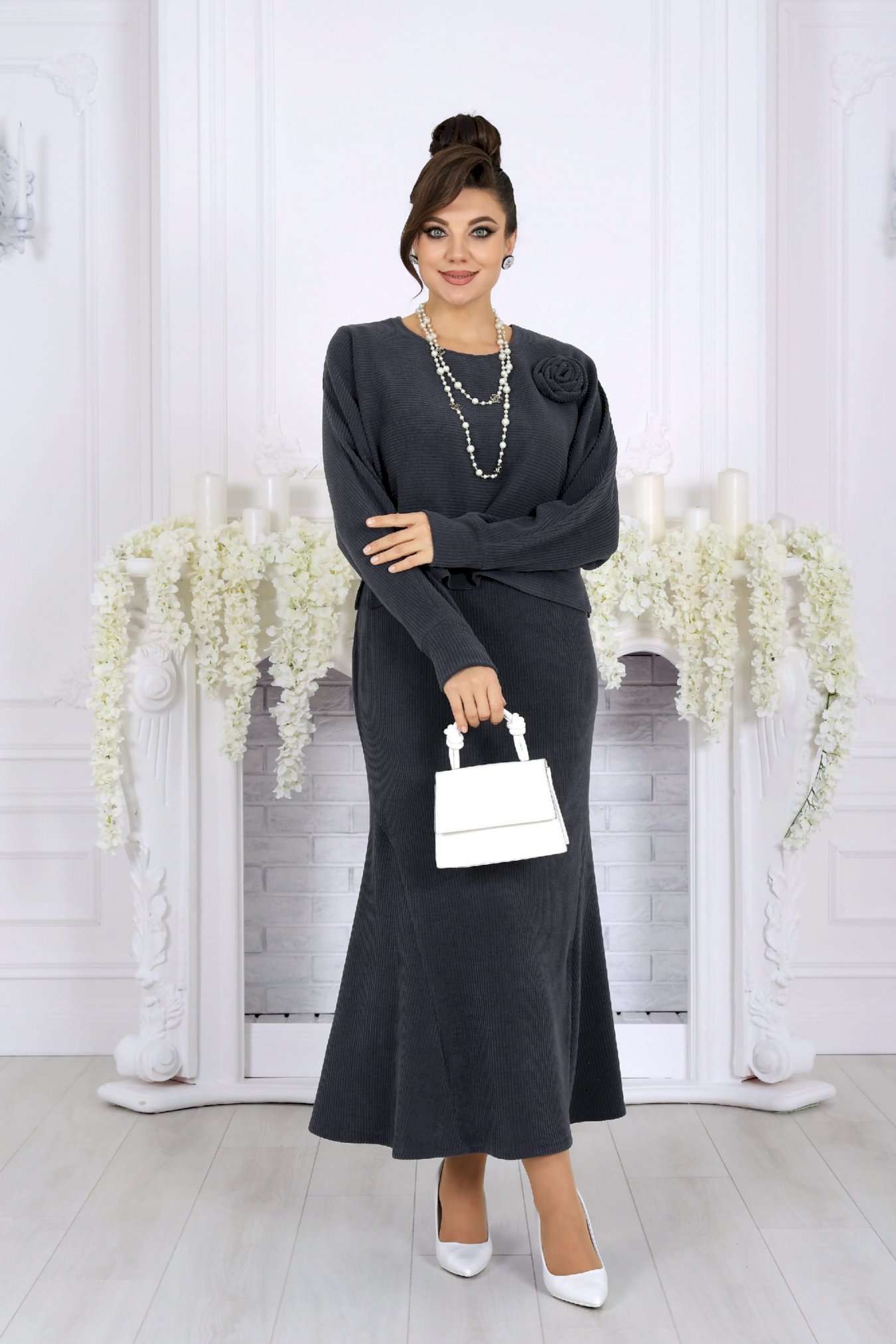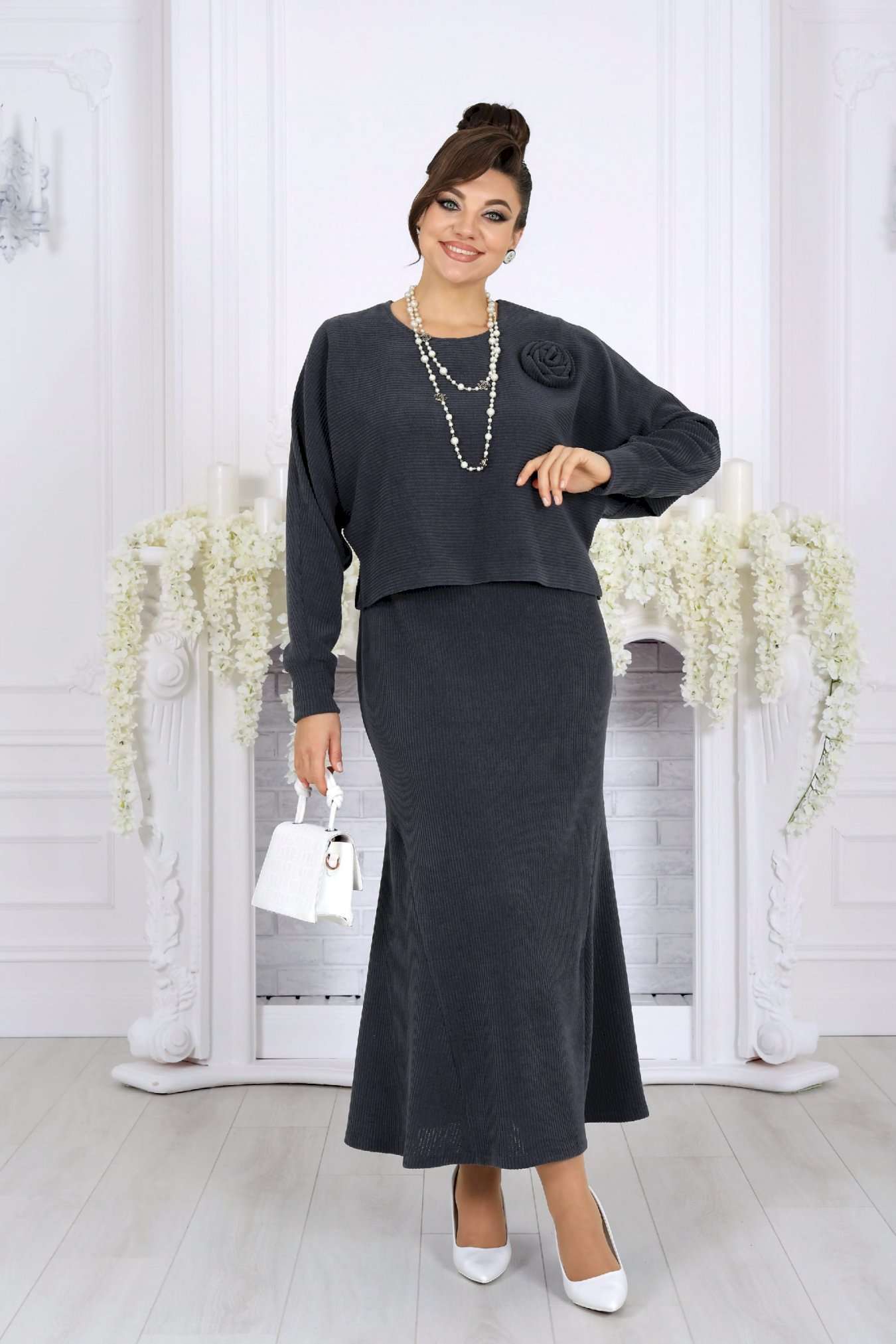 Практичный, стильный и по-настоящему универсальный костюм, который станет базой вашего гардероба и будет радовать не один сезон. Этот костюм создан для женщин, которые ценят комфорт, аккуратную посадку и продуманный дизайн. Фактурный трикотаж с рубчиком мягко ложится по фигуре, визуально вытягивает силуэт и не сковывает движений. Модель отлично подходит для женщин с формами и уверенно смотрится в больших размерах. Платье полуприлегающего силуэта красиво подчеркивает линии фигуры, а притачные клинья по бокам создают плавное расширение к низу, обеспечивая свободу шага и женственный силуэт. Удобная длина делает образ уместным как для деловой обстановки, так и для прогулок или встреч. Свободный джемпер добавляет образу уюта и многослойности: его можно носить поверх платья или отдельно. Разрезы по бокам, мягкая горловина и манжеты с вырезом для большого пальца создают современный, продуманный образ. Съемный декоративный цветок позволяет менять настроение комплекта — от лаконичного до более нарядного. Костюм легко адаптируется под разные случаи: — с аксессуарами и каблуками — для праздничного или делового выхода — с обувью на низком ходу — для комфортных повседневных образов Комплект женский 2-х предметный, состоящий из джемпера и платья. Джемпер свободного силуэта, выполнен из фактурного трикотажного полотна с рубчиком. Модель с разрезами в боковых швах, без подкладки, без застежки и плечевых накладок Горловина круглой формы, углубленная спереди. Рукав длинный, цельнокроеный с деталями переда и спинки; по низу рукава манжета с вырезом для большого пальца. Джемпер дополнен съемным «цветком» из основного полотна. Длина джемпера – 46 см; длина рукава (от горловины) – 77 см. Платье полуприлегающего силуэта, выполнено из фактурного трикотажного полотна с рубчиком. На продолжении боковых швов, в нижней части платья – притачные клинья, придающие силуэту расширение к низу. Модель без подкладки, без застежки и плечевых накладок. Перед с нагрудными вытачками, направленными от пройм, спинка – с талиевыми. Горловина круглой формы, углубленная спереди. Рукав втачной, короткий. Длина платья – 130 см; длина рукава – 22 см.