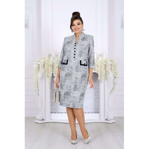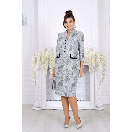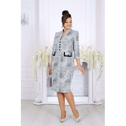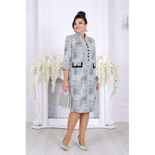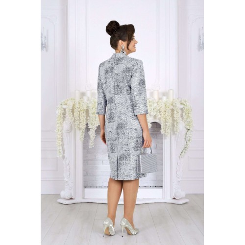 Это платье — настоящий образ для торжества, когда нужна безупречная посадка, статусный вид и ощущение роскоши. Сдержанная, но выразительная ткань с мерцающим напылением придает глубину и праздничный блеск, который выглядит дорого и уместно на свадьбе, юбилее или вечернем приёме. Форма — полуприлегающая, с тщательно продуманными линиями и опорой на женственные пропорции. Рельефы, начинающиеся от пройм, формируют стройные вертикали; V‑образный вырез подчёркивает линию шеи, добавляя лёгкий акцент элегантности. Визуальная центровка фасада вверху и строгие, но нежные детали внизу делают силуэт аккуратным и собранным. Декоративные элементы: аккуратные пуговицы, клапаны с отделочными бейками — они бережно обрамляют талию, создавая «солидный» вид, без лишней пышности. Благодаря этому платье выглядит презентабельно и современно, оставаясь универсальным для любых торжеств, где важна сдержанная роскошь. Для удобства модель выполнена на трикотажной подкладке, а рукава до линии предплечья обеспечивают свободу движений и комфорт по температуре. Платье сохраняет форму, мягко облегает, но не обтягивает — отличный вариант и для больших размеров, и для женщин с формами. Почему это платье стоит выбрать именно сейчас: - праздничный, вечерний и свадебный формат с профессиональным, премиальным внешним видом; - подходит женщинам plus size — корректирует силуэт без компромисса по комфорту; - качественные ткани, аккуратная отделка и продуманный крой; - универсальная длина и стиль, уместные и в зале, и за столом, и на фотосессии. Платье женское, полуприлегающего силуэта, выполнено из жаккардового трикотажного полотна с напылением. Модель на трикотажной подкладке, с плечевыми накладками. Перед отрезной по линии талии: на верхней части обработаны рельефы, направленные от пройм, V-образный вырез и средний шов, декорированный пуговицами; на нижней части обработаны талиевые вытачки и настрочены клапаны с бейками по краю и пуговицами по центру. Спинка отрезная по линии талии; на верхней части обработаны рельефы, направленные от пройм, на нижней – талиевые вытачки и средний шов со шлицей. Горловина оформлена стойкой с закругленными концами. Застежка на потайную тесьму молнию расположена в среднем шве спинки и переходит на стойку. Рукав втачной, трехчетвертной. Бейки клапанов и обтяжные пуговицы выполнены из отделочного трикотажного полотна. Длина платья – 106 см; длина рукава – 45 см.