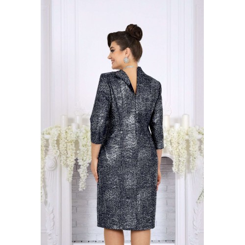 Это платье — настоящий образ для торжества, когда нужна безупречная посадка, статусный вид и ощущение роскоши. Сдержанная, но выразительная ткань с мерцающим напылением придает глубину и праздничный блеск, который выглядит дорого и уместно на свадьбе, юбилее или вечернем приёме. Форма — полуприлегающая, с тщательно продуманными линиями и опорой на женственные пропорции. Рельефы, начинающиеся от пройм, формируют стройные вертикали; V‑образный вырез подчёркивает линию шеи, добавляя лёгкий акцент элегантности. Визуальная центровка фасада вверху и строгие, но нежные детали внизу делают силуэт аккуратным и собранным. Декоративные элементы: аккуратные пуговицы, клапаны с отделочными бейками — они бережно обрамляют талию, создавая «солидный» вид, без лишней пышности. Благодаря этому платье выглядит презентабельно и современно, оставаясь универсальным для любых торжеств, где важна сдержанная роскошь. Для удобства модель выполнена на трикотажной подкладке, а рукава до линии предплечья обеспечивают свободу движений и комфорт по температуре. Платье сохраняет форму, мягко облегает, но не обтягивает — отличный вариант и для больших размеров, и для женщин с формами. Почему это платье стоит выбрать именно сейчас: - праздничный, вечерний и свадебный формат с профессиональным, премиальным внешним видом; - подходит женщинам plus size — корректирует силуэт без компромисса по комфорту; - качественные ткани, аккуратная отделка и продуманный крой; - универсальная длина и стиль, уместные и в зале, и за столом, и на фотосессии. Платье женское, полуприлегающего силуэта, выполнено из жаккардового трикотажного полотна с напылением. Модель на трикотажной подкладке, с плечевыми накладками. Перед отрезной по линии талии: на верхней части обработаны рельефы, направленные от пройм, V-образный вырез и средний шов, декорированный пуговицами; на нижней части обработаны талиевые вытачки и настрочены клапаны с бейками по краю и пуговицами по центру. Спинка отрезная по линии талии; на верхней части обработаны рельефы, направленные от пройм, на нижней – талиевые вытачки и средний шов со шлицей. Горловина оформлена стойкой с закругленными концами. Застежка на потайную тесьму молнию расположена в среднем шве спинки и переходит на стойку. Рукав втачной, трехчетвертной. Бейки клапанов и обтяжные пуговицы выполнены из отделочного трикотажного полотна. Длина платья – 106 см; длина рукава – 45 см.