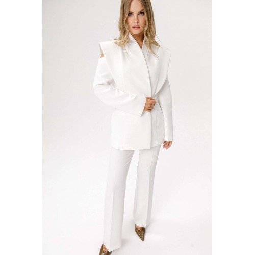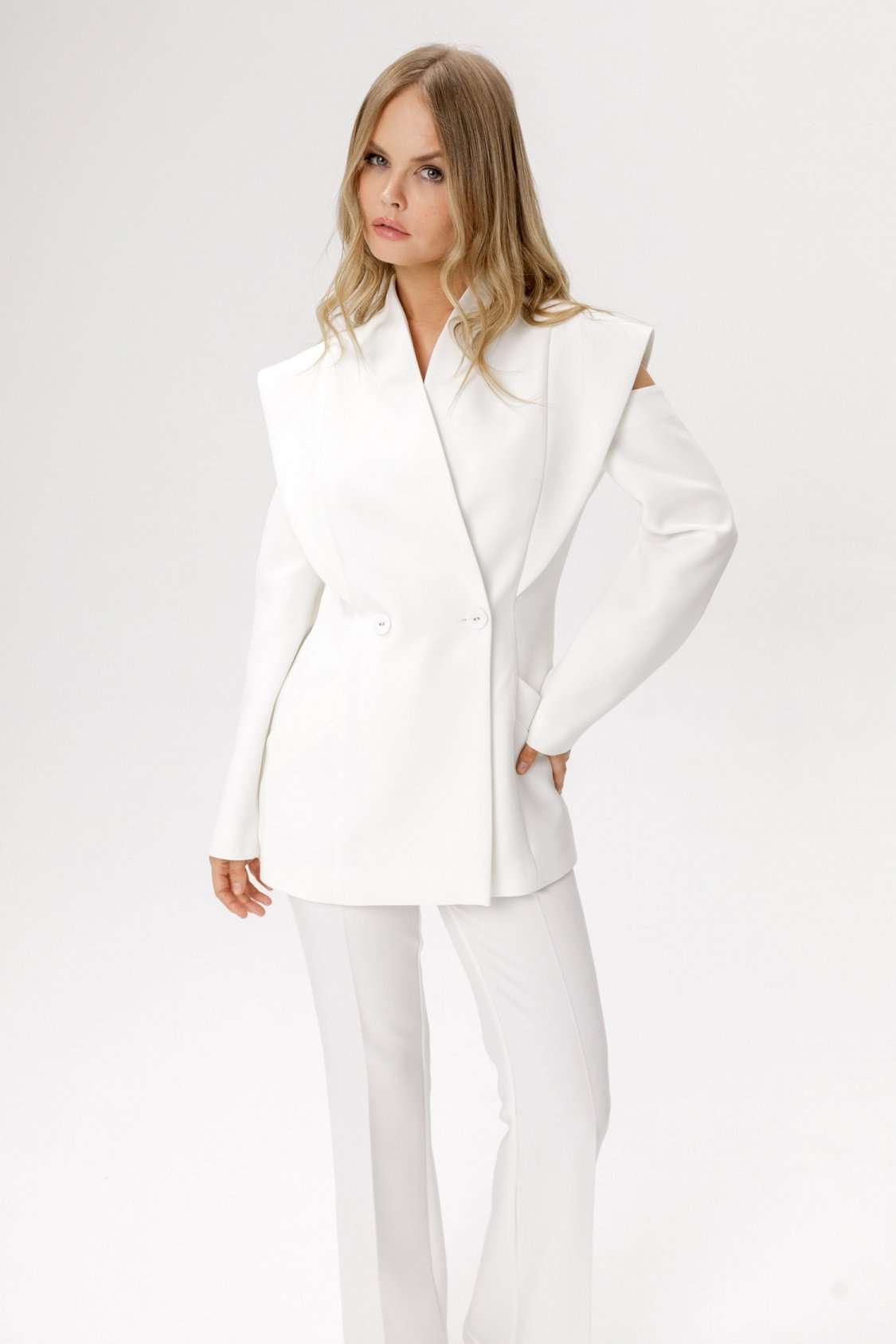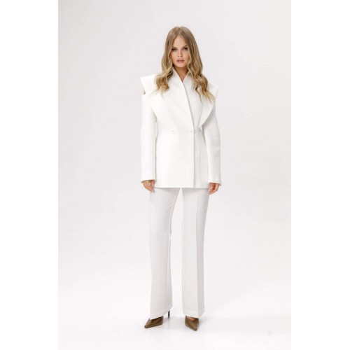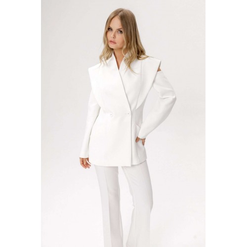Приталенный двубортный жакет. Детали: полуприлегающий силуэт, цельнокроеный воротник-стойка, двубортная застёжка на петли и пуговицы, рельефные швы переда и спинки с декоративным элементом, рукава длинные с вырезами по верху, функциональные карманы, жакет на подкладке. Длина изделия по спинке в размерах 40-46 около 71 см, в размерах 48-52 около 74 см, длина рукава около 61 см