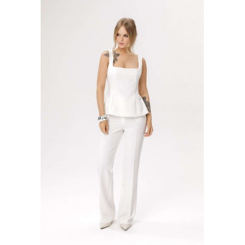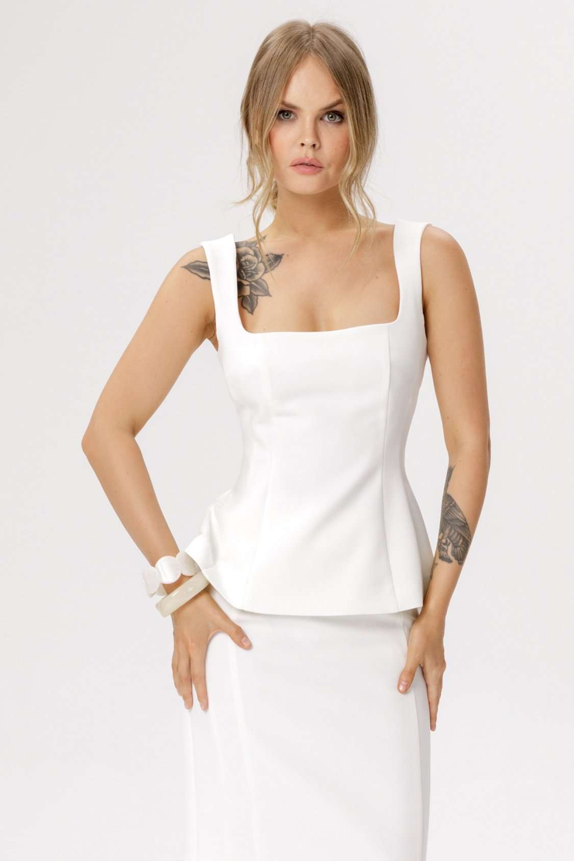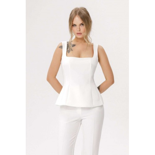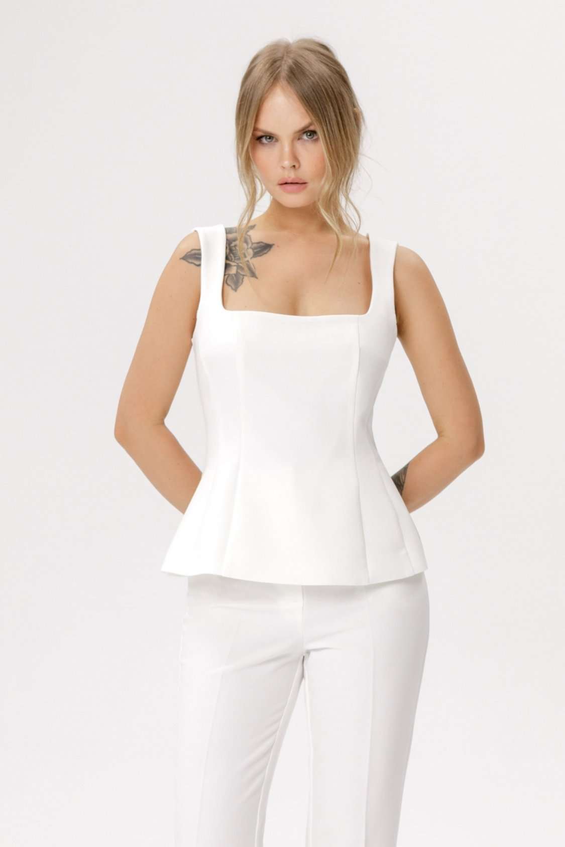 Приталенная блуза с вырезом «каре» (приобрести кейп с фото можно по арт. 6640, приобрести юбку с фото можно по арт. 6644). Детали: прилегающий силуэт, кареобразный вырез горловины переда и спинки, рельефные швы, потайная застежка по спинке, на подкладке. Длина по боковому шву около 56 см в размерах 40-46, около 58,5 см в размерах 48-52.
