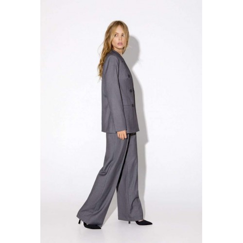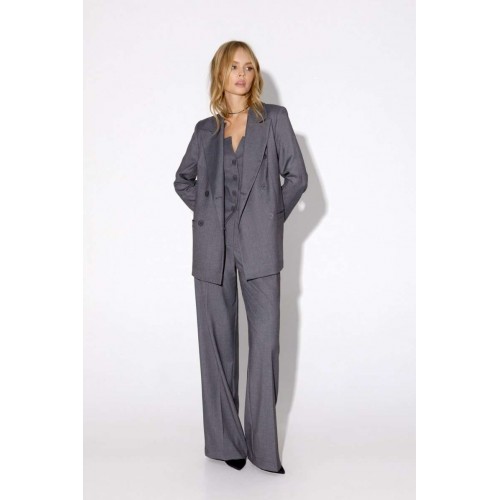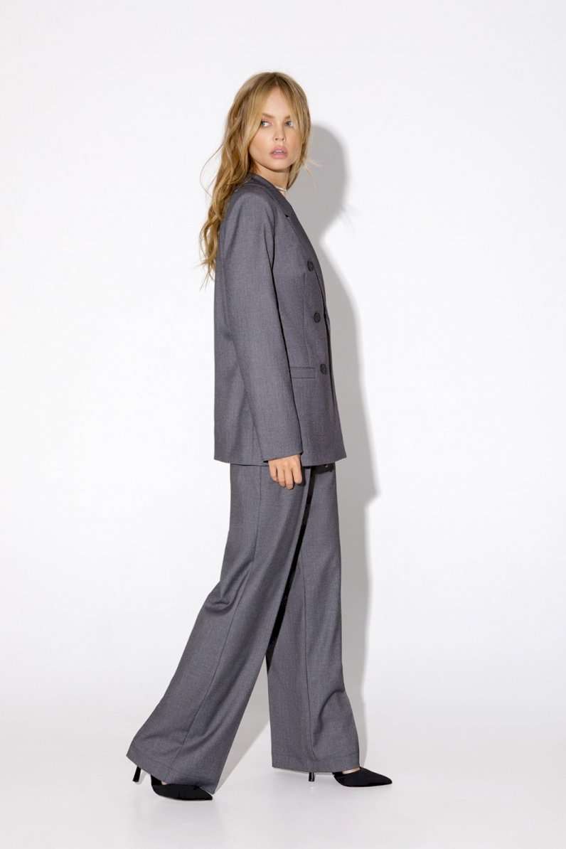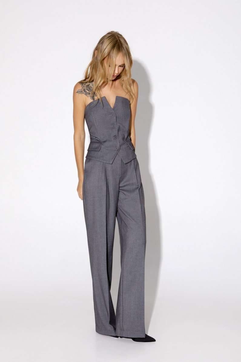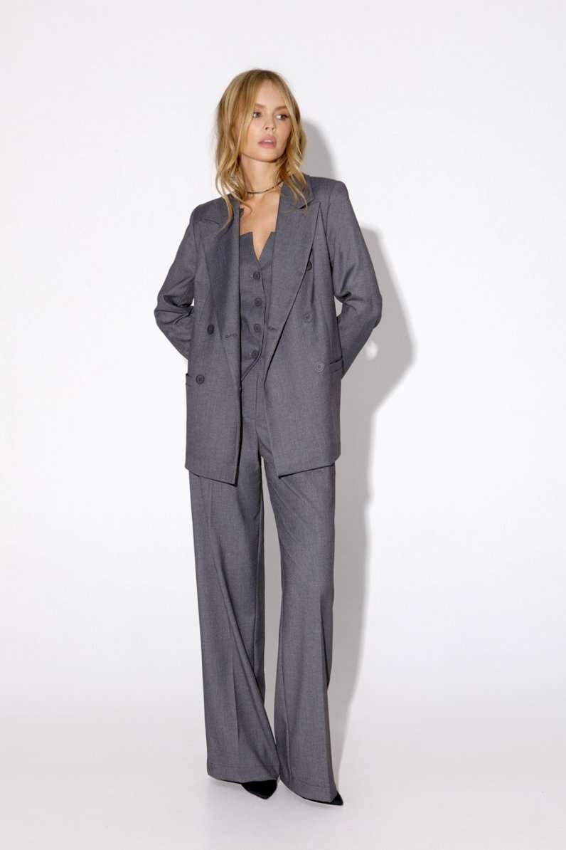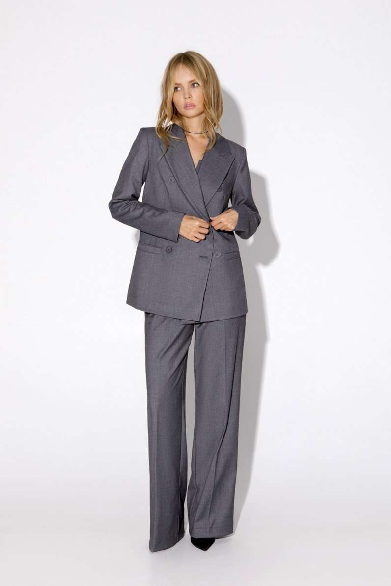 Текстильный костюм-тройка из классического двубортного жакета, топа-корсета и прямых брюк-палаццо со стрелками. Детали: жакет полуприлегающего силуэта, пиджачный воротник, перед с прорезными карманами, двубортная застежка на петли и пуговицы, спинка со средним швом, рукава втачные двухшовные, жакет на подкладке. Топ-корсет прилегающего силуэта, рельефные швы с регилином, функциональные карманы, застежка по переду на петли и пуговицы, спинка с эластичной вставкой, фигурный низ. Брюки с высокой посадкой на притачном поясе со шлевками, застежка на молнию и пуговицу, боковые карманы, передние половины с заутюженными стрелками и двумя небольшими складками. Подходит на рост 158-174 см. Длина жакета по спинке около 66 см в размерах 40-46 и около 69 см в размерах 48-52. Длина рукавов около 61 см. Длина топа по спинке около 27,5 см в размерах 40-46 и около 29 см в размерах 48-52. Длина брюк по боковому шву с поясом около 113 см в размерах 40-46 и около 114,5 см в размерах 48-52. Длина брюк по внутреннему шву около 82 см.