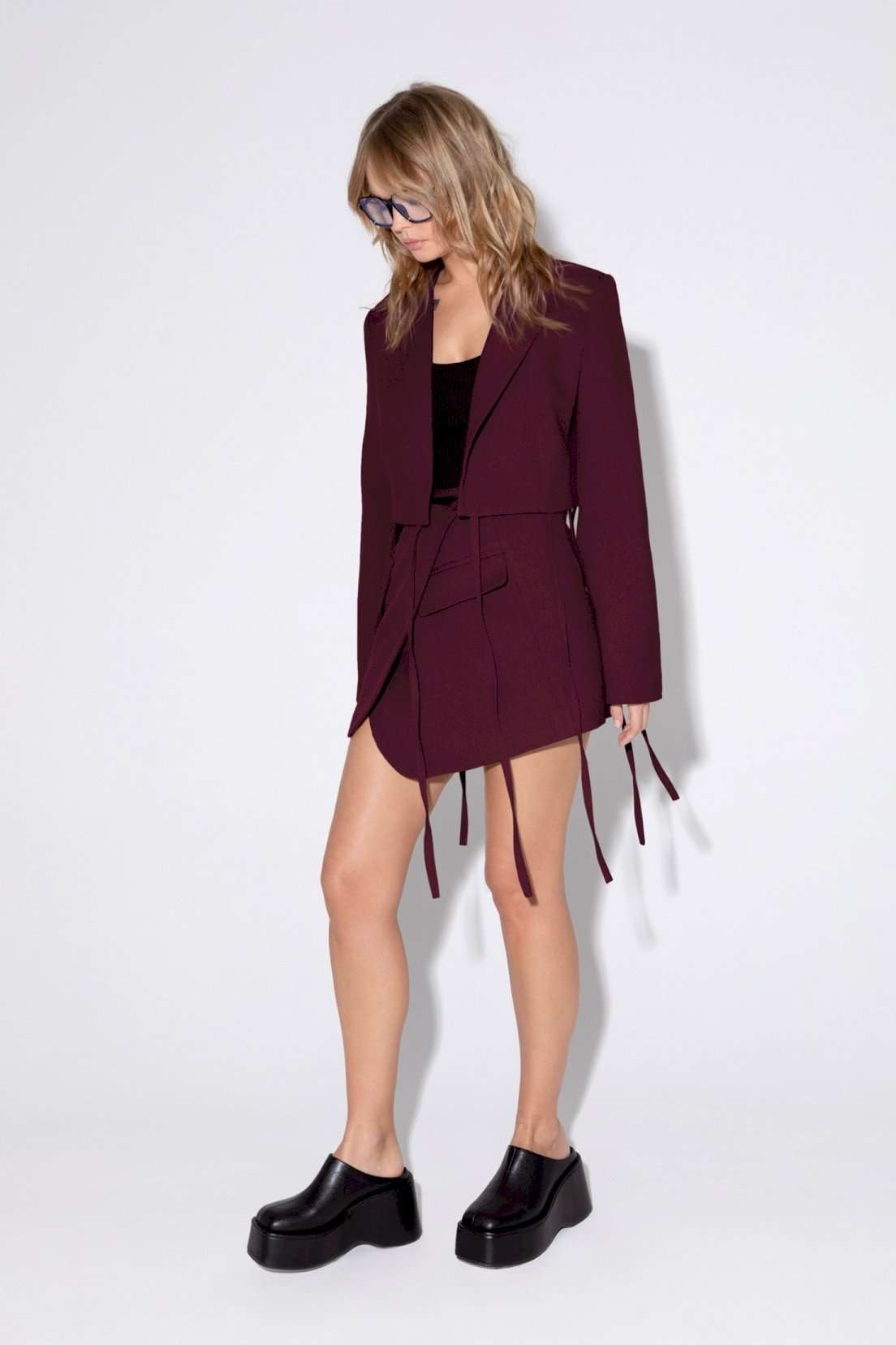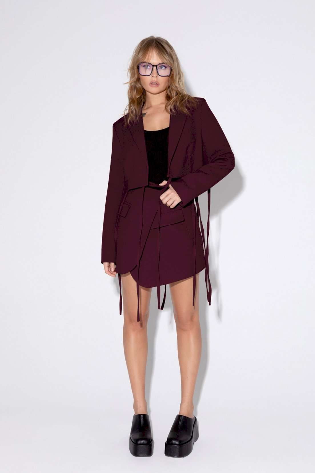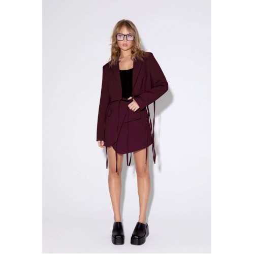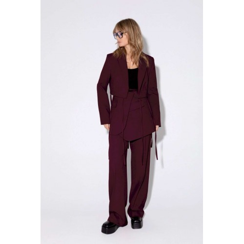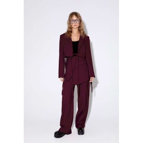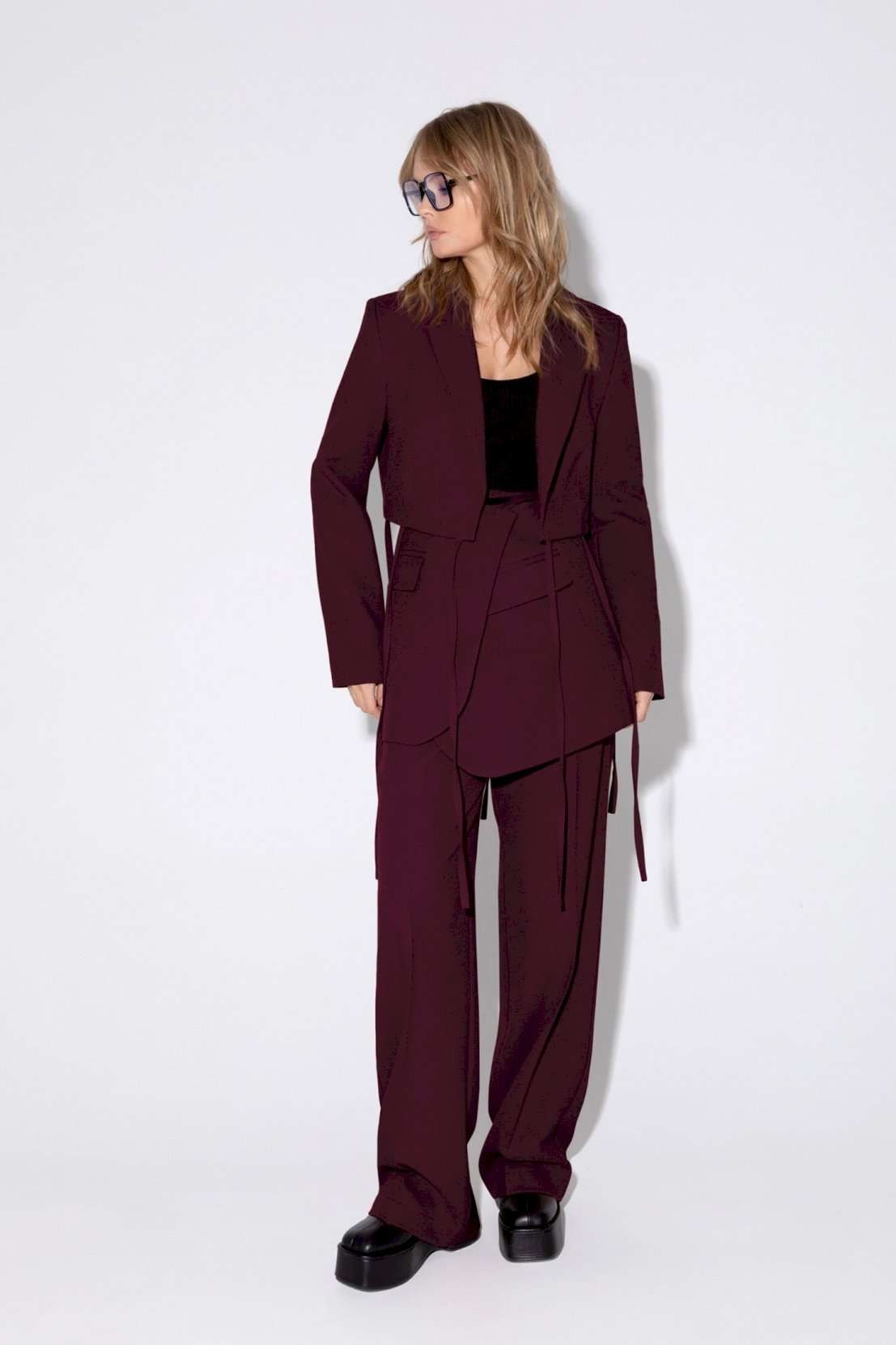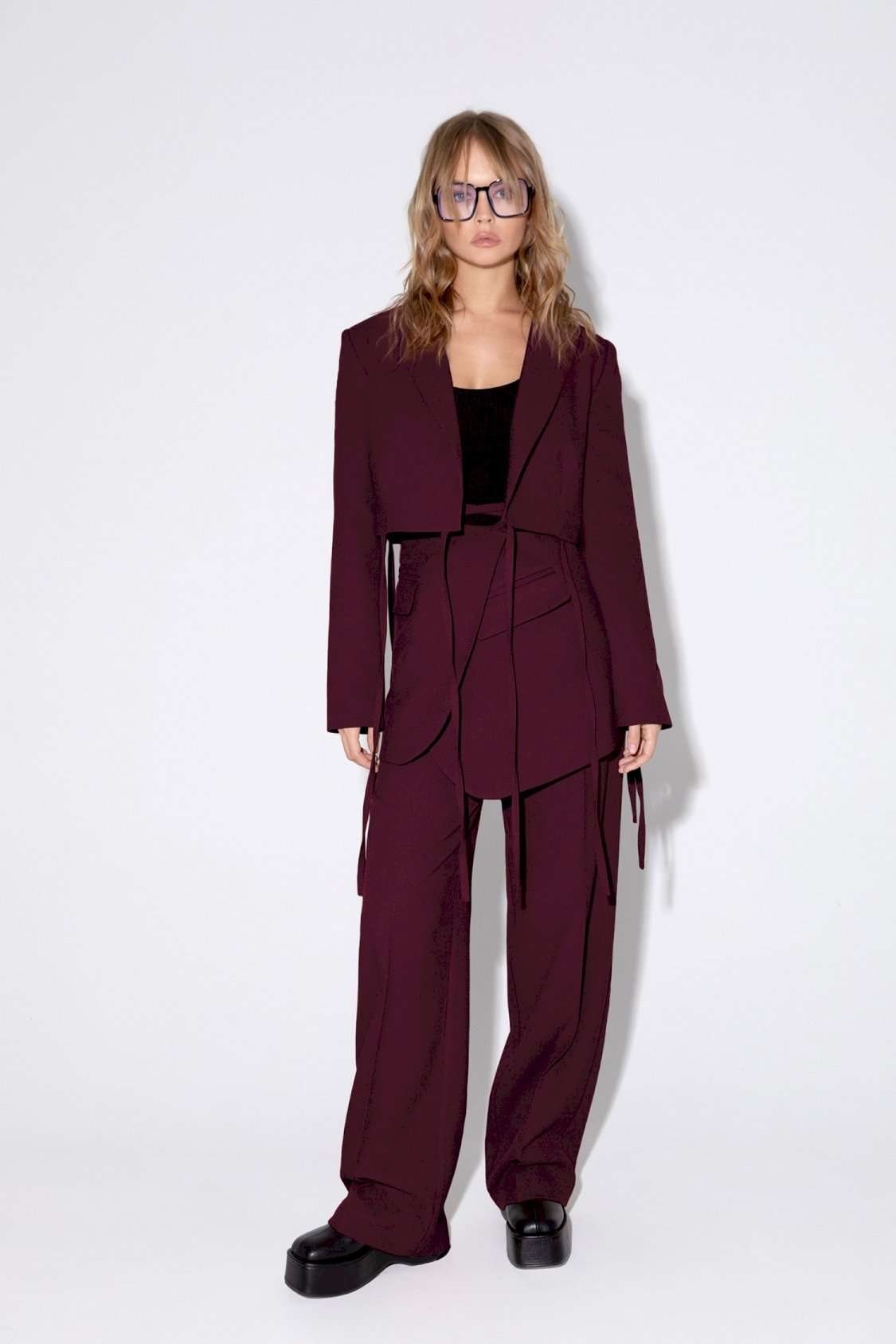Комплект-тройка из свободного жакета с отделкой, базовой трикотажной майки и брюк-палаццо со стрелками. Детали: жакет прямого силуэта, пиджачный воротник, талиевые вытачки, прорезные карманы с клапанами, спинка со средним швом, рукава втачные двухшовные, жакет на подкладке. Майка из трикотажа- «лапша», глубокие вырезы горловины и пройм. Брюки с высокой посадкой на притачном поясе со шлевками, застежка на молнию и пуговицу, боковые карманы, передние половины с заутюженными стрелками и двумя небольшими складками. Подходит на рост 158-174 см. Длина жакета по спинке около 76 см в размерах 40-46 и около 79 см в размерах 48-52. Ддлина рукавов около 61 см. Длина майки от плечевого шва около 37 см в размерах 40-46 и около 39 см в размерах 48-52. Длина брюк по боковому шву с поясом около 113 см в размерах 40-46 и около 114,5 см в размерах 48-52. Длина по внутреннему шву около 82 см.