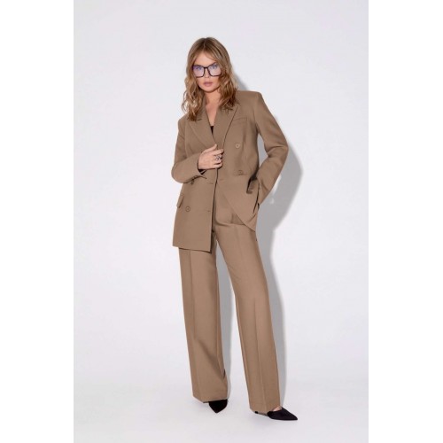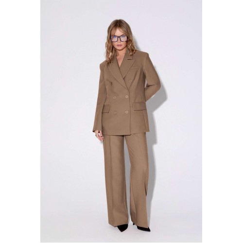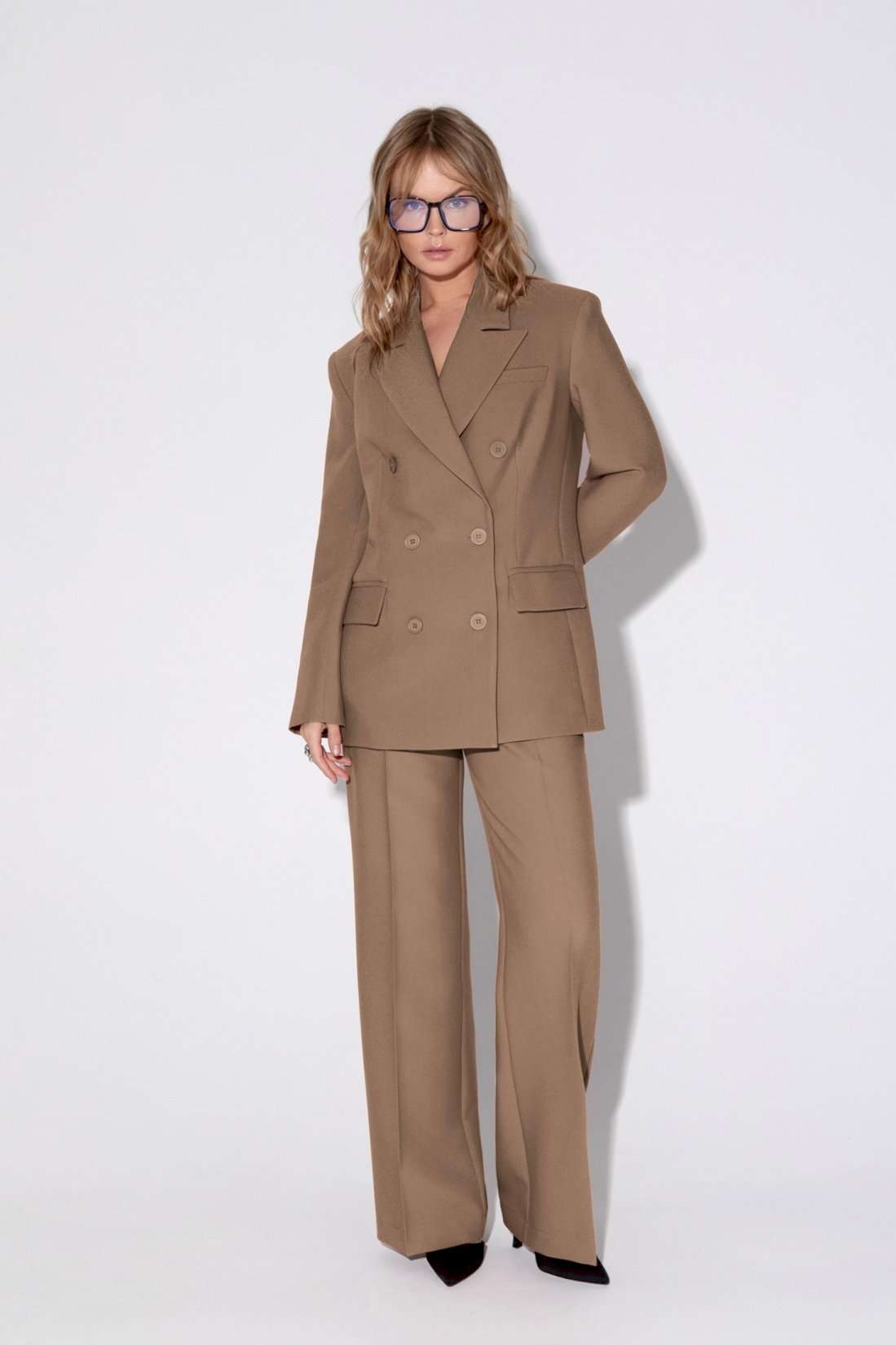 Детали: жакет свободного покроя и полуприлегающего силуэта, двубортная застежка на петли и пуговицы, отрезные бочки, пиджачный воротник, функциональные карманы, жакет на подкладке. Длина жакета по спинке около 69 в размерах 40-46 и около 72 см в размерах 48-52. Длина рукавов около 62 см.