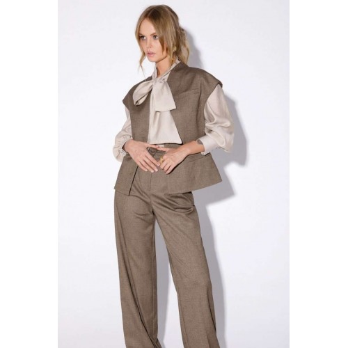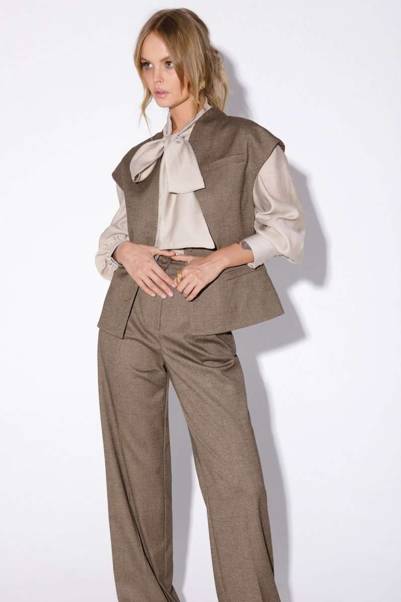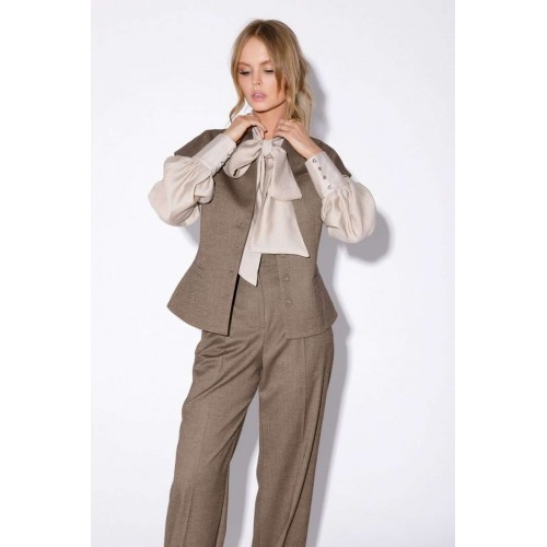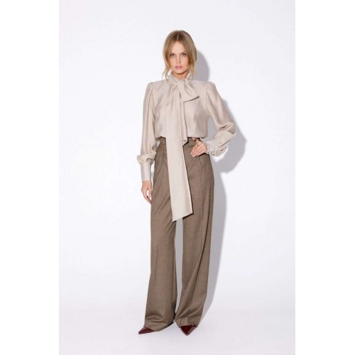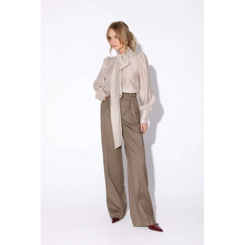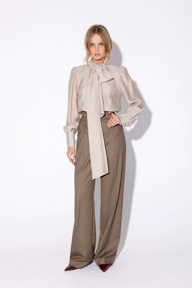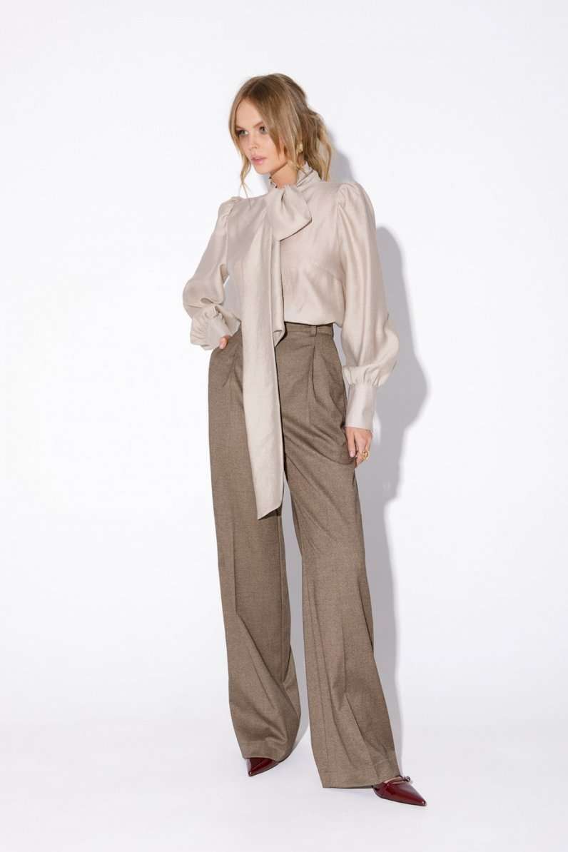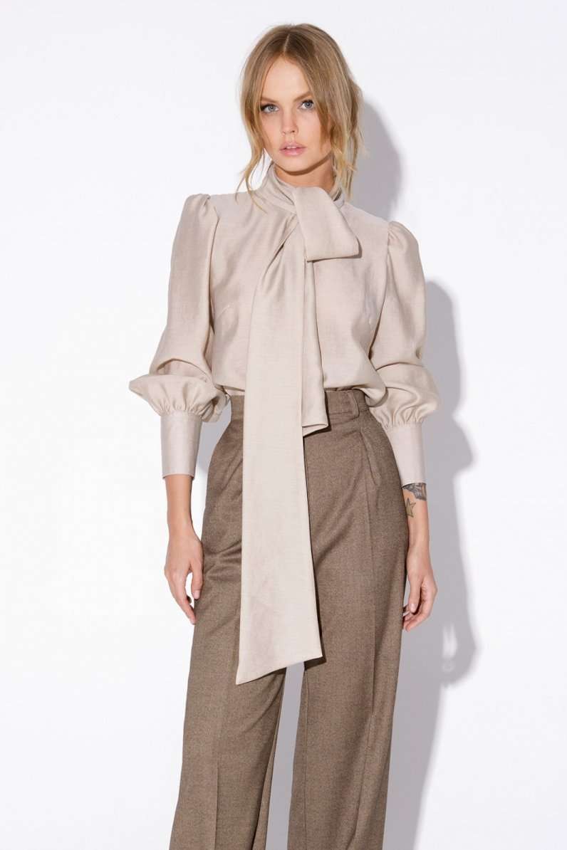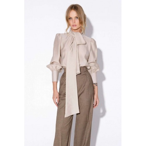 Блуза из полупрозрачной вискозы с воротником-бантом. Детали: прямой силуэт, нагрудные вытачки, рукава длинные объемные со сборкой и высокими притачными манжетами с застежкой на навесные петли и декоративные пуговицы, блуза без застежки. Длина по спинке около 59,5 см в размерах 40-46 и около 61,5 см в размерах 48-52, длина рукава около 63 см.