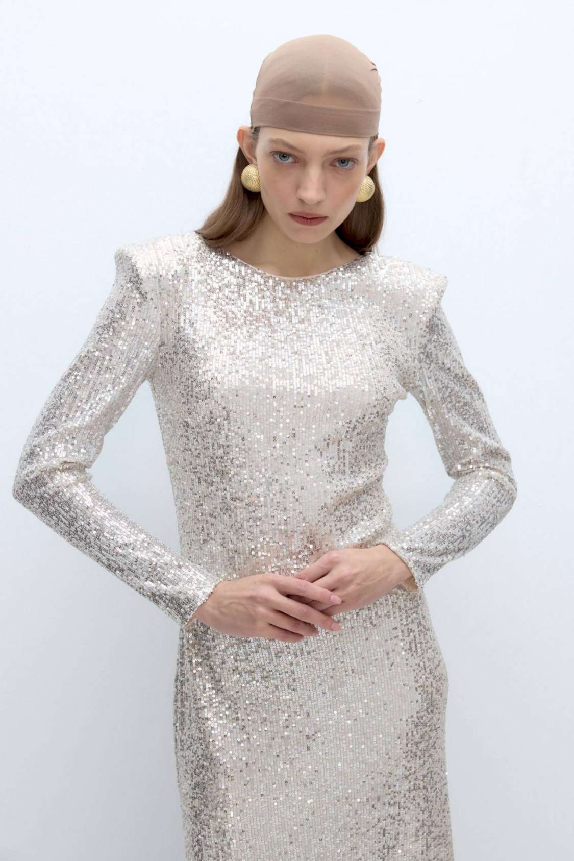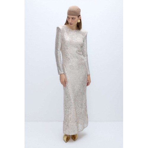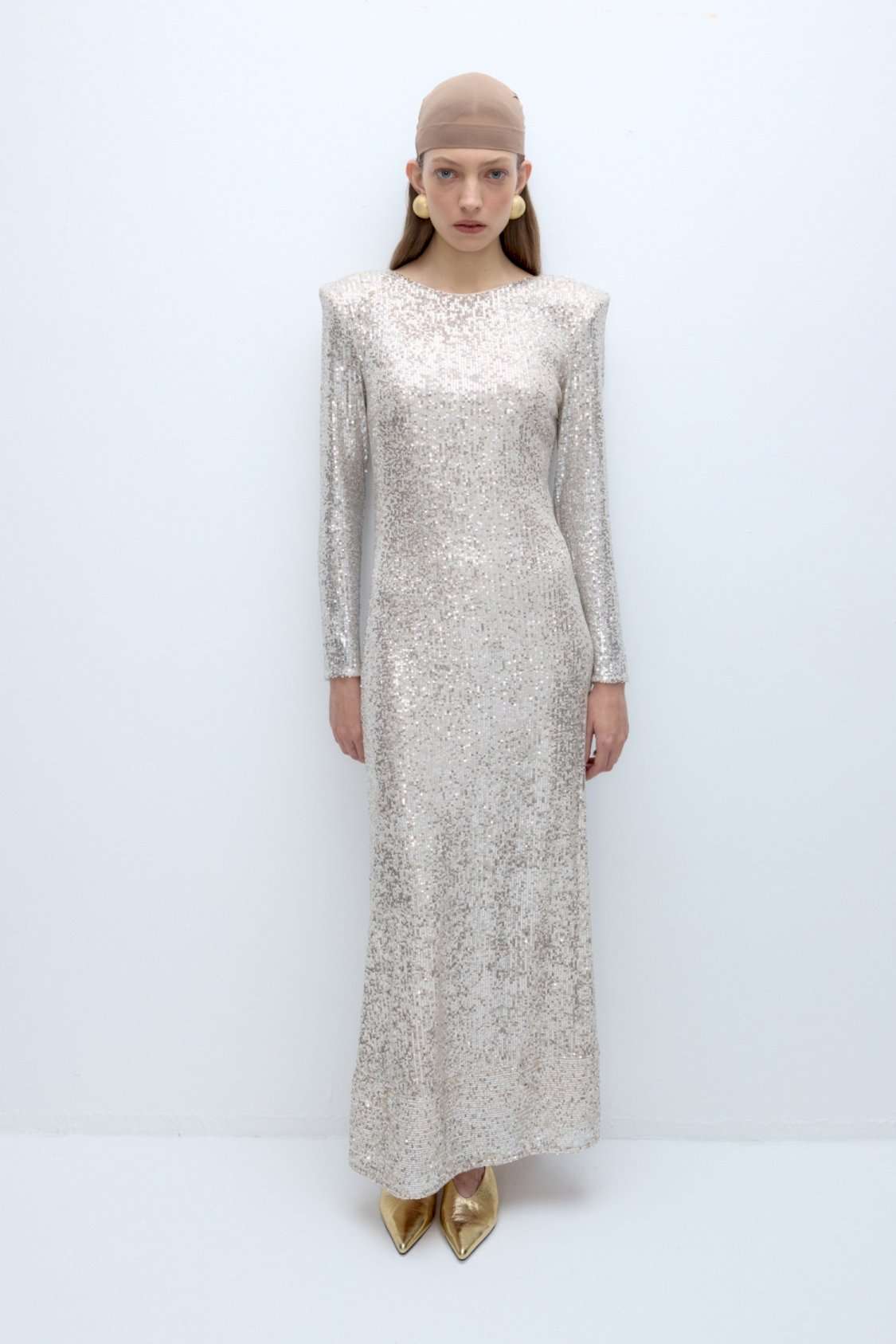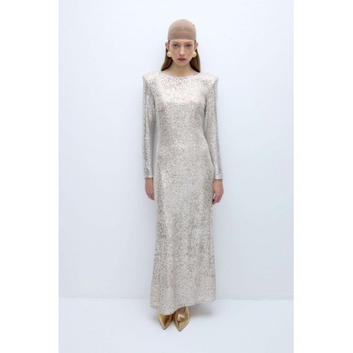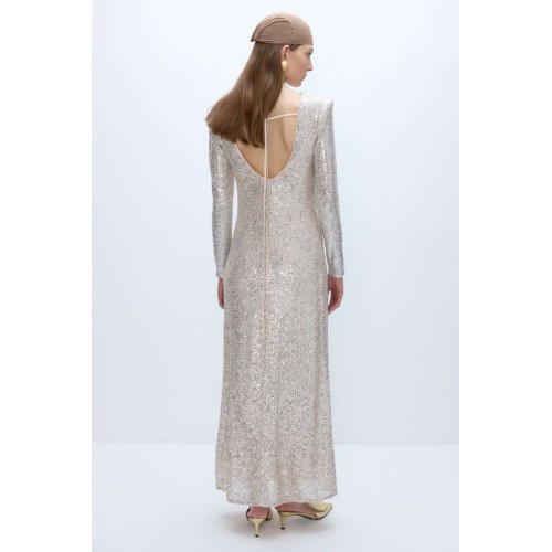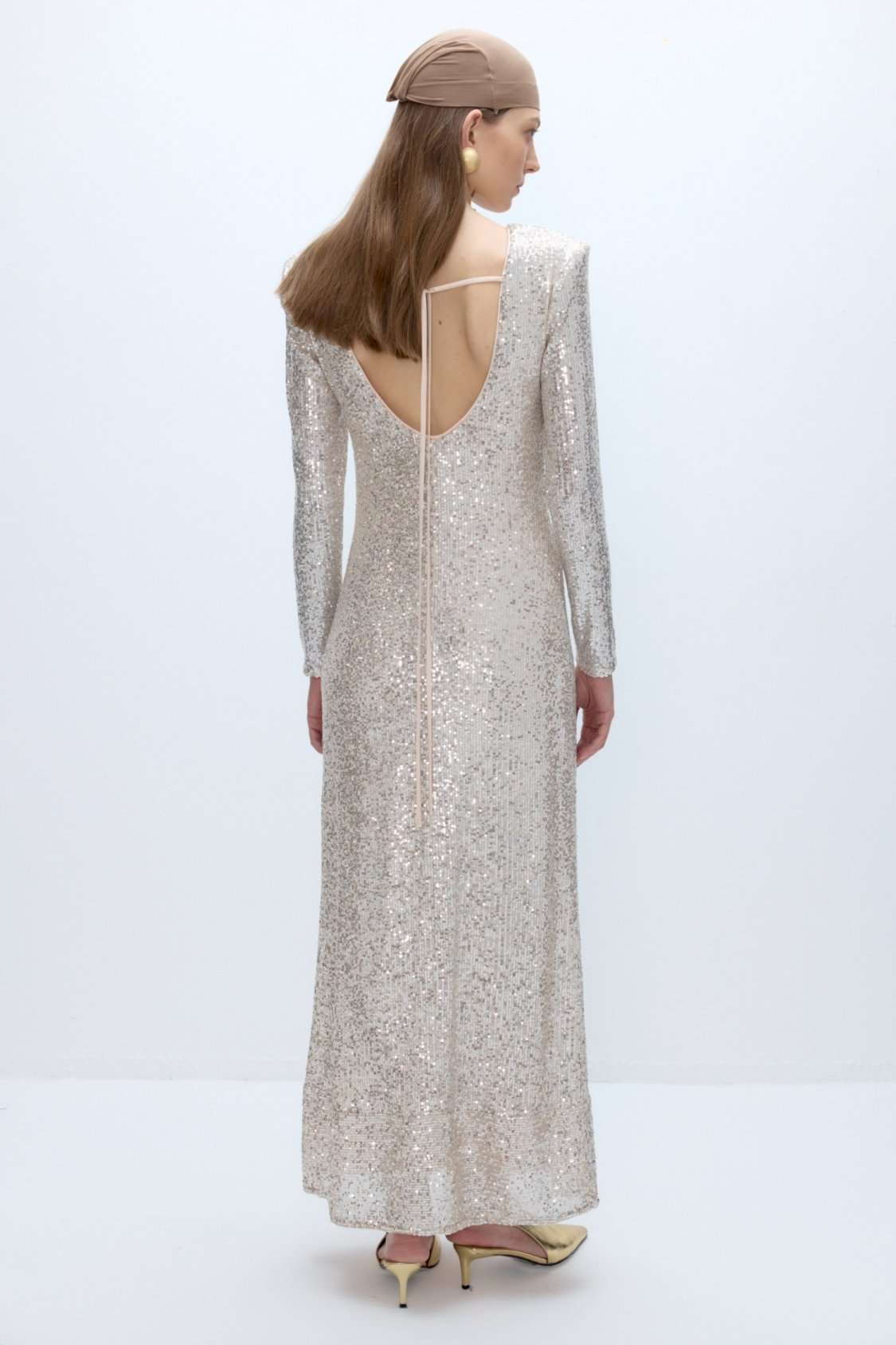 Макси-платье прилегающего силуэта из ткани в пайетки. Детали: прилегающий силуэт, фигурный вырез спинки, втачные длинные рукава, без застежки, платье на подкладке.