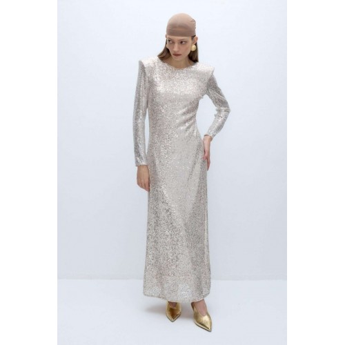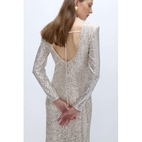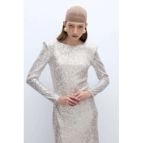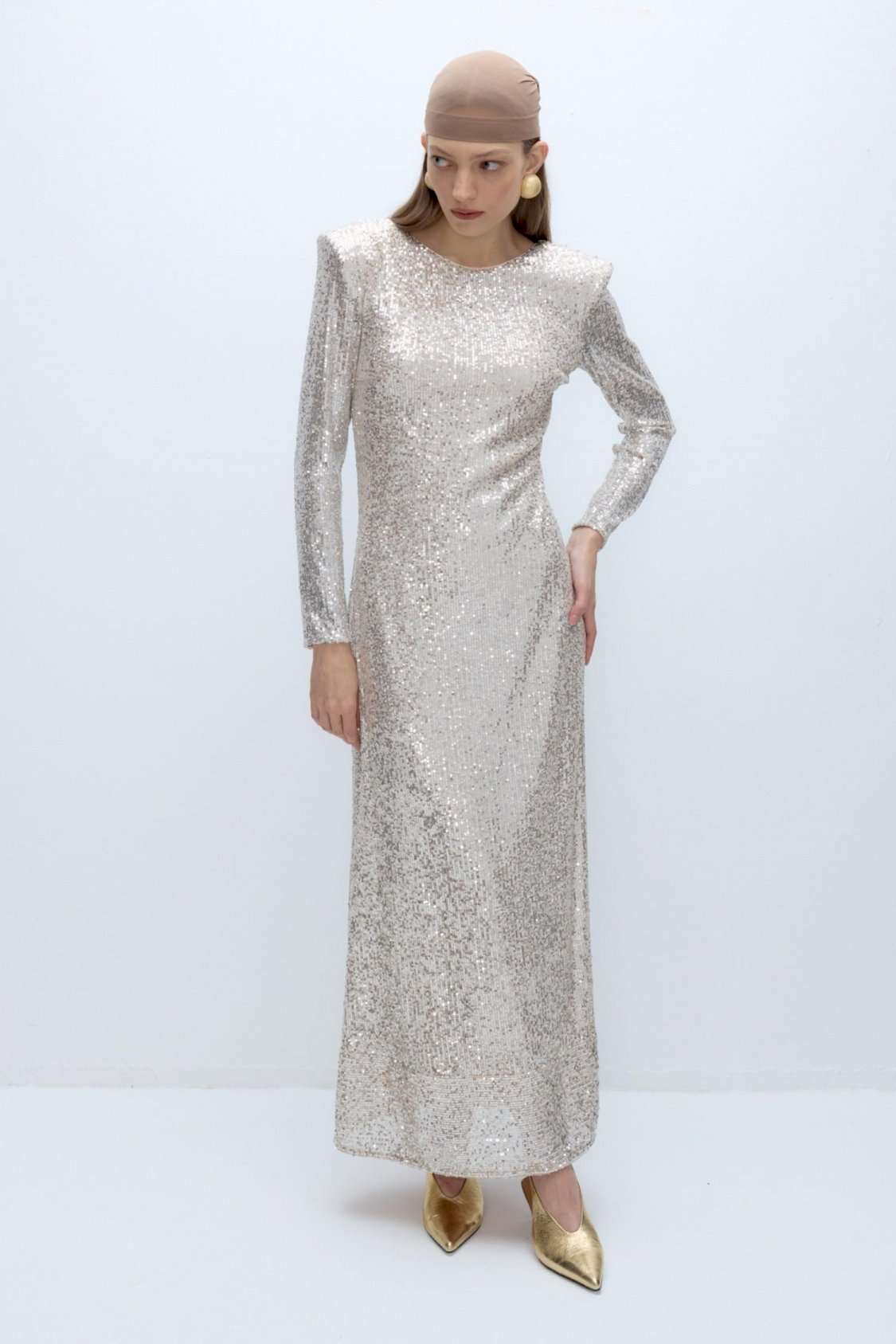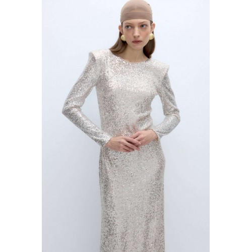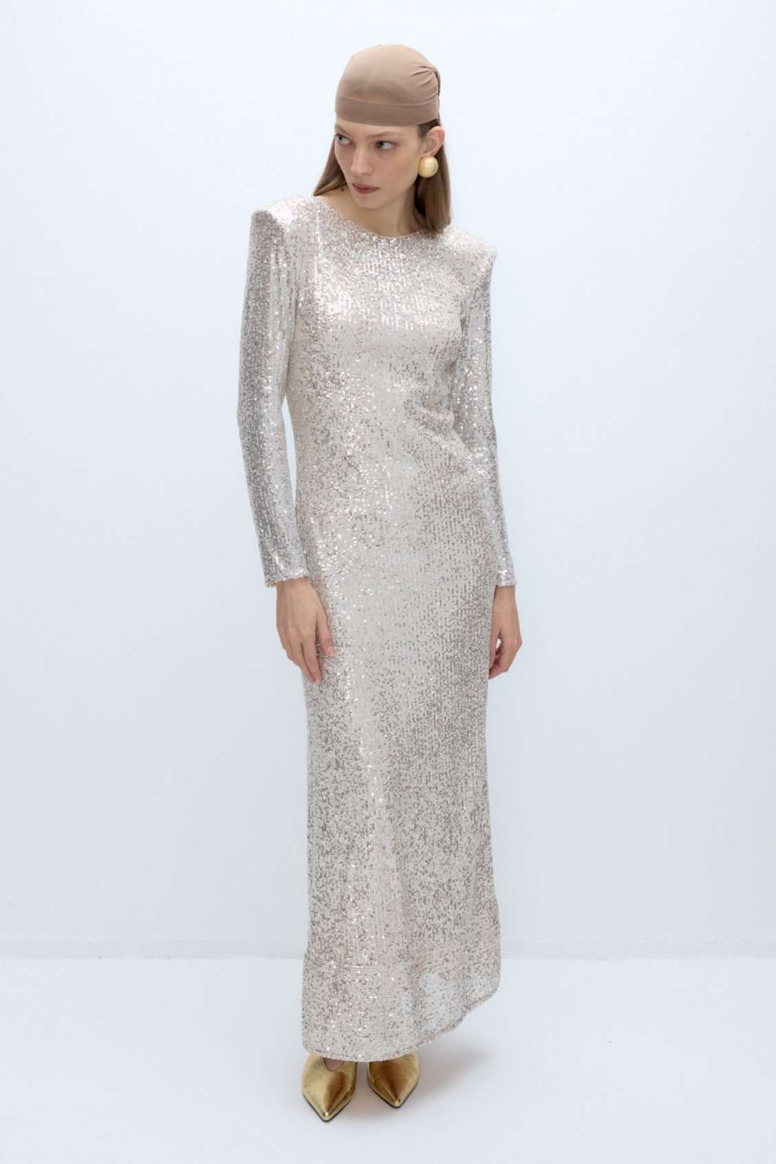 Макси-платье прилегающего силуэта из ткани в пайетки. Детали: прилегающий силуэт, фигурный вырез спинки, втачные длинные рукава, без застежки, платье на подкладке.