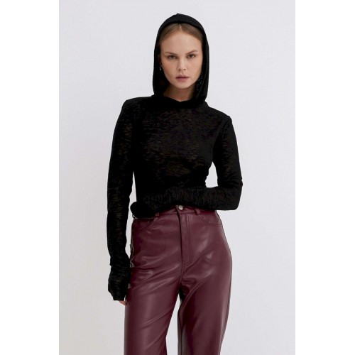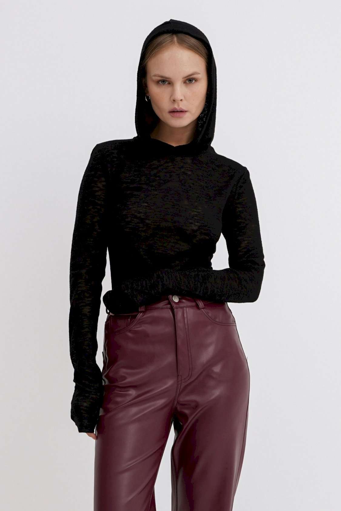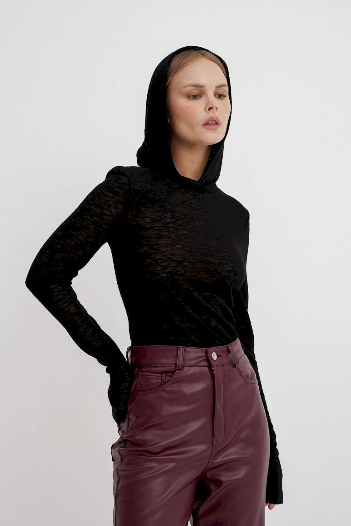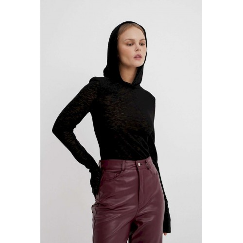 Базовый лонгслив с капюшоном из полупрозрачного трикотажа. Детали: лонгслив прямого силуэта, втачные удлиненные рукава. Перед и спинка удлиненные, что позволяет формировать драпировку по талии. Длина изделия спинке около 66 см. Длина рукава около 70 см.