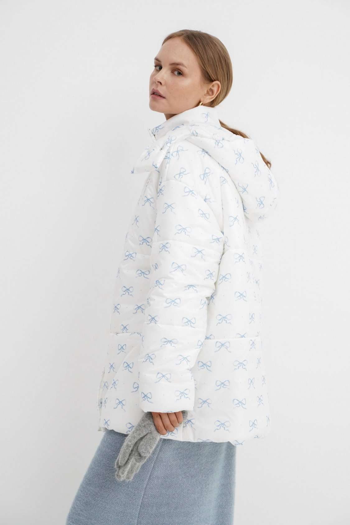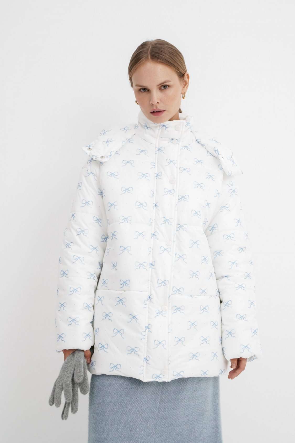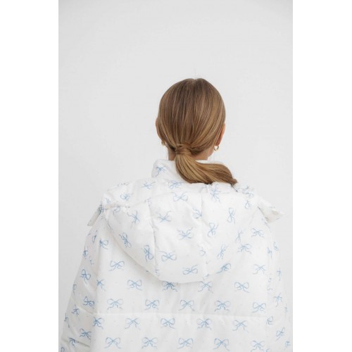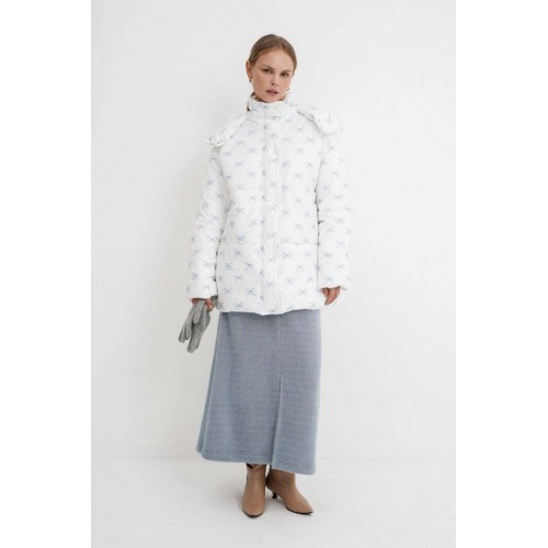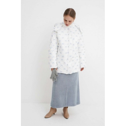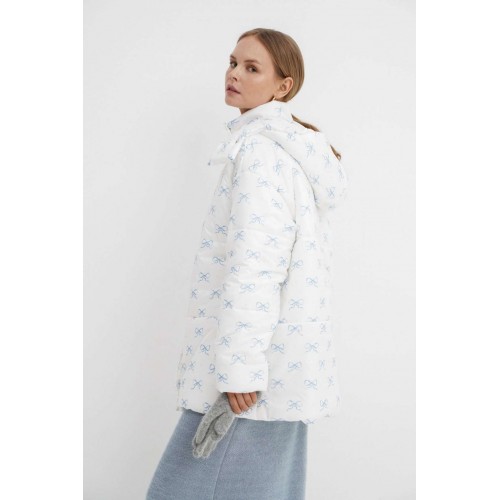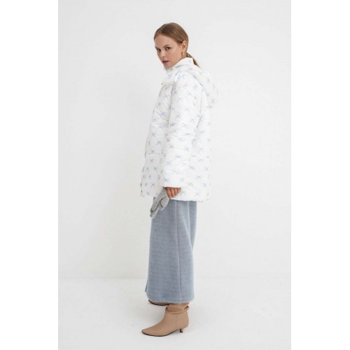 Стеганая оверсайз куртка с принтом. Детали: прямой силуэт, свободый покрой, спущенная линия плеча, капюшон, функциональные карманы, застежка на молнию и пробивные металлические кнопки, куртка на утепленной синтепоном подкладке. Наполнитель куртки - ISOSOFT толщиной 200 г/м2. Длина куртки по спинке около 71 см.