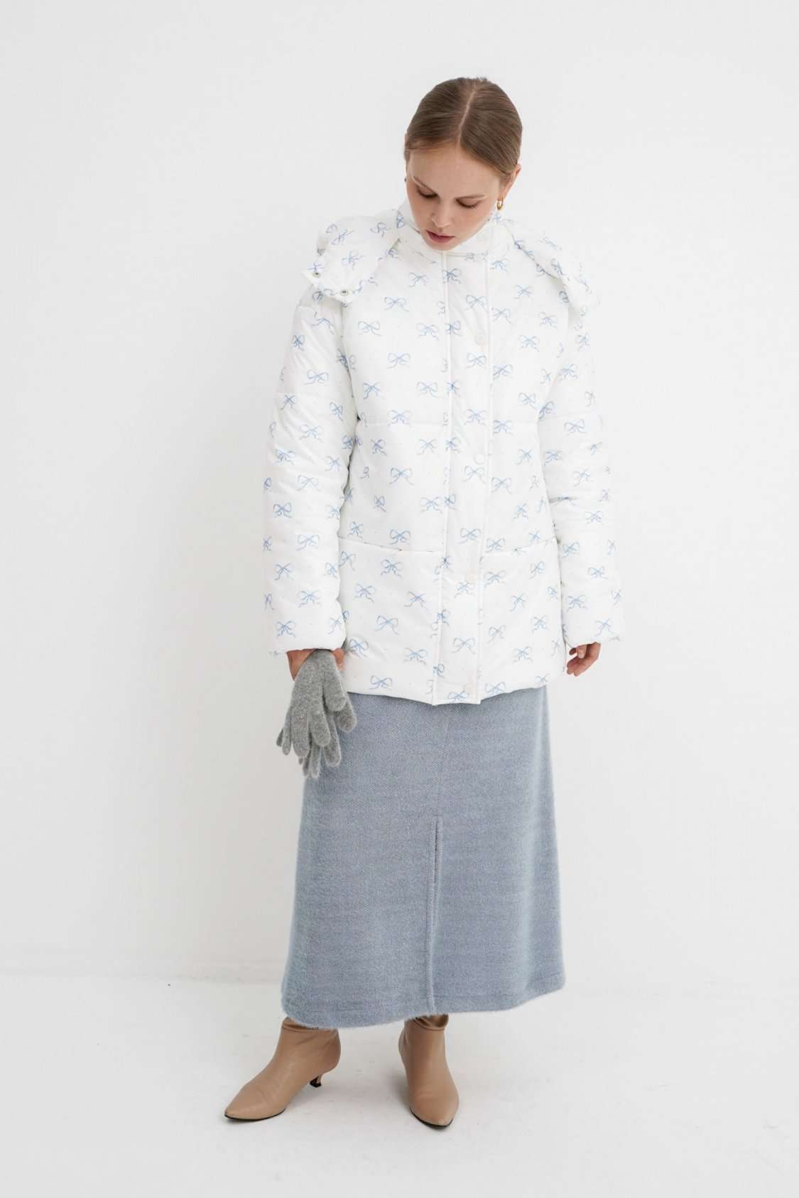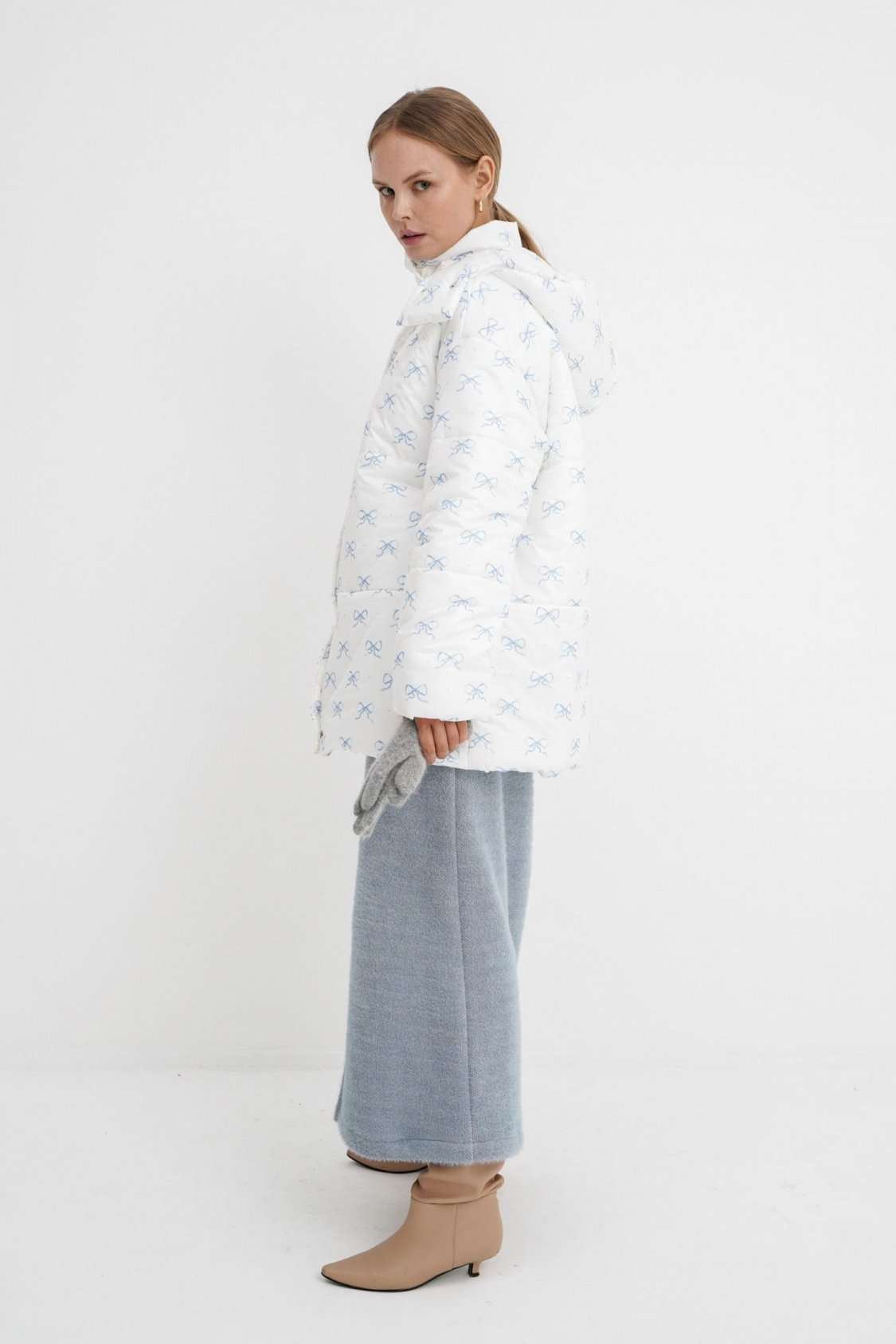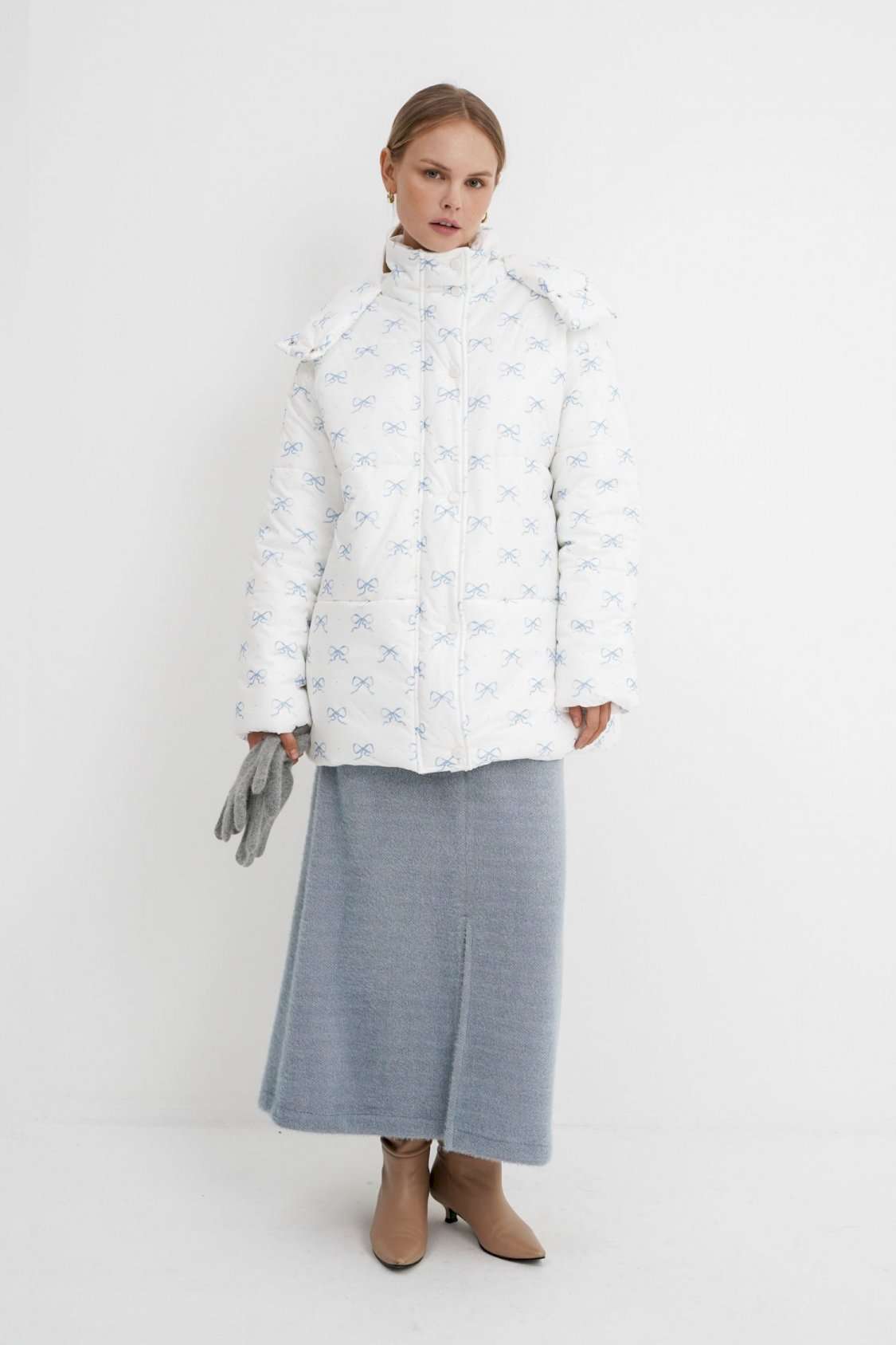 Стеганая оверсайз куртка с принтом. Детали: прямой силуэт, свободый покрой, спущенная линия плеча, капюшон, функциональные карманы, застежка на молнию и пробивные металлические кнопки, куртка на утепленной синтепоном подкладке. Наполнитель куртки - ISOSOFT толщиной 200 г/м2. Длина куртки по спинке около 71 см.