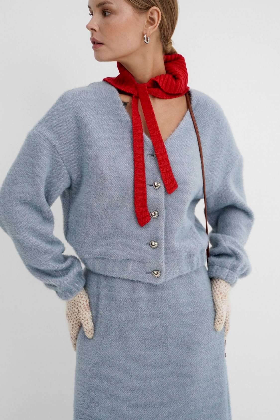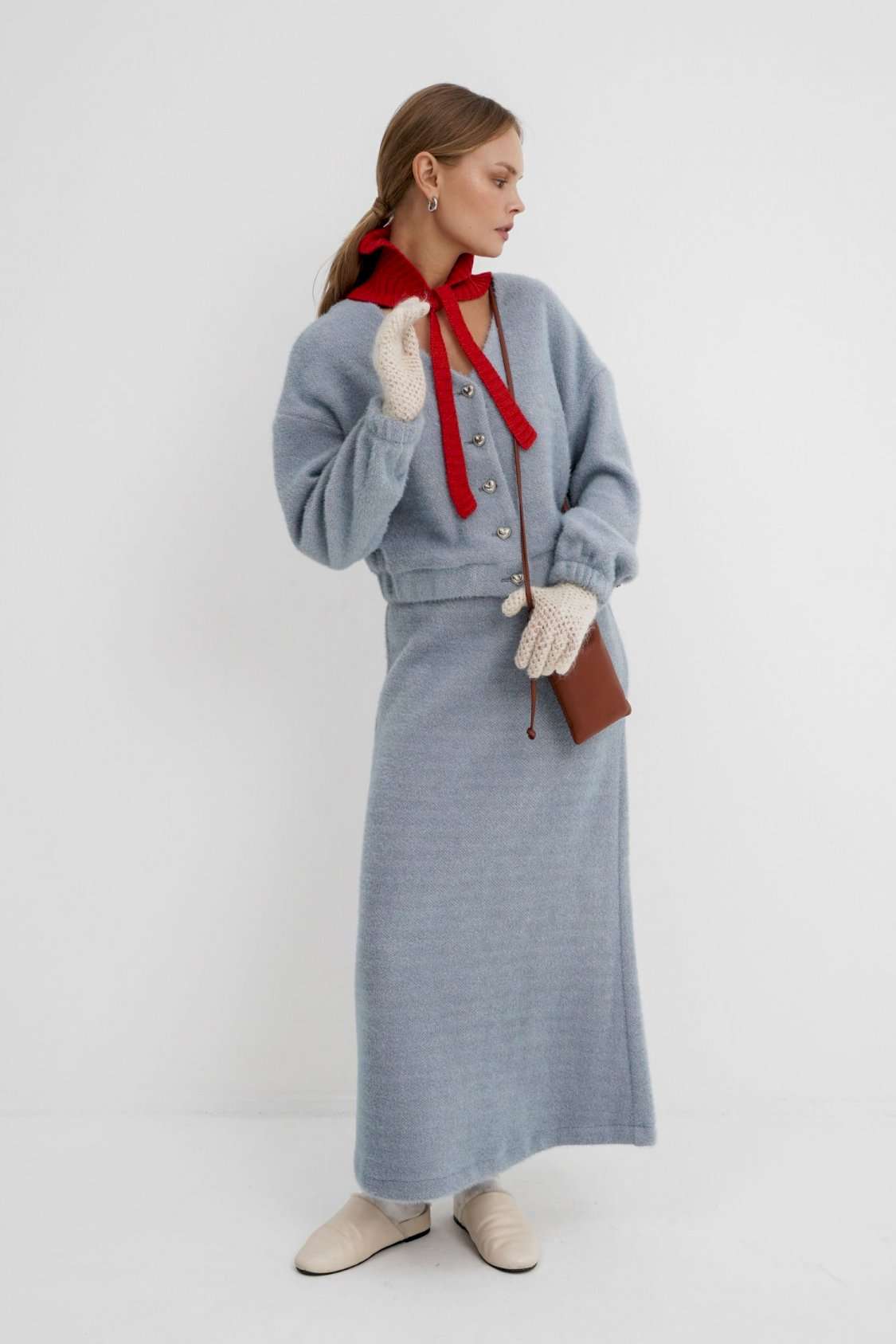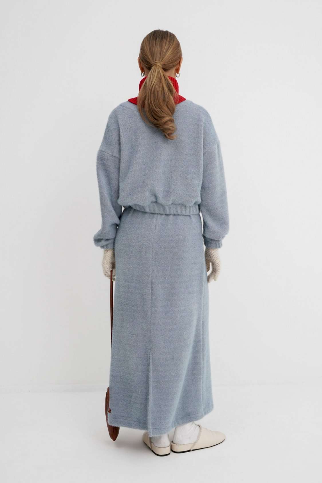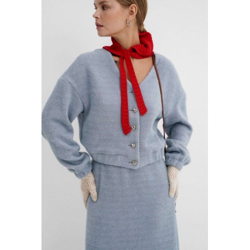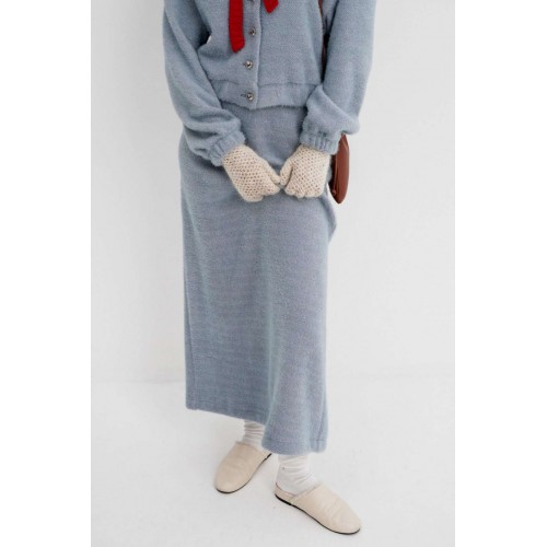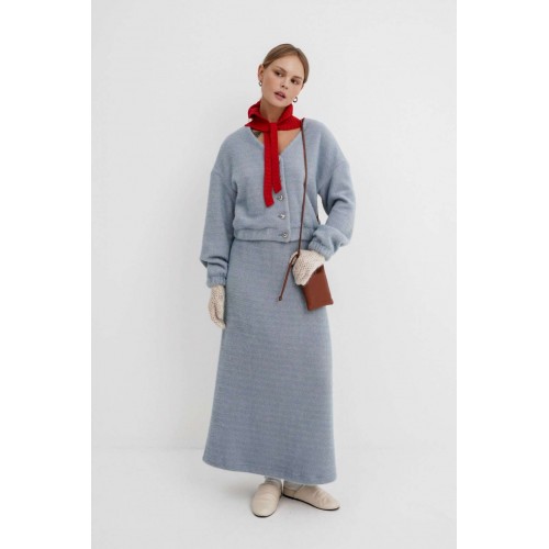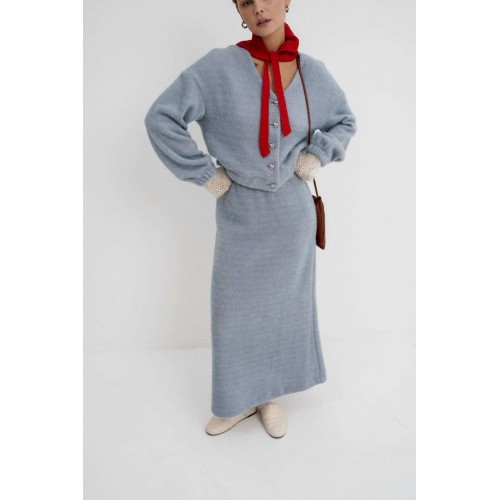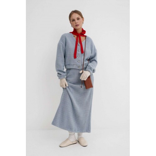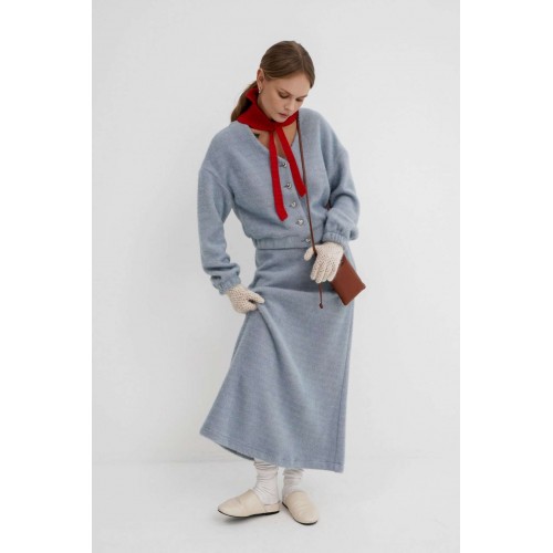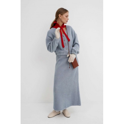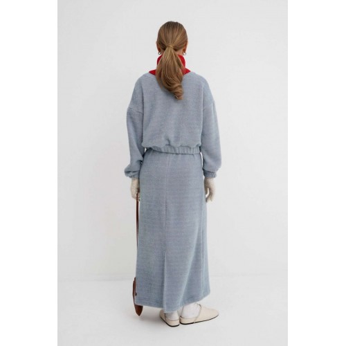 Костюм-двойка из укороченного бомбера и юбки из пушистой ткани. Детали: спущенная линия плеча, V-образный вырез горловины переда, застежка на петли и декоративные пуговицы, рукава и низ бомбера на резинке, подкладка. Юбка трапециевидного силуэта, пояс на резинке и без застежки, низ юбки с разрезом, без подкладки. Длина бомбера по спинке около 47 см в размерах 40-46 и около 50 см в размерах 48-52. Длина рукава со спущенным плечом около 47+13 см. Длина юбки по боковому шву с поясом около 92 см.