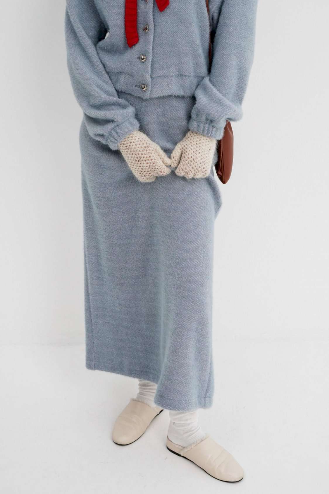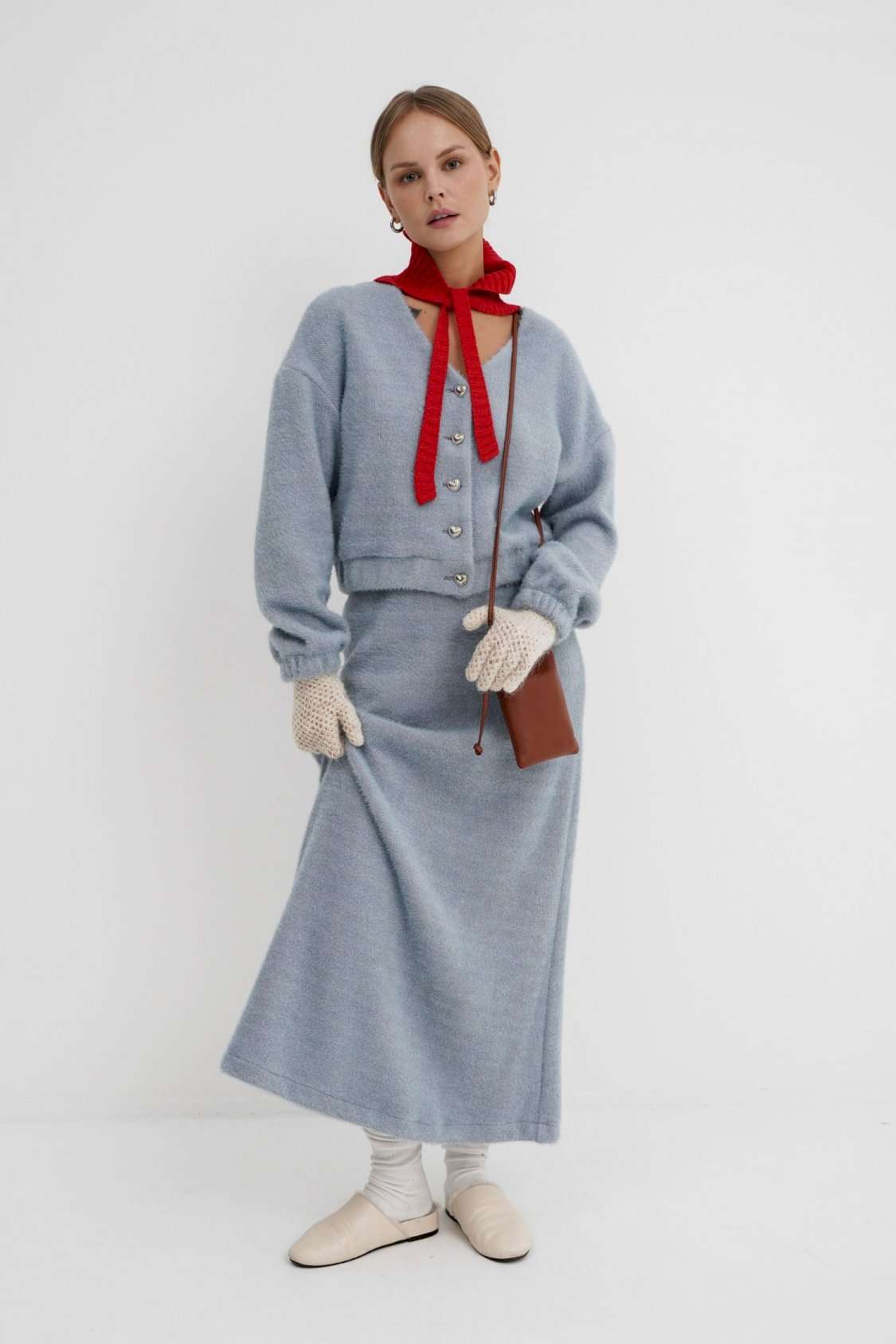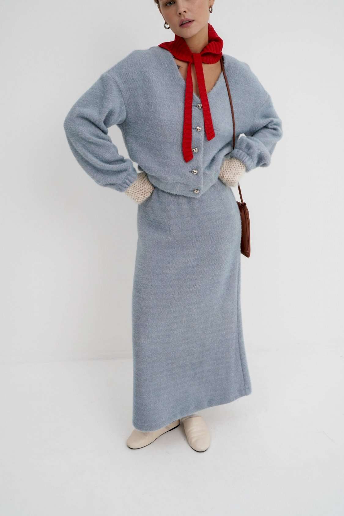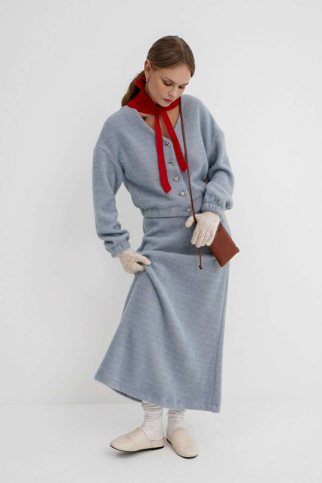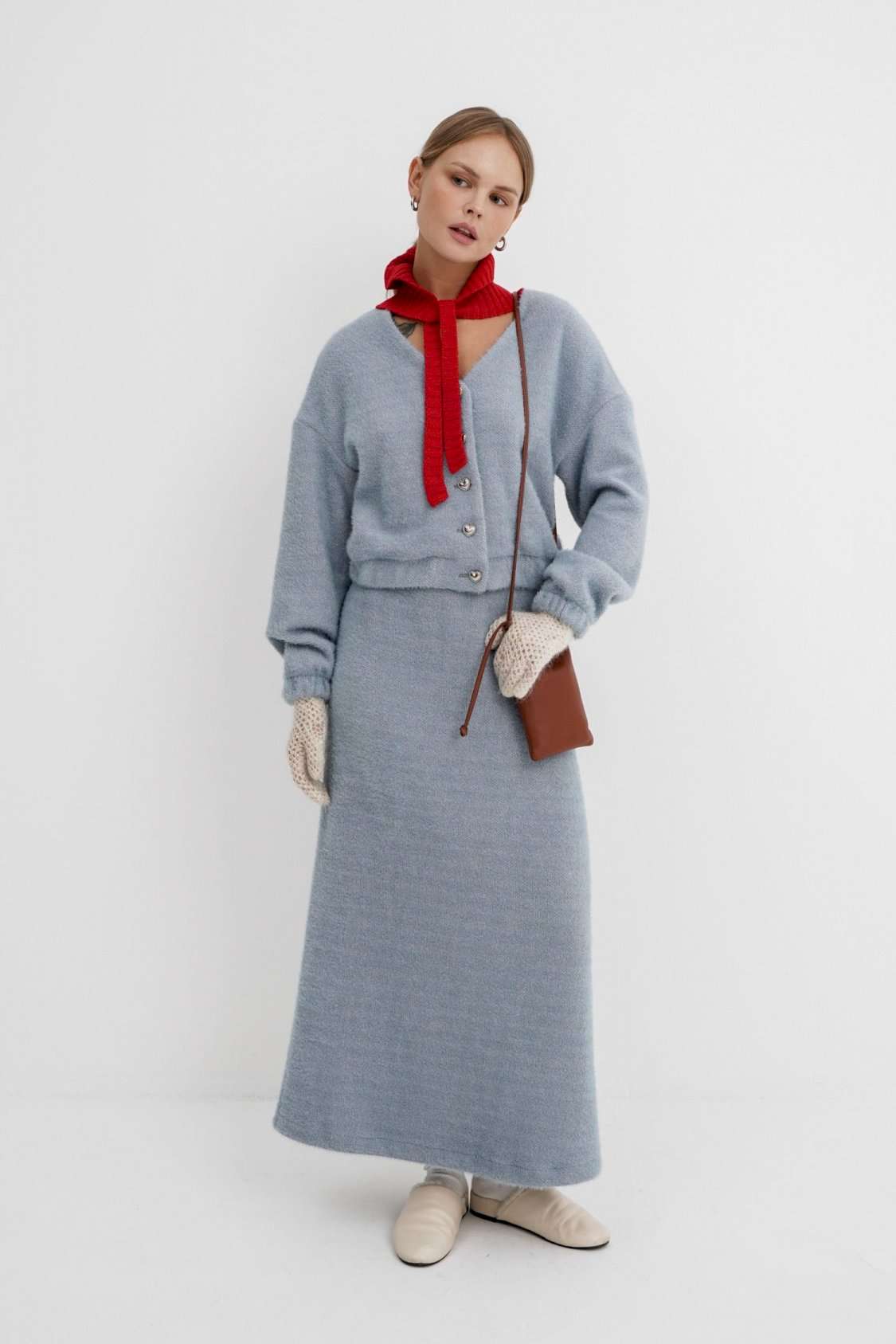 Костюм-двойка из укороченного бомбера и юбки из пушистой ткани. Детали: спущенная линия плеча, V-образный вырез горловины переда, застежка на петли и декоративные пуговицы, рукава и низ бомбера на резинке, подкладка. Юбка трапециевидного силуэта, пояс на резинке и без застежки, низ юбки с разрезом, без подкладки. Длина бомбера по спинке около 47 см в размерах 40-46 и около 50 см в размерах 48-52. Длина рукава со спущенным плечом около 47+13 см. Длина юбки по боковому шву с поясом около 92 см.