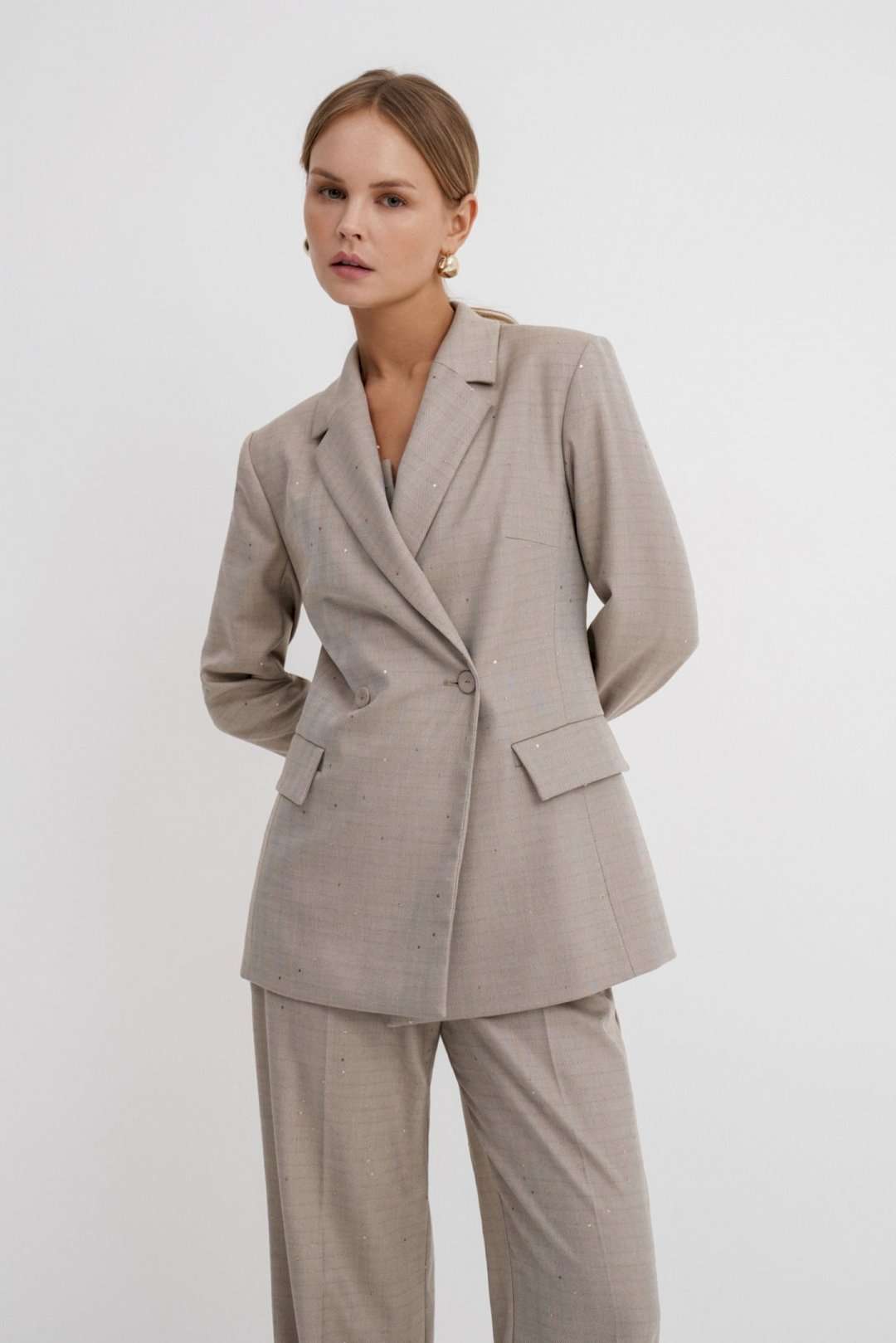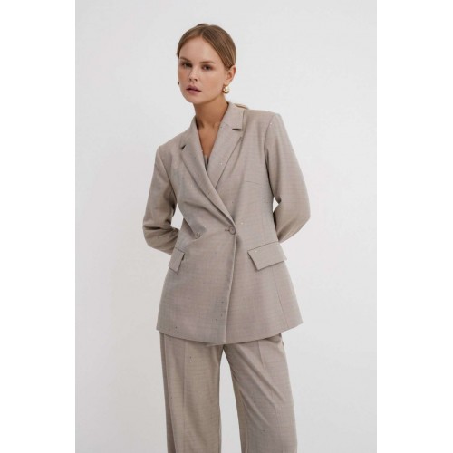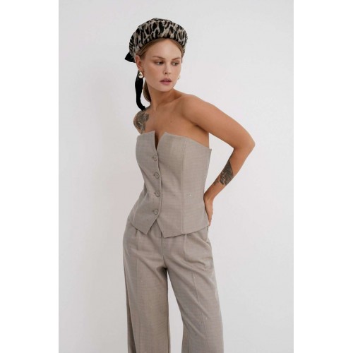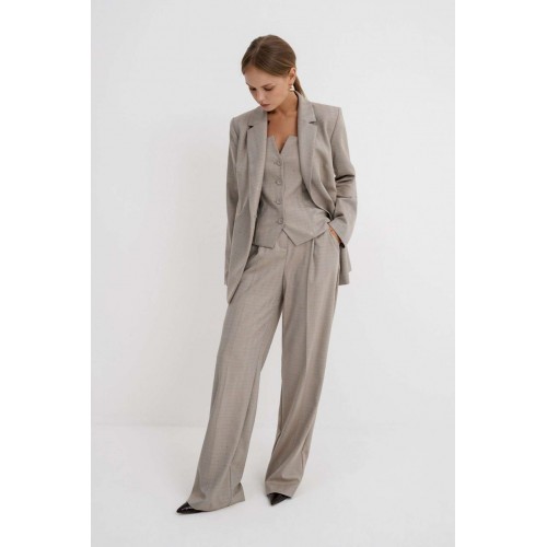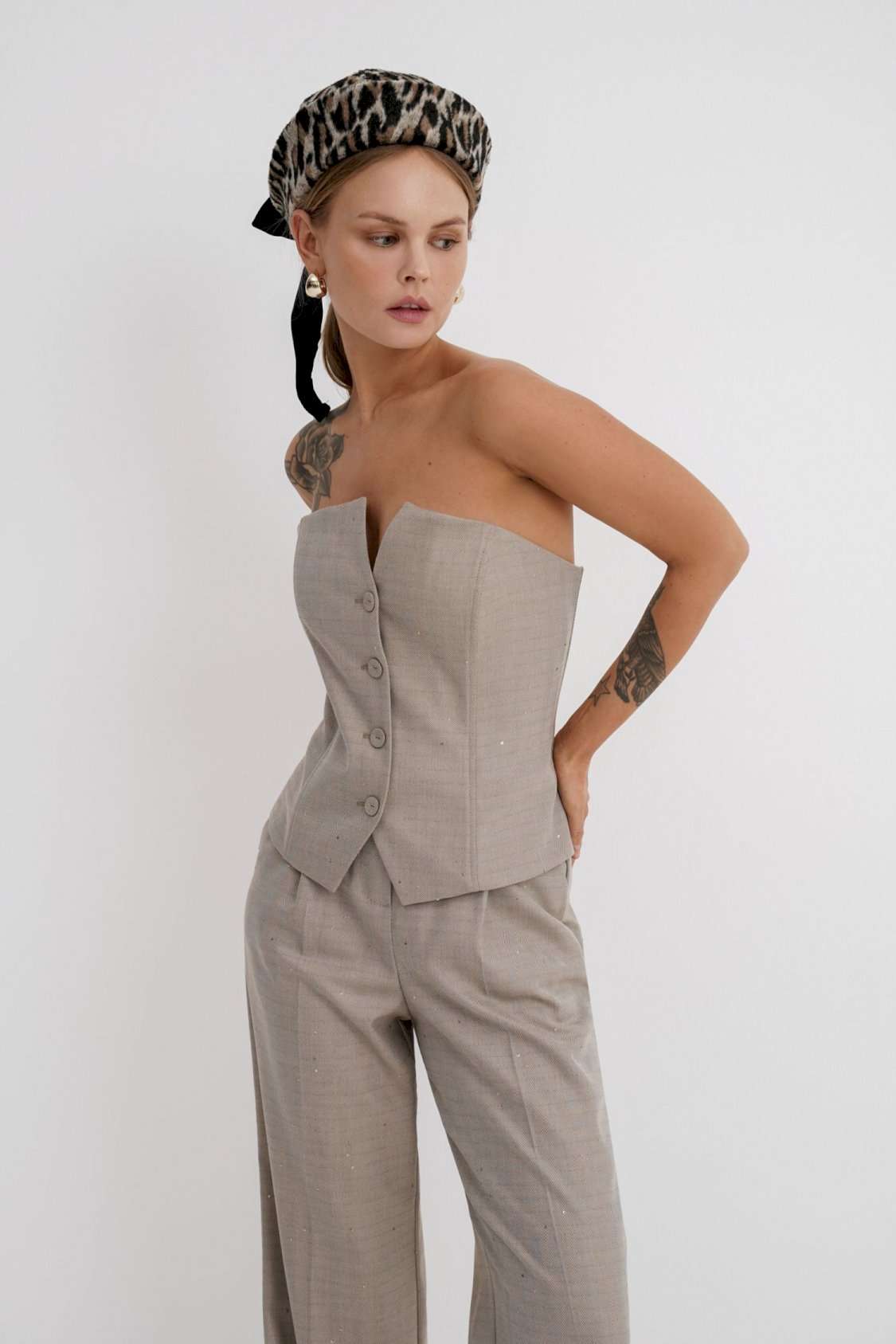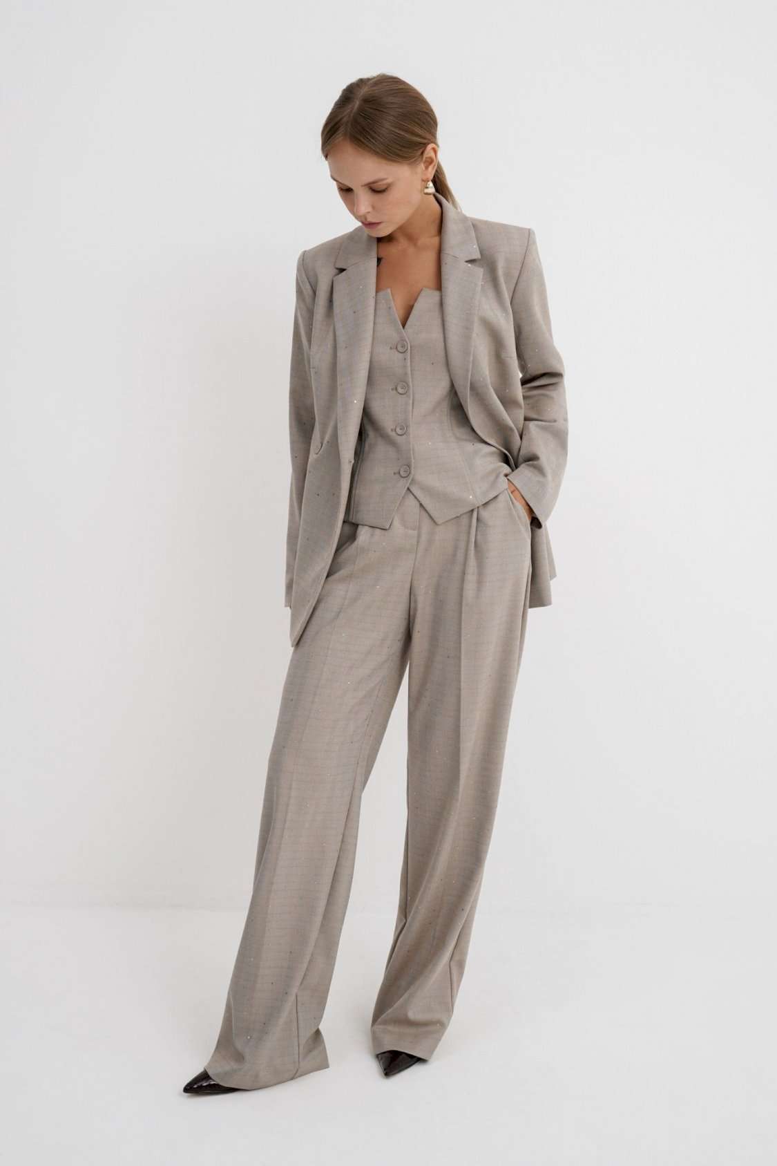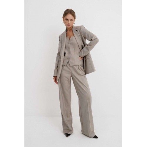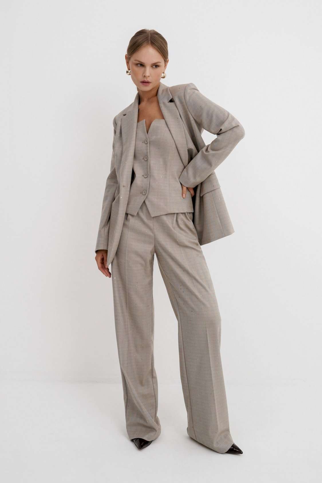 Текстильный костюм-тройка из классического приталенного жакета, топа-корсета и прямых широких брюк со стрелками. Детали: жакет с отрезными бочками и нагрудными вытачками, пиджачный воротник, прорезные карманы, двубортная застежка на петли и пуговицы, спинка со средним швом, втачные двухшовные рукава, жакет на подкладке. Топ-корсет прилегающего силуэта, рельефные швы с регилином, застежка по переду на петли и пуговицы, спинка с эластичной вставкой, фигурный низ. Брюки с высокой посадкой на притачном поясе со шлевками, застежка на молнию и пуговицу, боковые карманы, передние половины с заутюженными стрелками и двумя небольшими складками. Длина жакета по спинке около 68 см в размерах 40-46 и около 71 см в размерах 48-52. Длина рукава около 61 см. Длина топа по спинке около 27,5 см в размерах 40-46 и около 29 см в размерах 48-52. Длина брюк по боковому шву с поясом около 113 см в размерах 40-46 и около 114,5 см в размерах 48-52. Длина по внутреннему шву около 82 см.