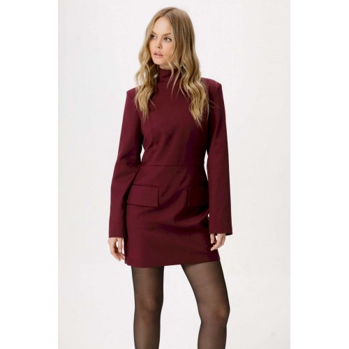 Текстильное платье длины мини. Детали: полуприлегающий силуэт, отрезное по линии талии, перед с талиевыми вытачками, функциональные карманы с фигурными клапанами, спинка со средним швом и талиевыми вытачками, втачные одношовные рукава, воротник-стойка, застёжка на потайную молнию в среднем шве спинки, платье на подкладке. Длина платья по спинке в размерах 40-46 около 81 см, в размерах 48-52 около 85 см, длина рукава около 62 см