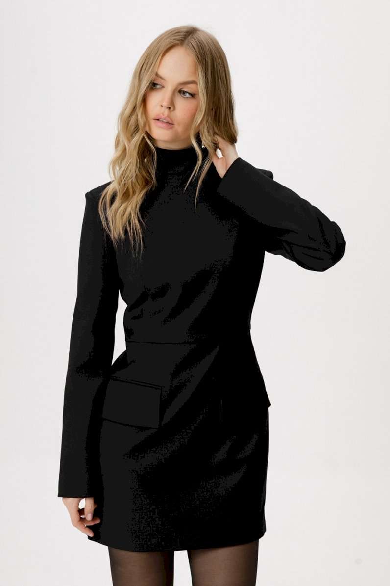Текстильное платье длины мини. Детали: полуприлегающий силуэт, отрезное по линии талии, перед с талиевыми вытачками, функциональные карманы с фигурными клапанами, спинка со средним швом и талиевыми вытачками, втачные одношовные рукава, воротник-стойка, застёжка на потайную молнию в среднем шве спинки, платье на подкладке. Длина платья по спинке в размерах 40-46 около 81 см, в размерах 48-52 около 85 см, длина рукава около 62 см