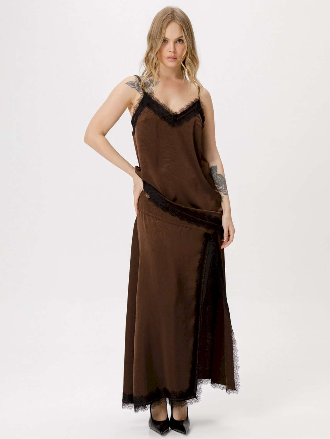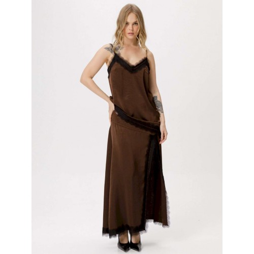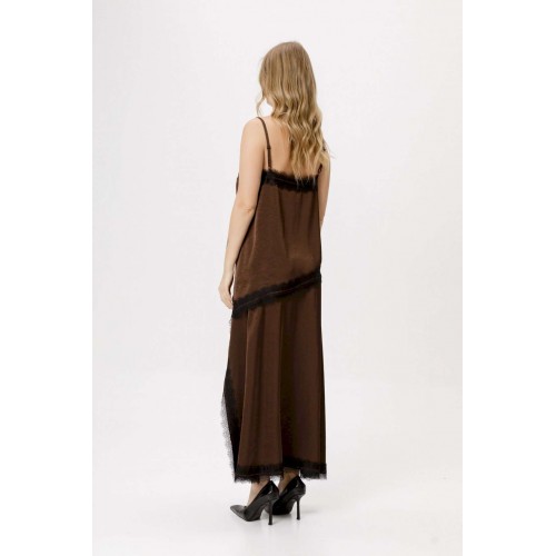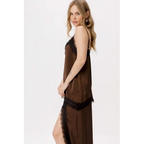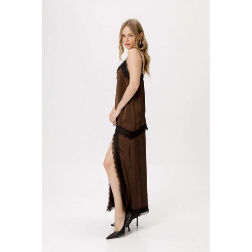Костюм-двойка в бельевом стиле из асимметричного топа и юбки с кружевом. Детали: топ прямого силуэта, нагрудные вытачки, фигурный вырез по переду, отделка кружевом по верхнему и нижнему краю топа, регулируемые бретели. Юбка А-силуэта, асимметричная кокетка по переду, разрез с кружевной отделкой, юбка на обтачке с молнией по боку.