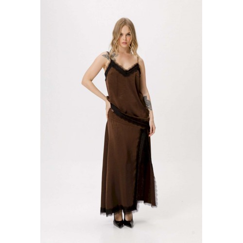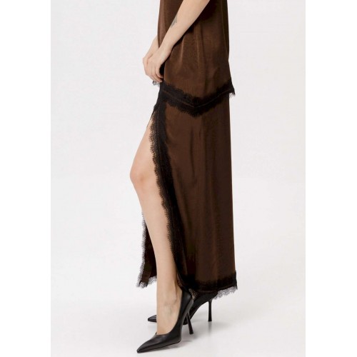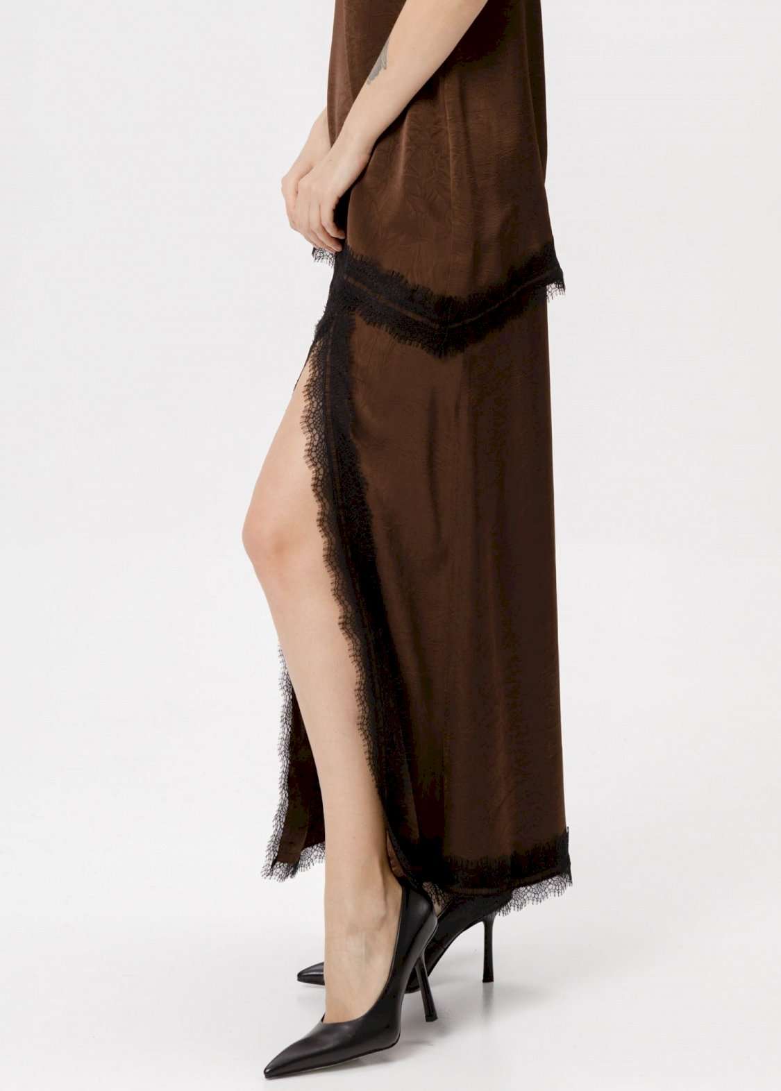 Асимметричная юбка-макси в бельевом стиле с кружевом. Детали: А-силуэт, асимметричная кокетка по переду, разрез с кружевной отделкой, юбка на обтачке с молнией в боковом шве. Длина изделия по боковому шву около 92 см