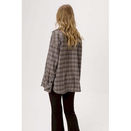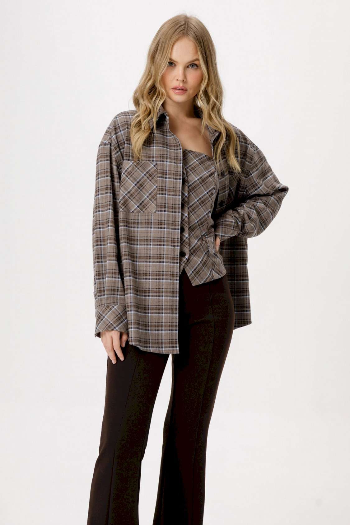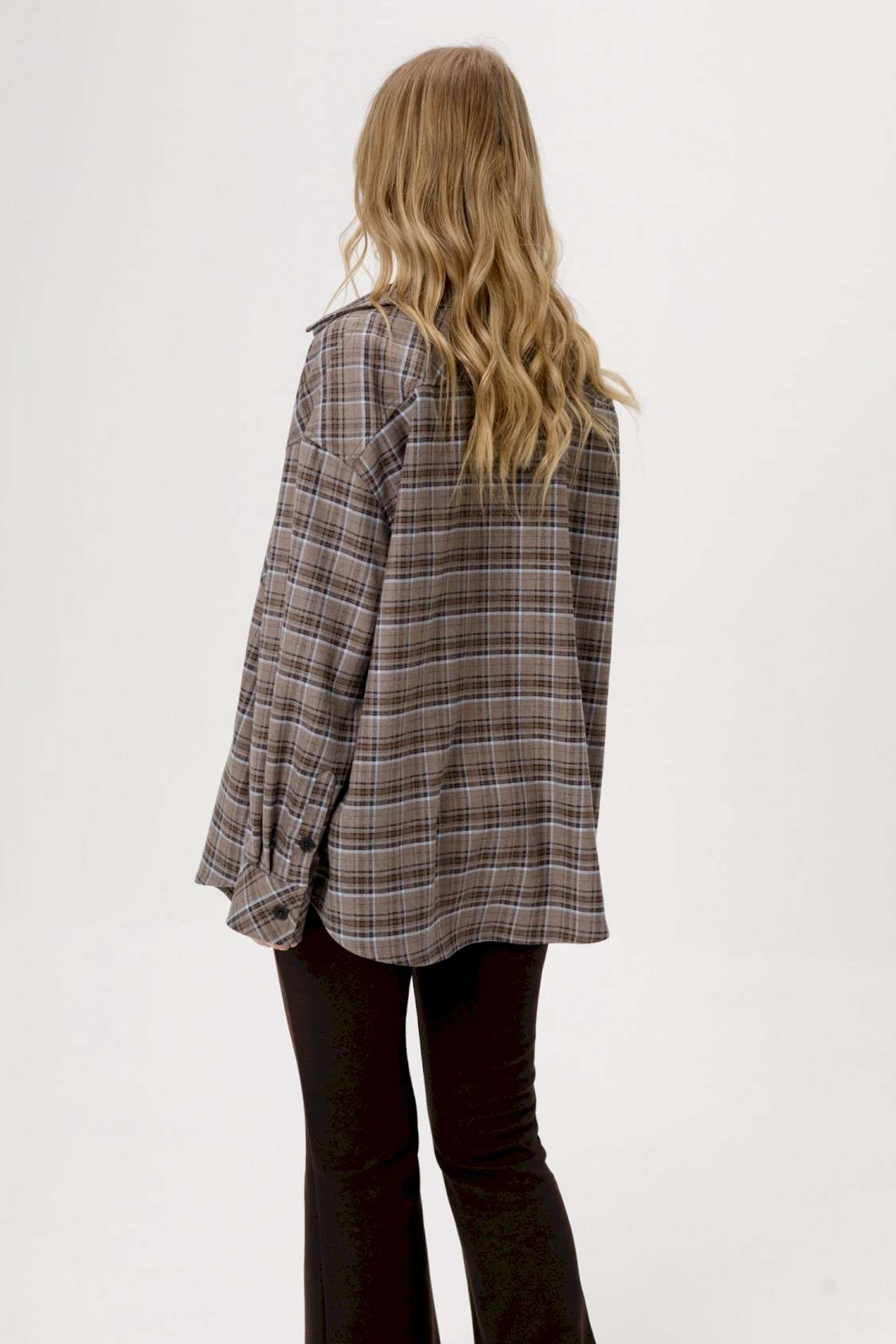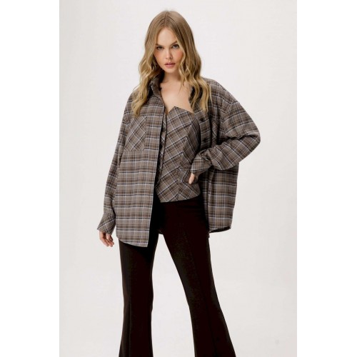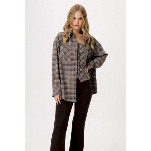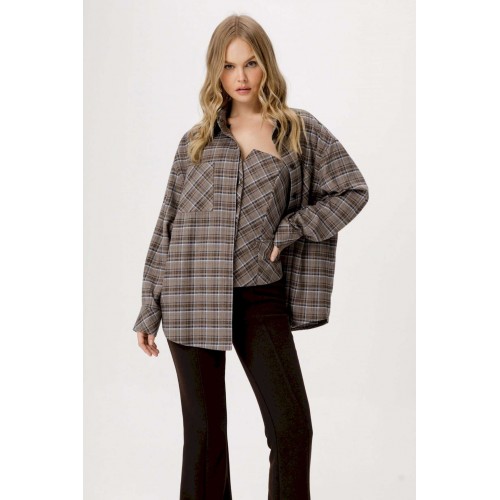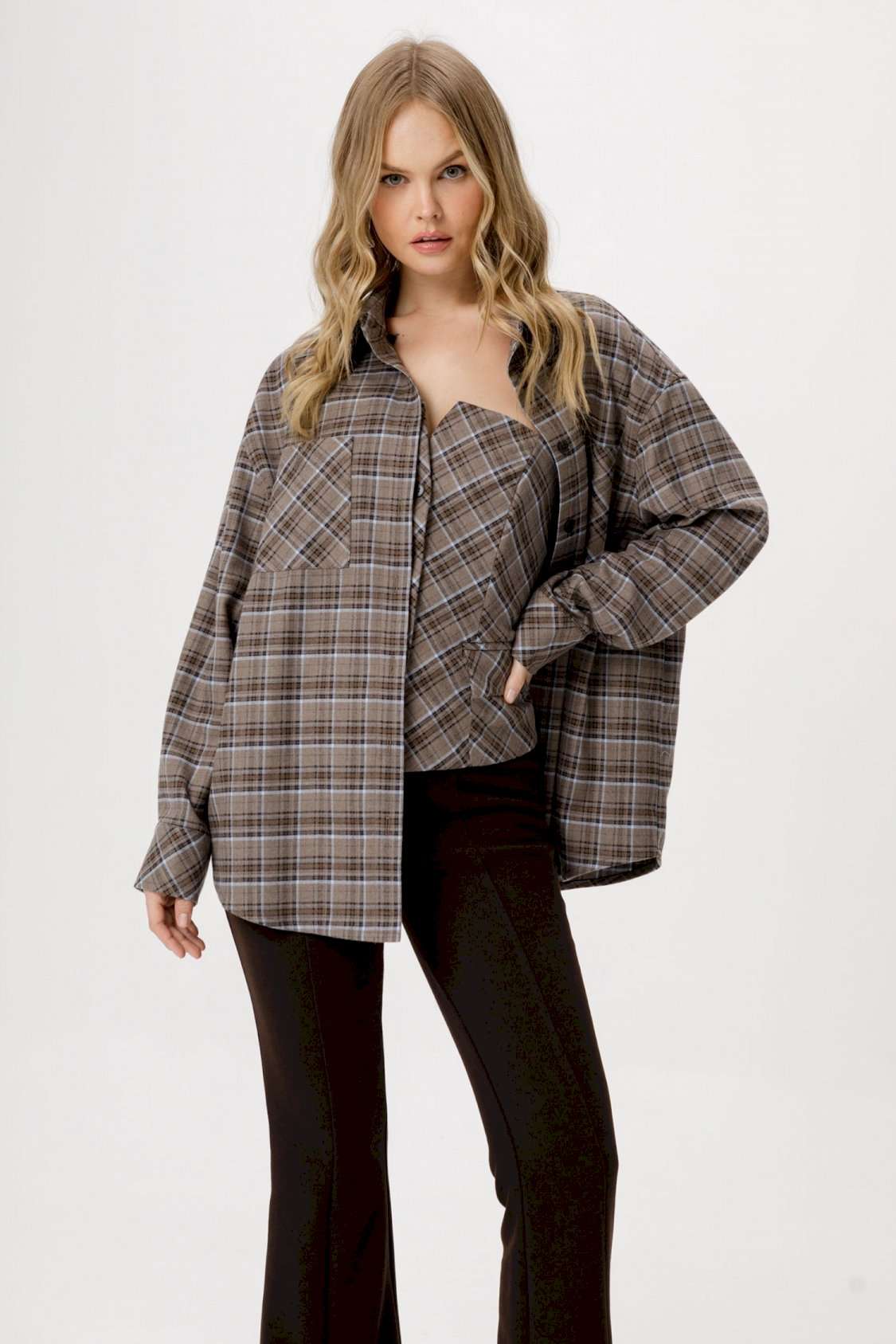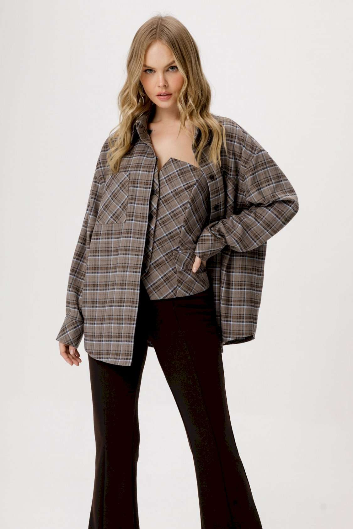 Оверсайз рубашка в клетку. Детали: прямой силуэт, свободный покрой, рубашечный воротник, застежка на петли и пуговицы, перед с накладными карманами, спинка с кокеткой, рукава длинные с манжетами. Длина по спинке около 69 в размерах 40-46. Длина по спинке около 71см в размерах 48-52. Длина рукавов со спущенным плечом около 62+9 см.