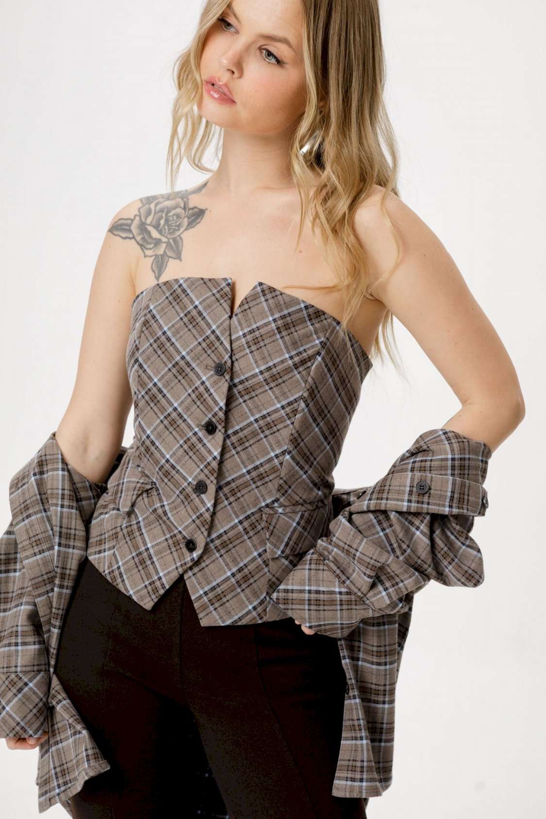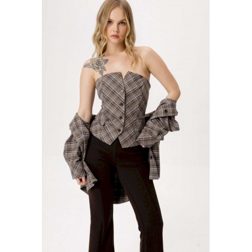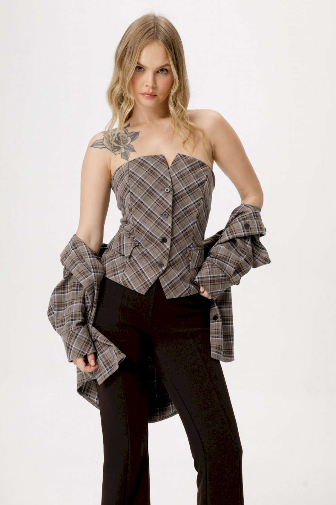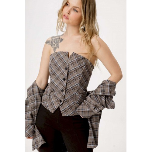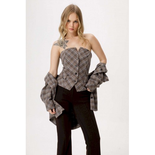 Топ-корсет в клетку. Детали: прилегающий силуэт, рельефные швы с регилином, застежка по переду на петли и пуговицы, спинка с эластичной вставкой, фигурный низ. Длина по спинке около 27,5 см в размерах 40-46. Длина по спинке около 29 см в размерах 48-52