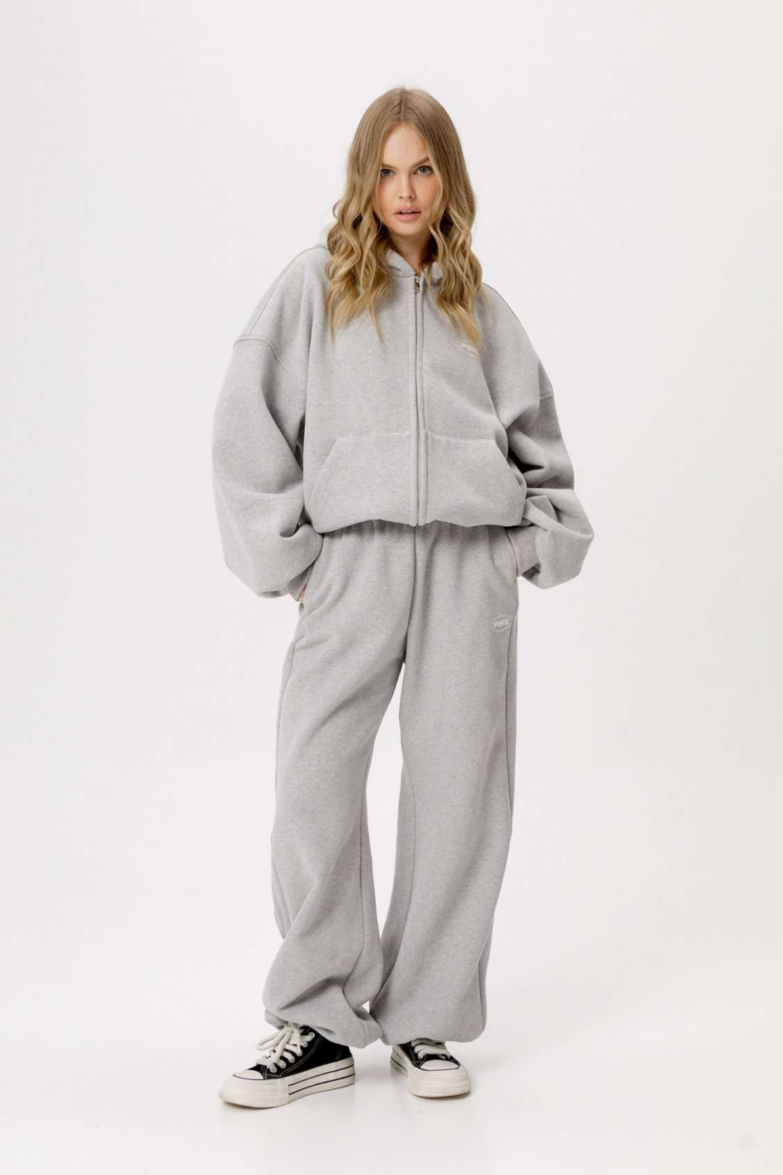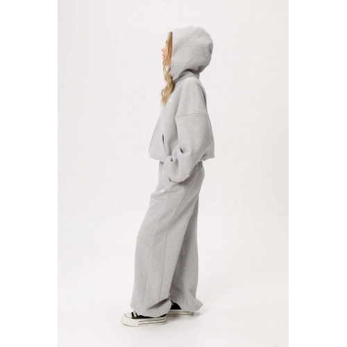Спортивные свободные брюки из трехнитки с начесом. Детали: брюки широкие с рельефными швами и регулировкой по низу, боковые карманы. На передней части нанесен небольшой фирменный логотип. Длина по боковому шву около 110 см. Длина по внутреннему шву около 80 см.