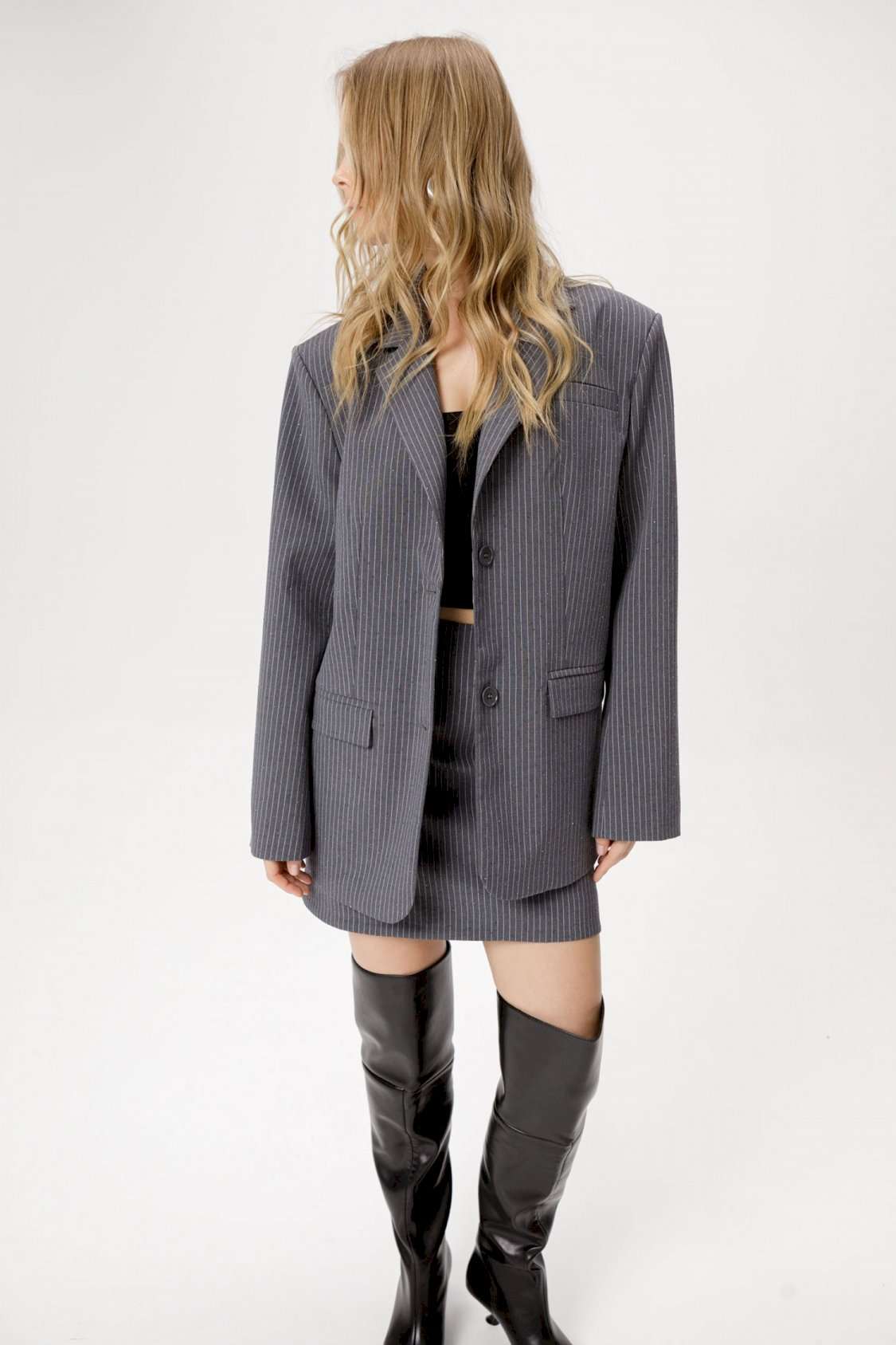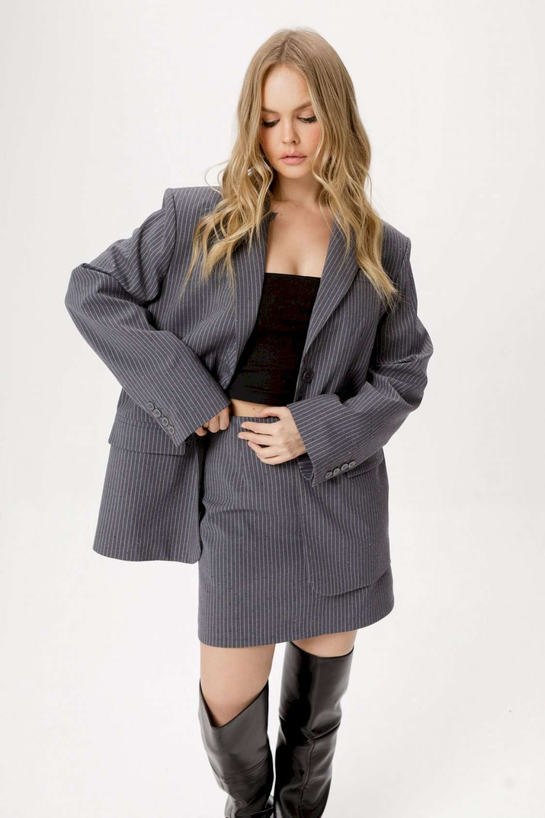 Мини-юбка из текстильной ткани в тонкую полоску со стразами. Детали: юбка с высокой посадкой, талиевые вытачки, застежка сзади на потайную молнию, на подкладке. Длина по боковому шву около 43 см в размерах 40-46. Длина по боковому шву около 46 см в размерах 48-52.