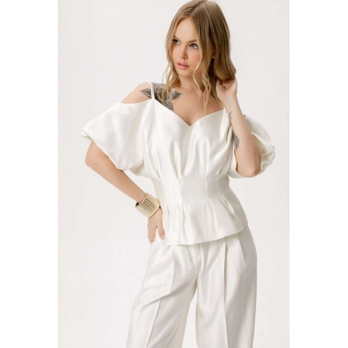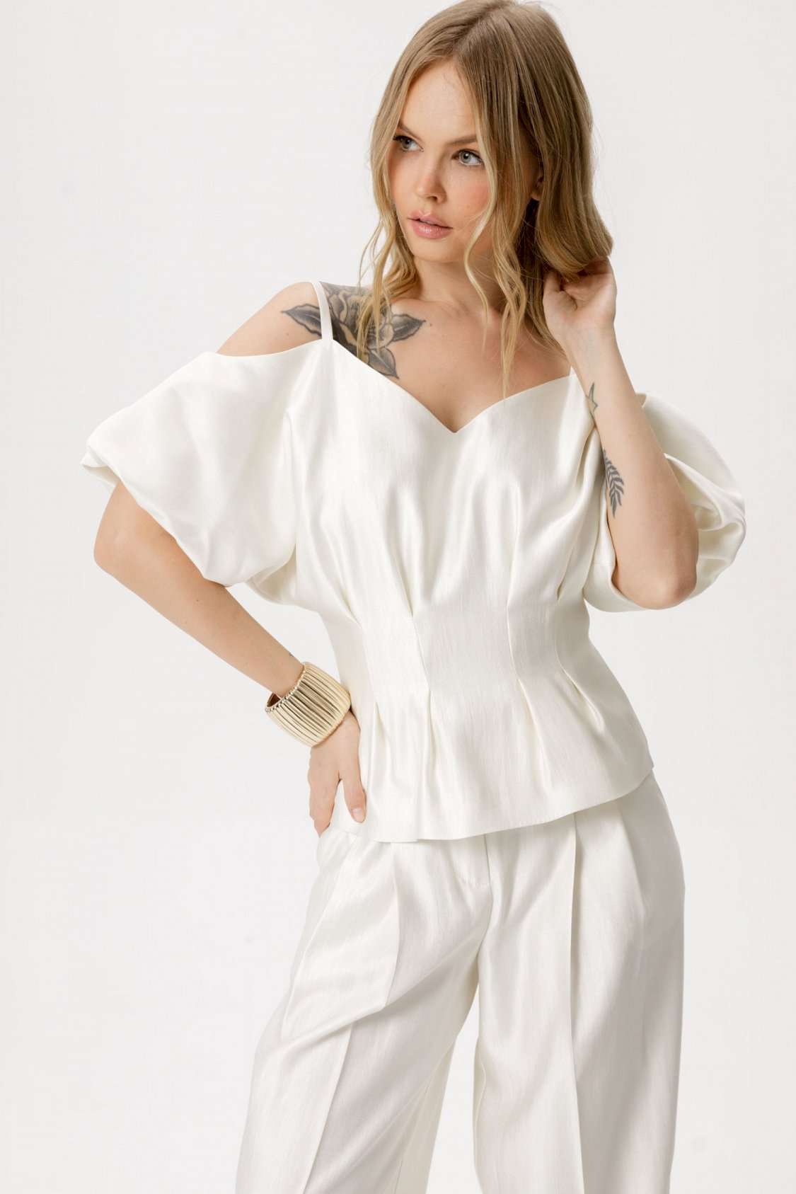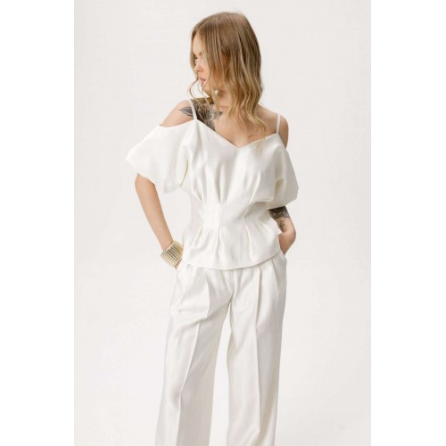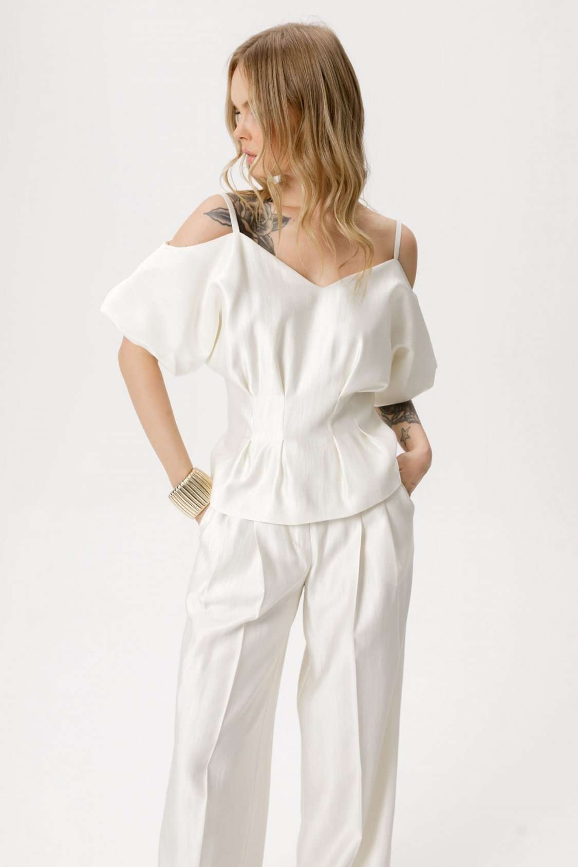 Приталенная блуза со складками. Детали: приталенный силуэт, застроченные складки по линии талии, V-образный вырез переда и спинки, рукава короткие цельнокроеные с вырезом по плечу, застежка на потайную молнию по спинке, на подкладке. Длина от бретели до низа по переду около 56 см в размерах 40-46. Длина от бретели до низа по переду около 58,5 см в размерах 48-52.