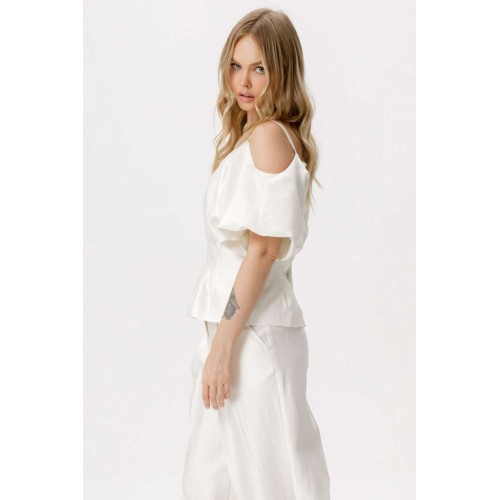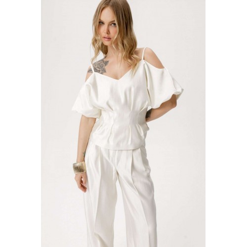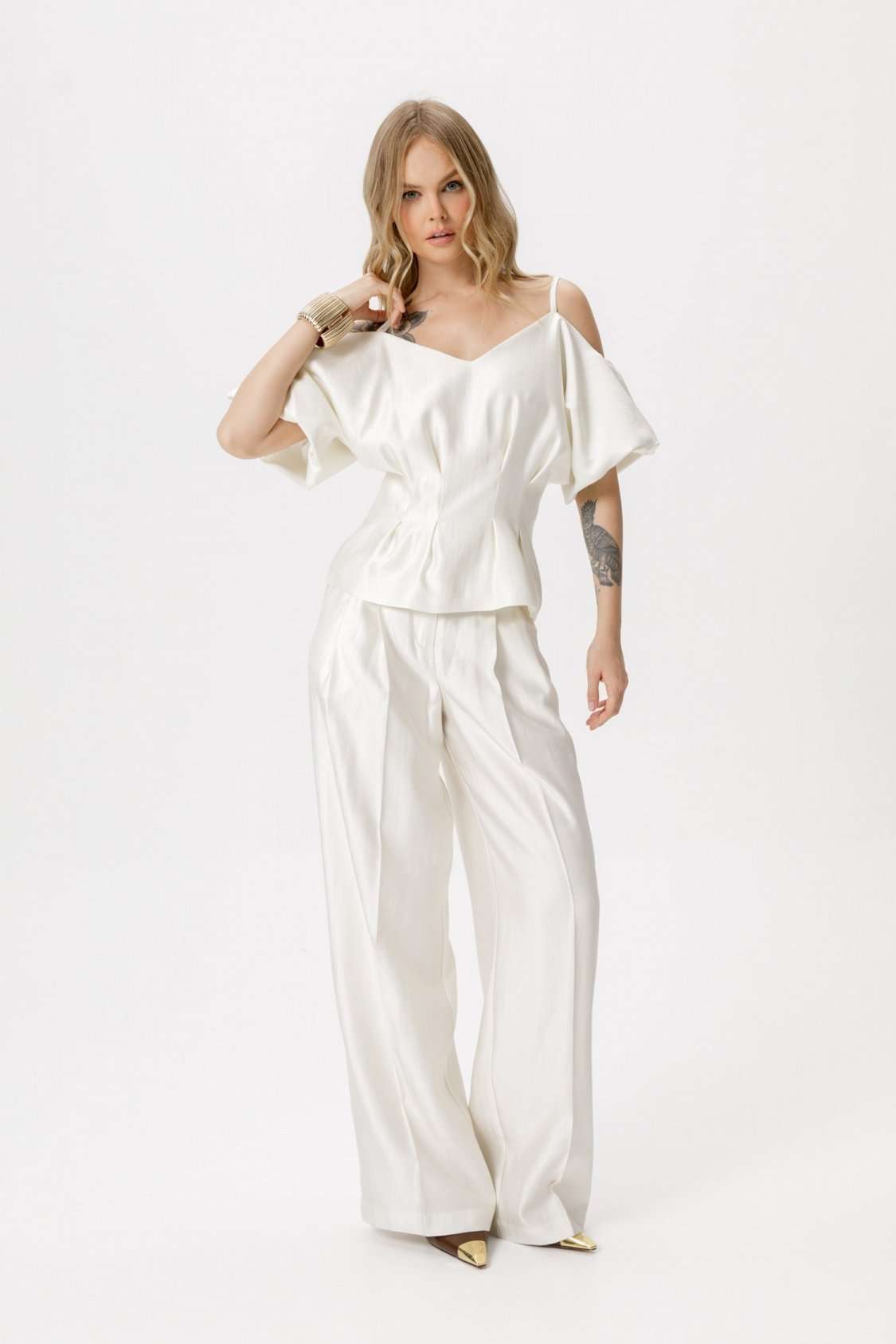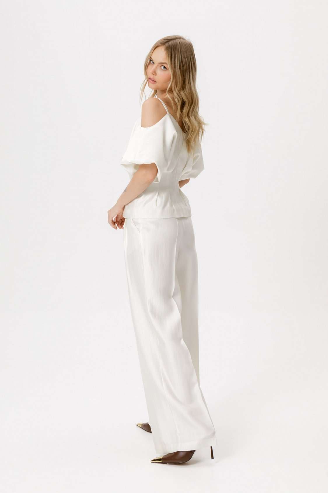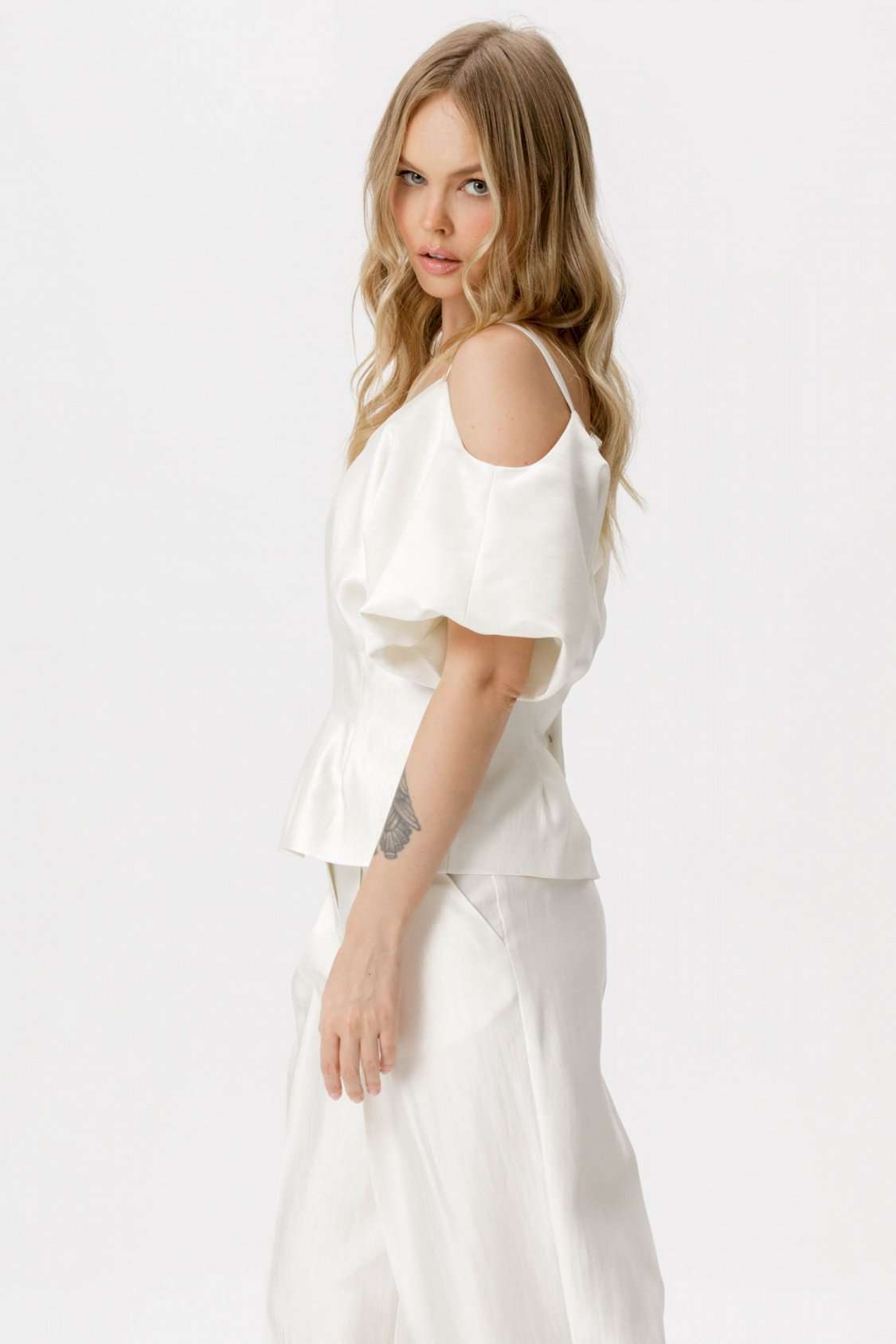 Приталенная блуза со складками. Детали: приталенный силуэт, застроченные складки по линии талии, V-образный вырез переда и спинки, рукава короткие цельнокроеные с вырезом по плечу, застежка на потайную молнию по спинке, на подкладке. Длина от бретели до низа по переду около 56 см в размерах 40-46. Длина от бретели до низа по переду около 58,5 см в размерах 48-52.