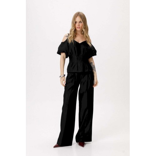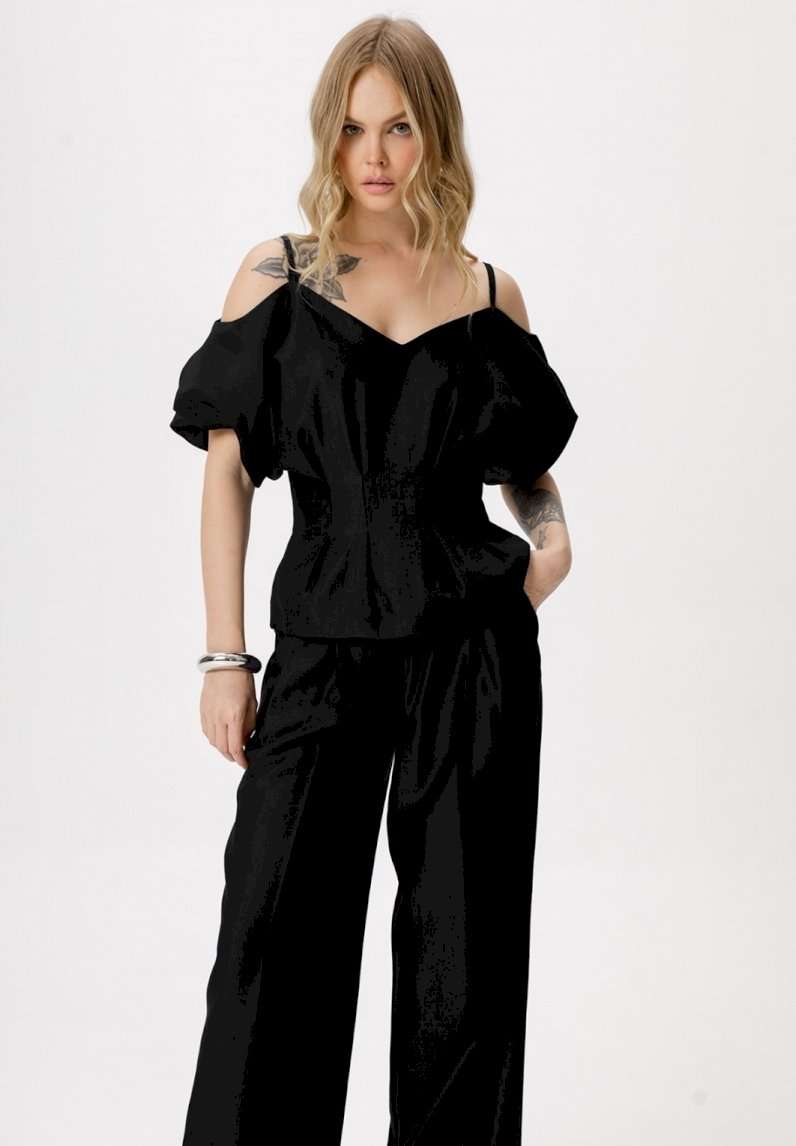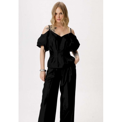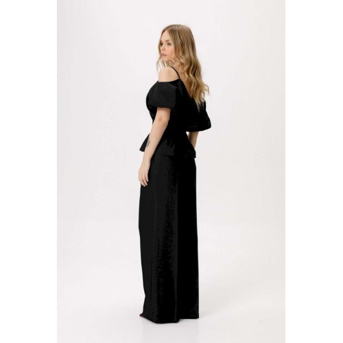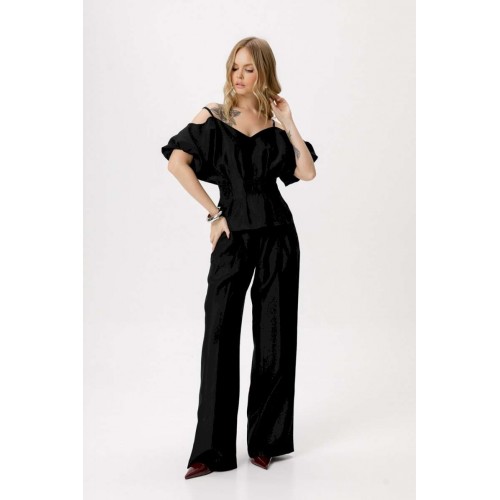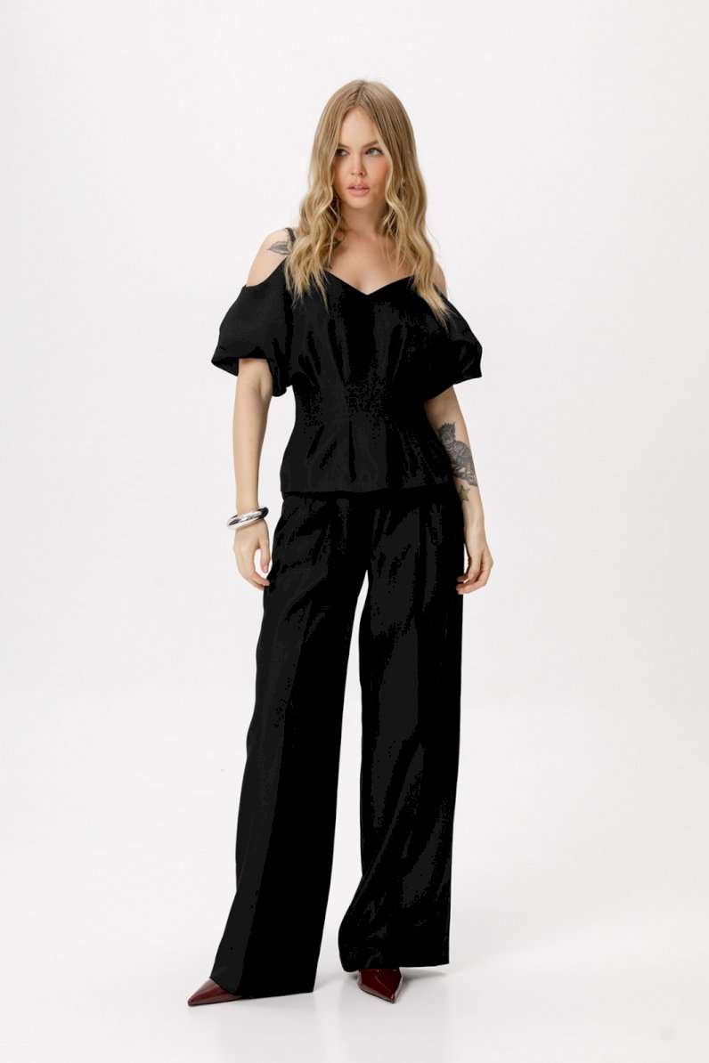 Приталенная блуза со складками. Детали: приталенный силуэт, застроченные складки по линии талии, V-образный вырез переда и спинки, рукава короткие цельнокроеные с вырезом по плечу, застежка на потайную молнию по спинке, на подкладке. Длина от бретели до низа по переду около 56 см в размерах 40-46. Длина от бретели до низа по переду около 58,5 см в размерах 48-52.