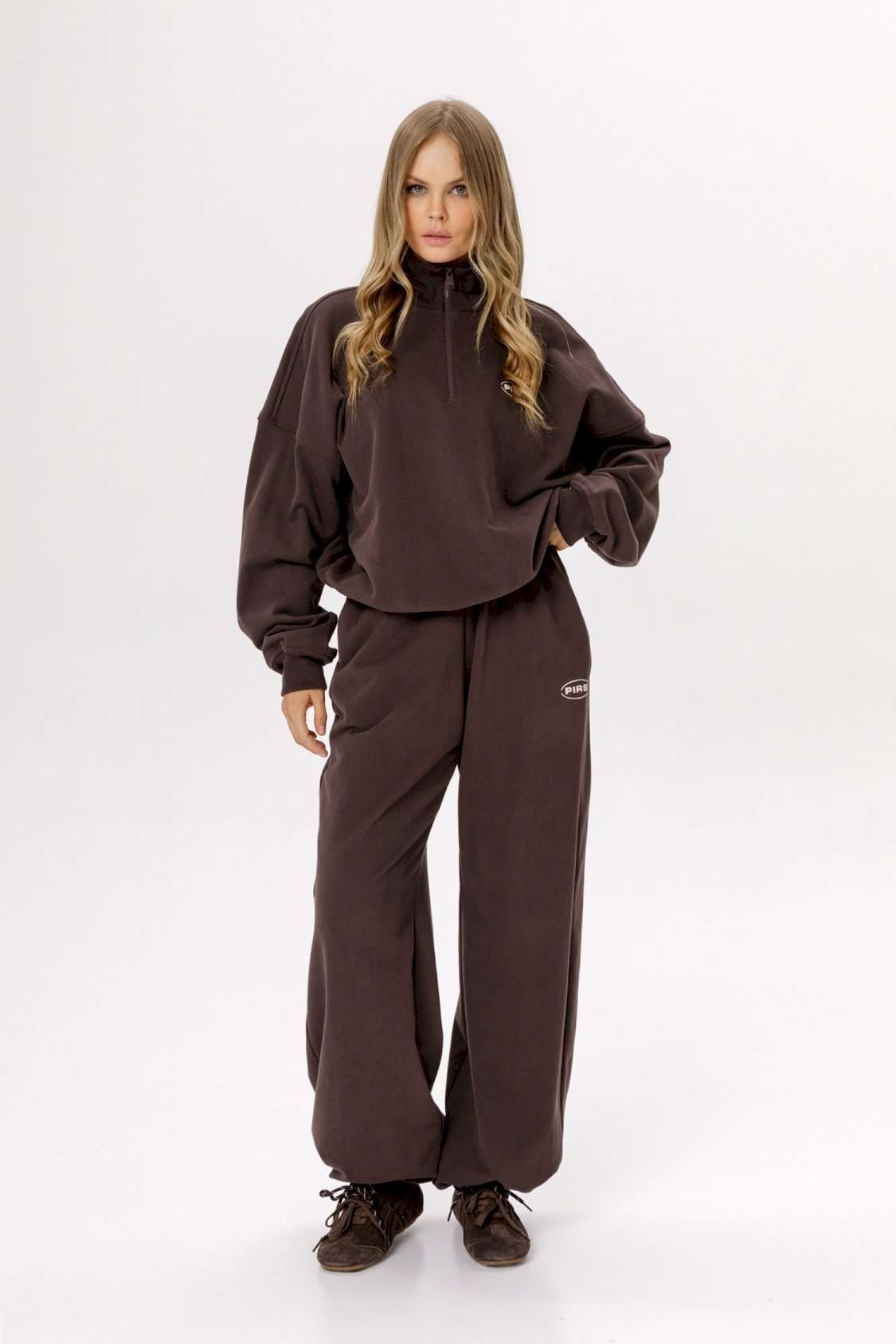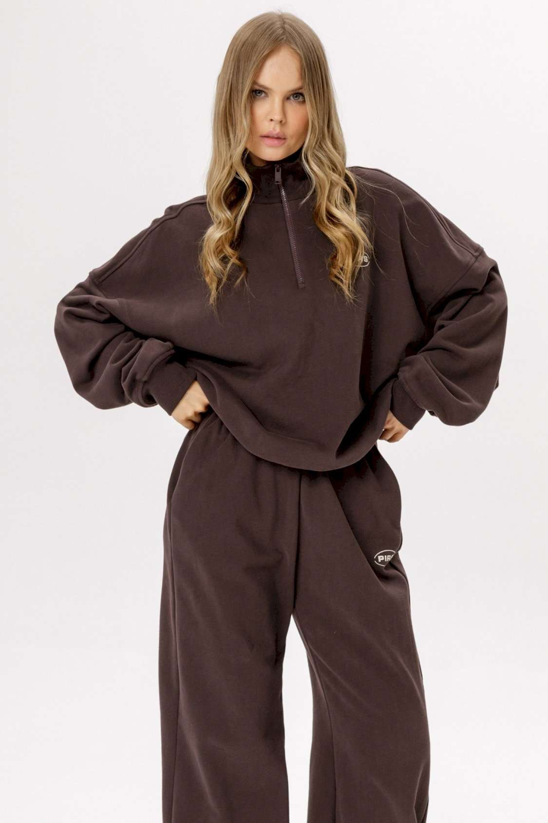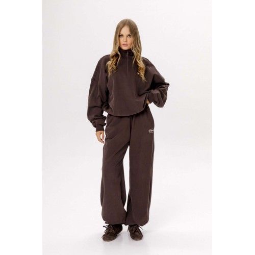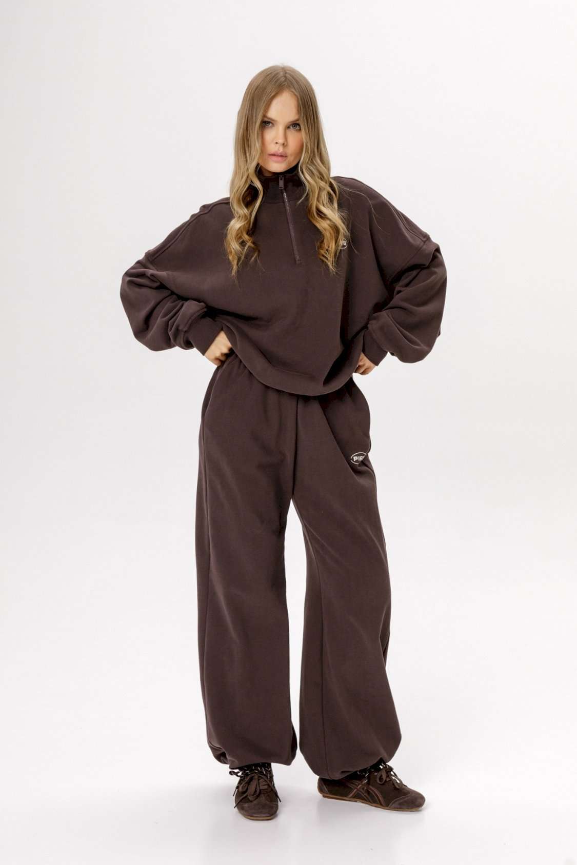 Хлопковая оверсайз олимпийка с молнией (приобрести брюки с фото можно по арт. 6398). Детали: олимпийка свободного покроя, воротник-стойка с молнией, небольшой фирменный логотип.