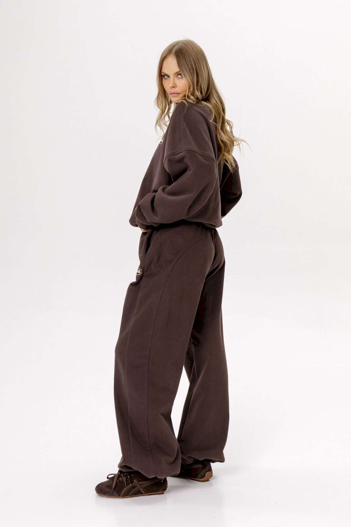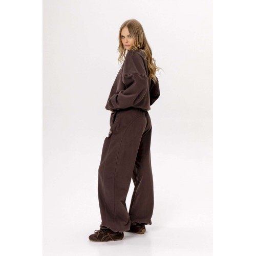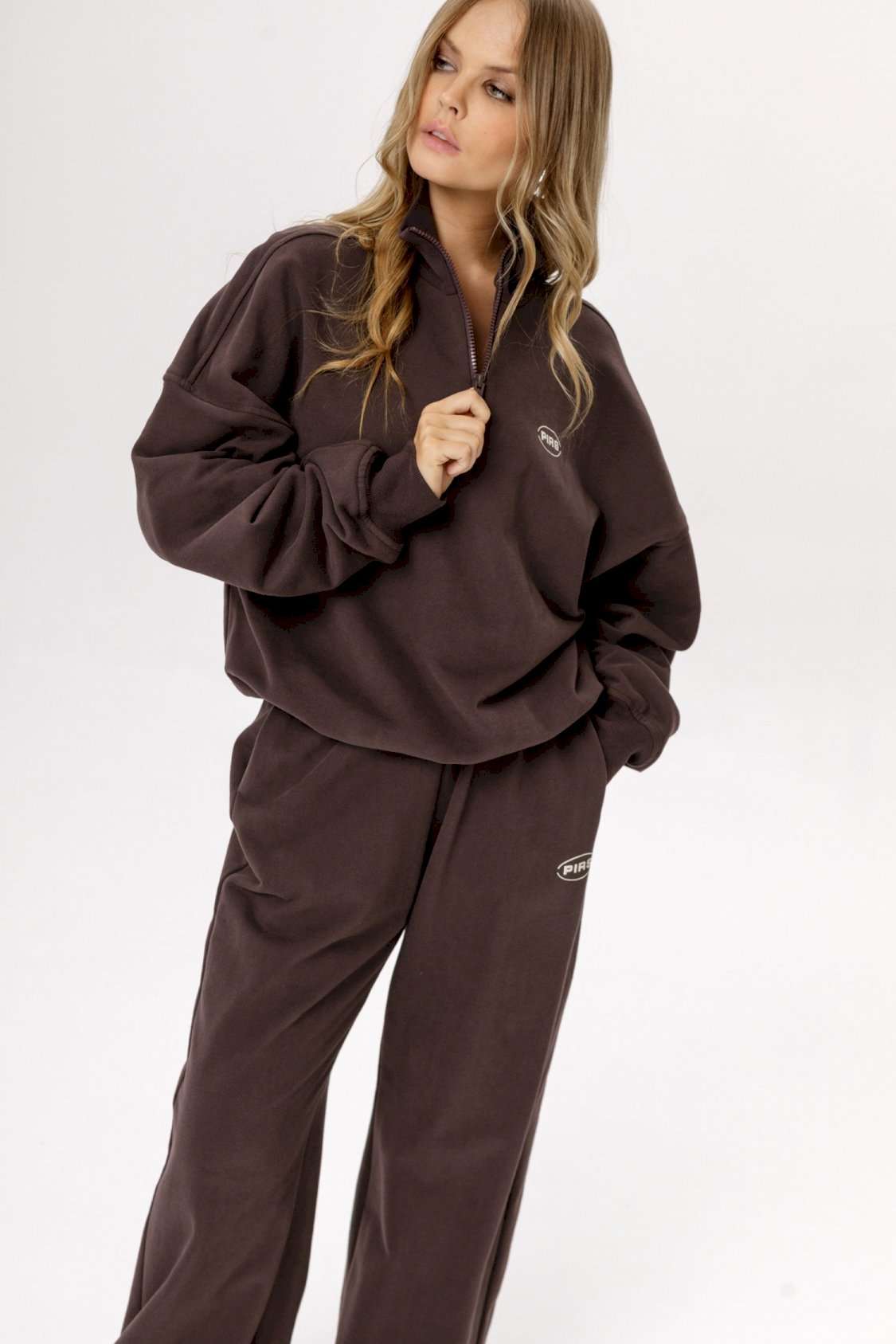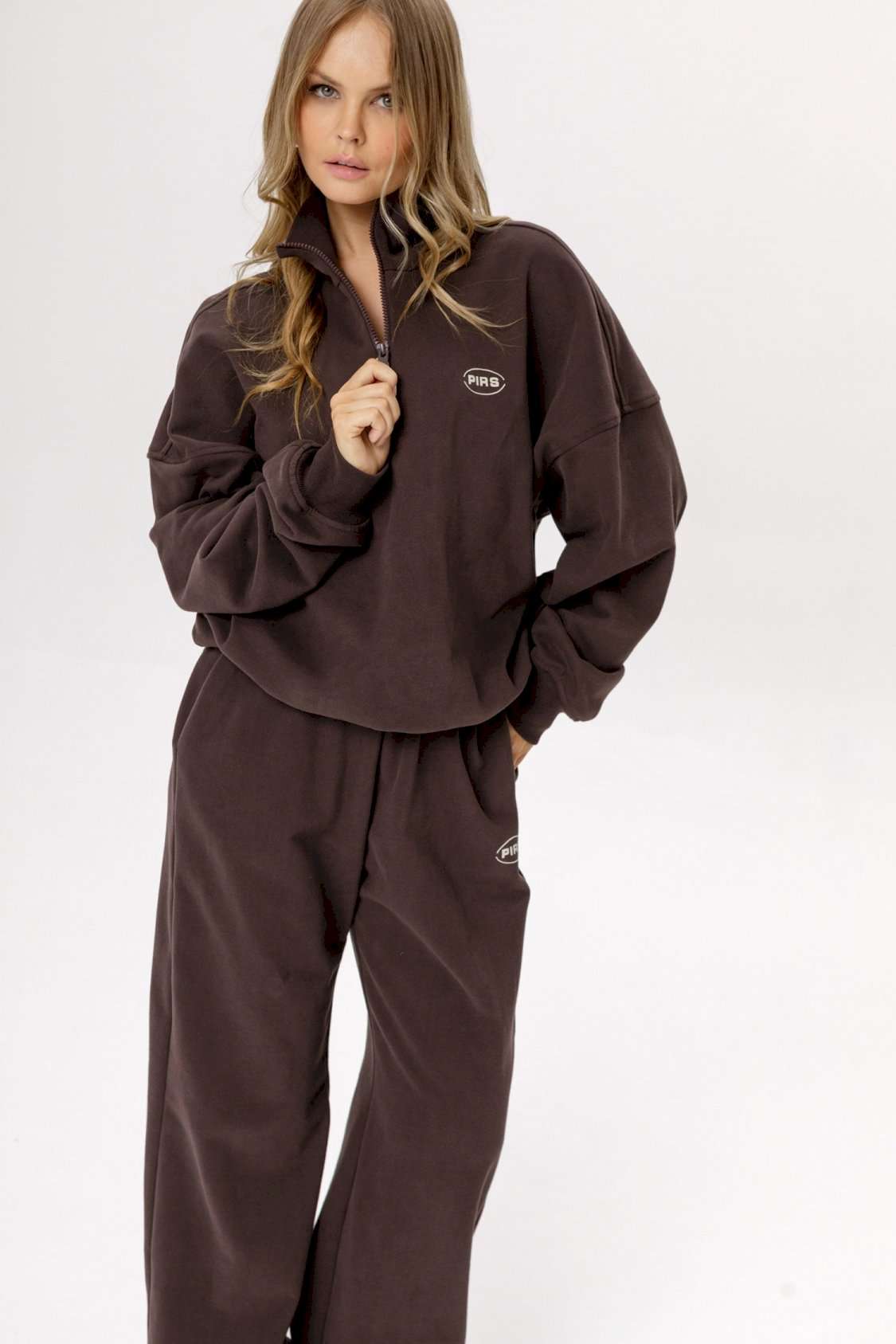 Хлопковая оверсайз олимпийка с молнией (приобрести брюки с фото можно по арт. 6398). Детали: олимпийка свободного покроя, воротник-стойка с молнией, небольшой фирменный логотип.
