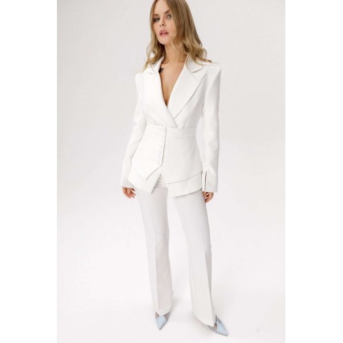 Комплект-двойка из приталенного жакета с разрезами по рукавам и съёмной баски (приобрести брюки с фото можно по арт. 6343, приобрести жакет с фото без баски 6539). Детали: полуприлегающий силуэт, втачные двухшовные рукава, смещённая застёжка на одну петлю и пуговицу. Баска приталенная, рельефные швы, функциональные карманы, центральная застёжка на петли и пуговицы, хлястик-регулятор по спинке. Длина жакета по спинке около 65 см в размерах 40-46, около 68 см в размерах 48-52, длина рукава около 62 см. Длина баски около 22,5 см в размерах 40-52.