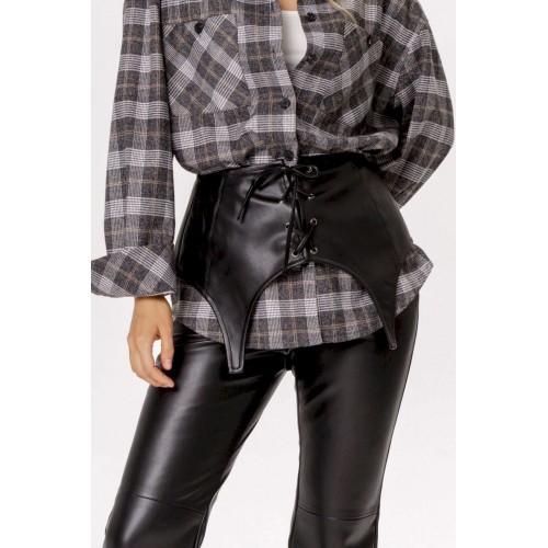 Кожаная баска с акцентным низом и шнуровкой (приобрести брюки с фото можно по арт. 6522, приобрести рубашку с фото можно по арт. 6549). Детали: баска с фигурным низом и застежкой-шнуровкой, на подкладке. Застежка-шнуровка позволяет идеально подогнать баску по фигуре и носить её любой стороной