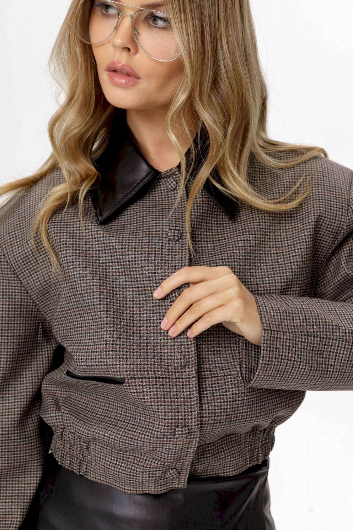 Укороченный жакет в клетку с воротником из экокожи (приобрести шорты с фото можно по арт. 6564). Детали: прямой силуэт, свободный покрой, расширенная линия плеч, воротник выполнен из экокожи, пояс на резинке, застежка на кнопки, рукава длинные с высокими обтачками по низу, функциональные карманы, спинка со средним швом, куртка на подкладке. Длина по спинке с поясом около 46 см в размерах 40-46 и около 50 см в размерах 48-52, длина рукава около 57 см+ расширенное плечо.
