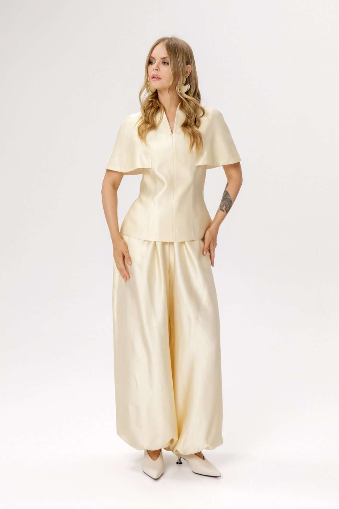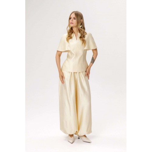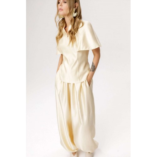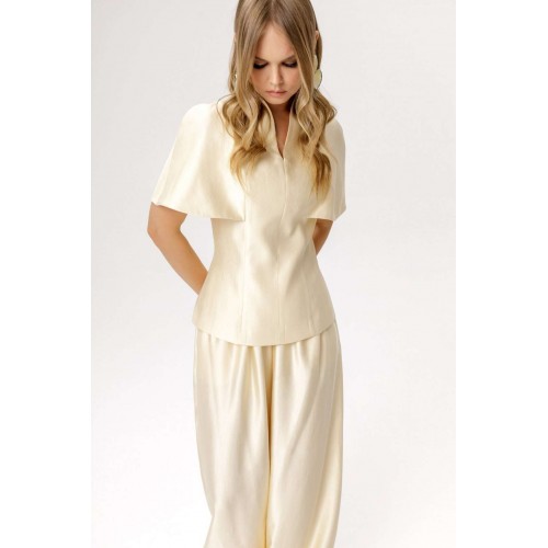 Блуза приталенного силуэта и цельнокроеной пелериной (приобрести брюки с фото можно по арт. 6671). Детали: прилегающий силуэт, талиевые вытачки по переду и спинке, цельнокроеная горловина стойка, потайная молния в среднем шве спинки, блуза на подкладке. Длина блузы по спинке около 62 см в размерах 40-46, около 65 см в 48-52. (приобрести брюки с фото можно по арт. 6671)