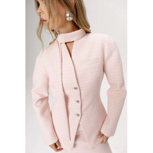 Приталенный твидовый жакет с акцентными плечами и съемным шарфиком (приобрести брюки с фото можно по арт. 6557, приобрести юбку с фото можно по арт. 6612). Детали: полуприлегающий силуэт, цельнокроеная стойка, застежка на петли и пуговицы, имитация нагрудного кармана, рукава фигурные длинные с верхним швом и объемными плечевыми накладками. Длина жакета по спинке со стойкой около 67 см в размерах 40-46 и около 69,5 см в размерах 48-52. Длина рукава около 63 см. (приобрести брюки с фото можно по арт. 6557, приобрести юбку с фото можно по арт. 6612)