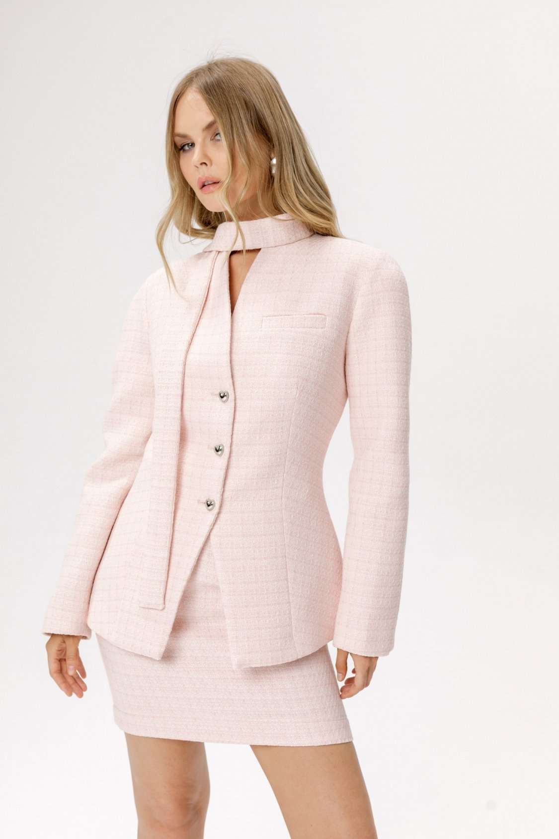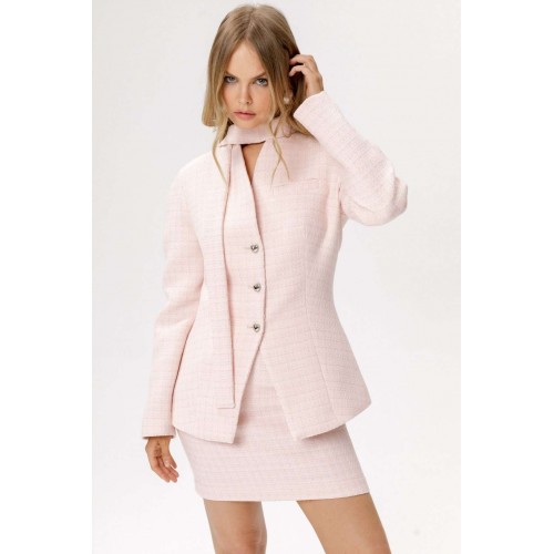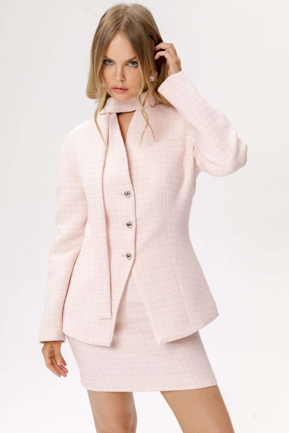 Мини-юбка из твида с высокой посадкой (приобрести жакет с фото можно по арт. 6604). Детали: прямой силуэт, юбка на притачном поясе, талиевые вытачки, застежка сзади на потайную молнию, на подкладке. Длина по боковому шву с поясом около 46 см в размерах 40-46 и около 49 см в размерах 48-52 см (приобрести жакет с фото можно по арт. 6604)